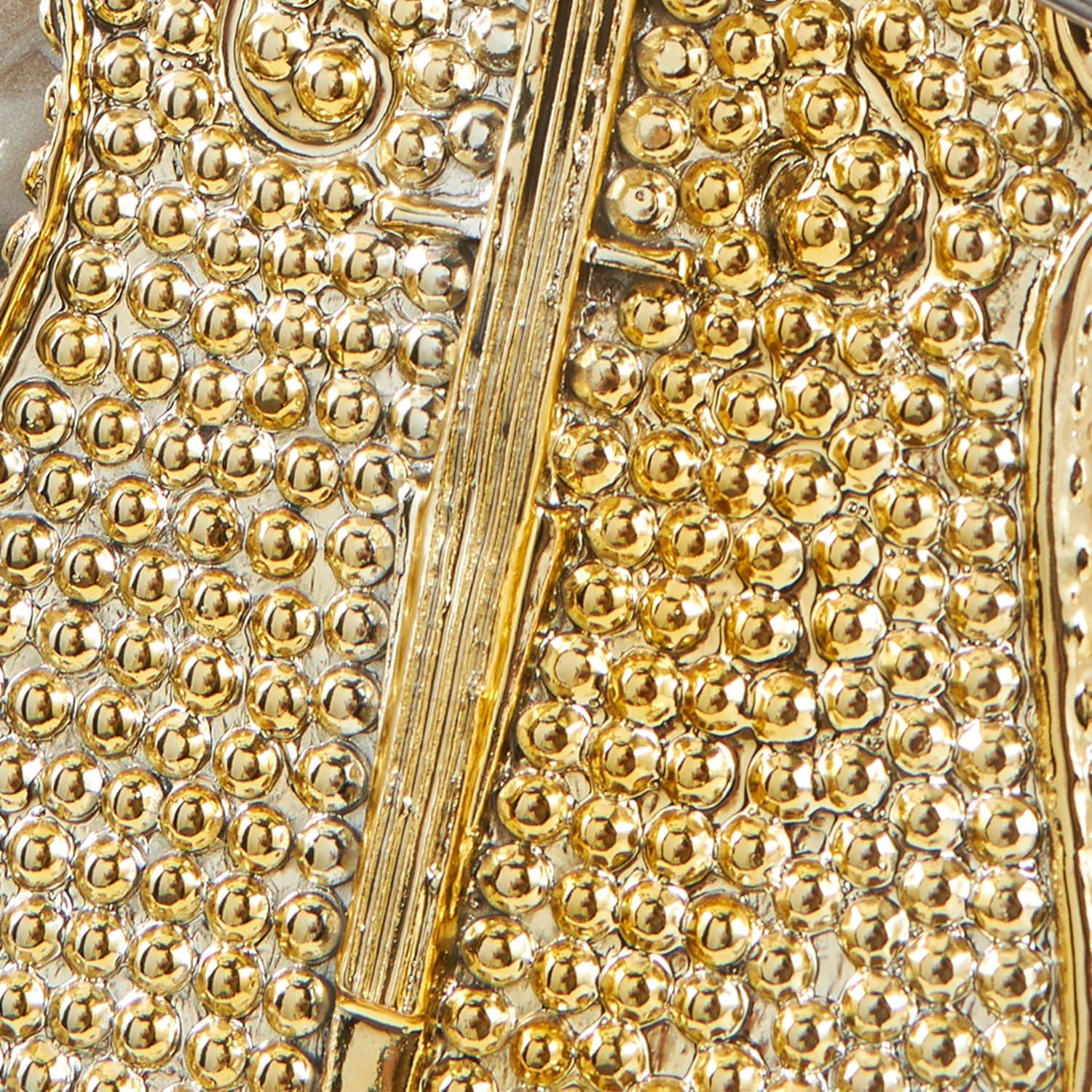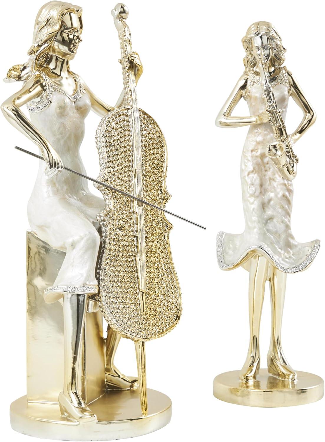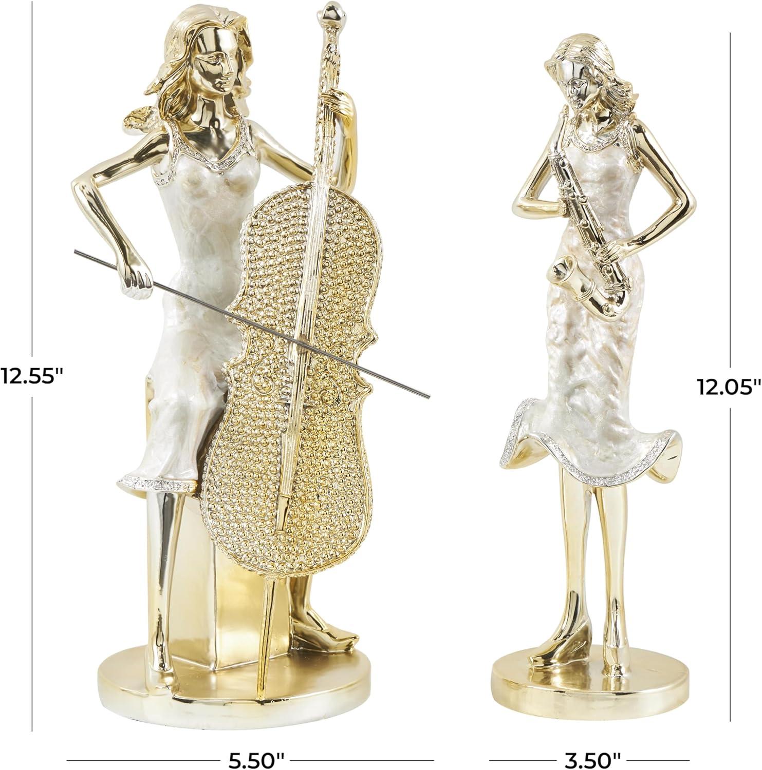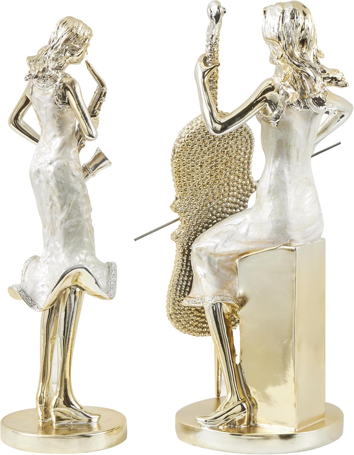 This eclectic set of 2 accent statues is molded and shaped from resin material and applied with a polished finish for an enchanting and timeless addition to your decor. The flowing curves and graceful lines of these polished gold home decor figurines evoke a sense of movement and musicality, featuring crystalized saxophone and gold accordion accents. Wipe clean with a dry cloth. Show off your personality in the home and style this musician set of 2 home decor statues on a mantel, bookshelf, or console table with stacked books and a vase with fresh florals. Designed with felt or rubber stoppers at the base that prevent scratching furniture and table tops, as well as sliding around. This item ships in 1 carton. Please note that this item is for decorative use only. Resin sculpture makes a great gift for any occasion. Suitable for indoor use only. This item ships fully assembled in one piece. This gold colored resin statue comes as a set of 2. Eclectic style.