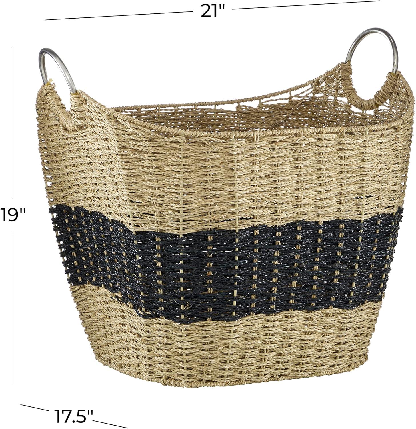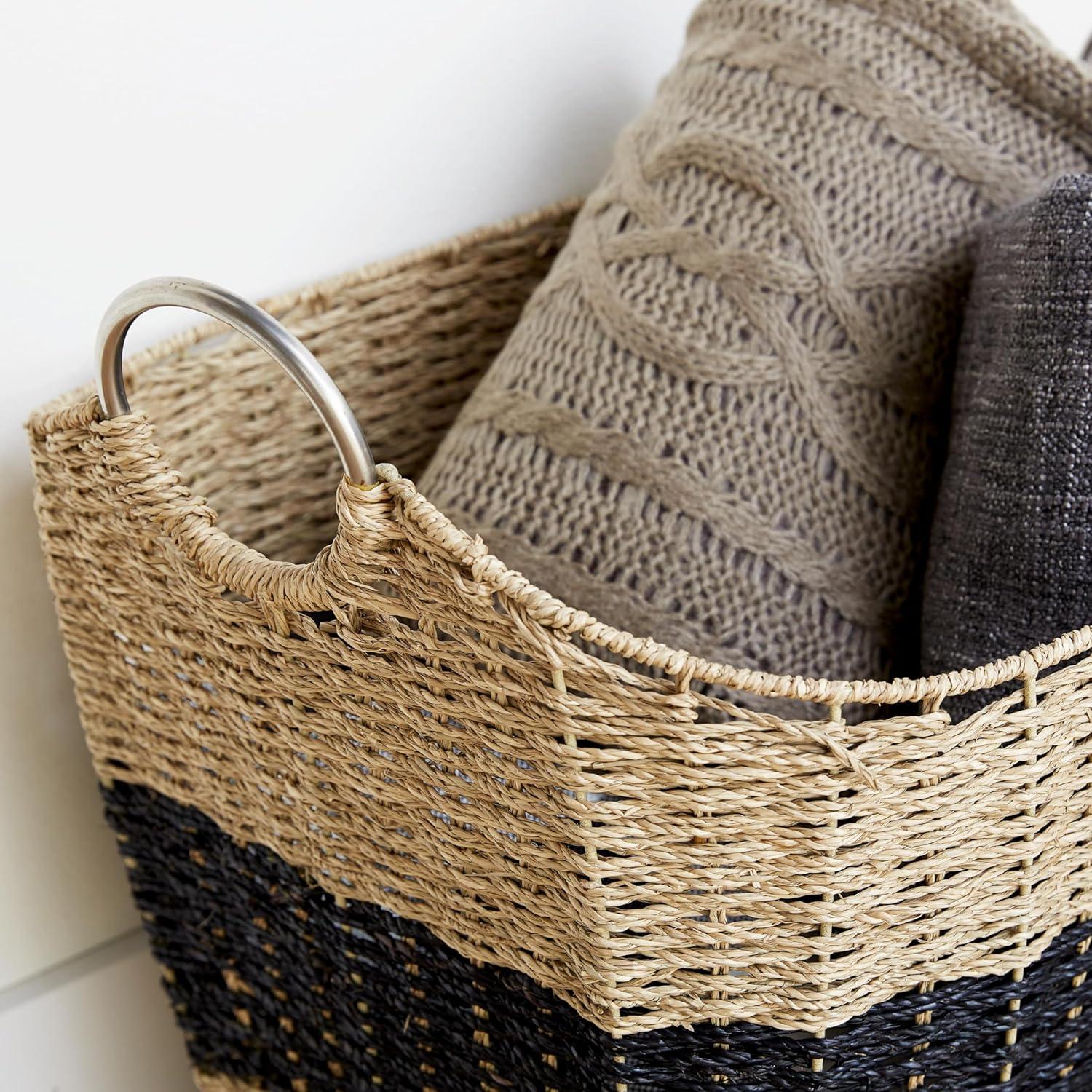 The coastal basket for decor features dried and lacquered seagrass meticulously woven into intricate patterns, with sturdy ring handles attached. The textured brown basket for home decor showcases a rectangle wicker figure accented by a striking black stripe and sleek metal ring handles. Wipe clean with a dry cloth. This brown basket organizer adds a playful twist to your coastal-inspired living room while keeping things neat and stylish. This item ships in 1 carton. Easy-carry, sturdy steel handles. Due to the handmade nature of these, there will be slight color, shape, and size variations, as well as loose fibers. Suitable for indoor use only. This item ships fully assembled in one piece. Maximum weight limit is 5 lbs. Made in Vietnam. This is a single brown colored basket organizer. Coastal style.