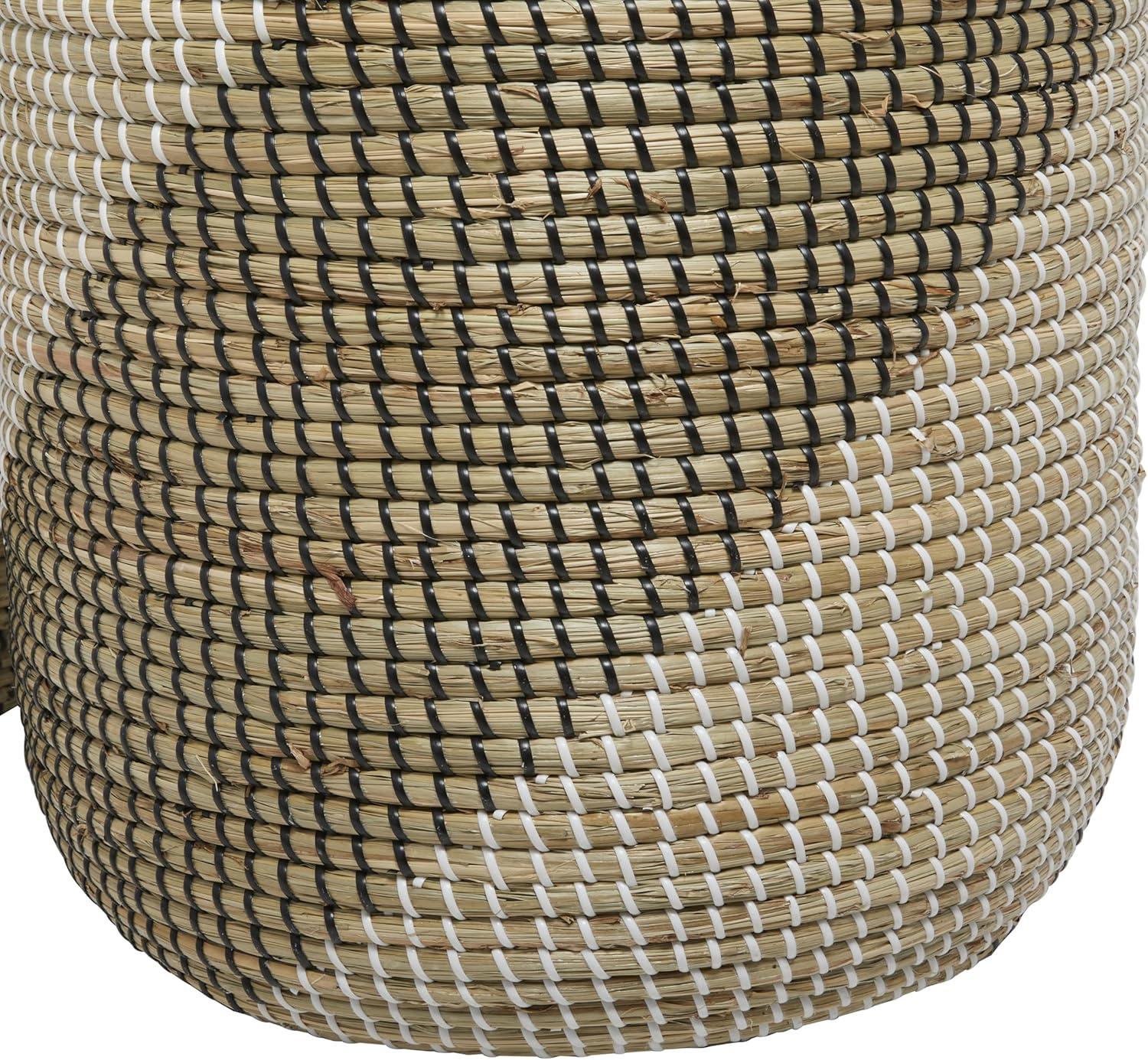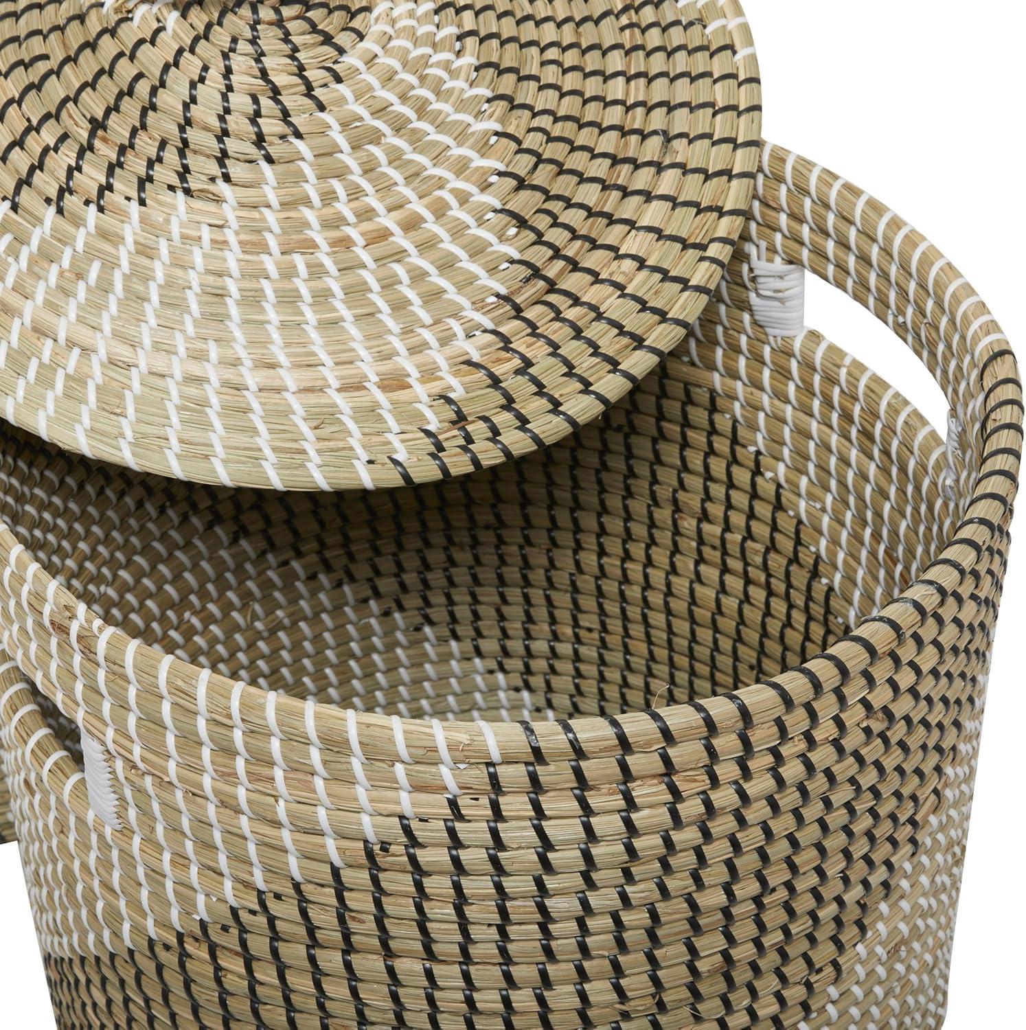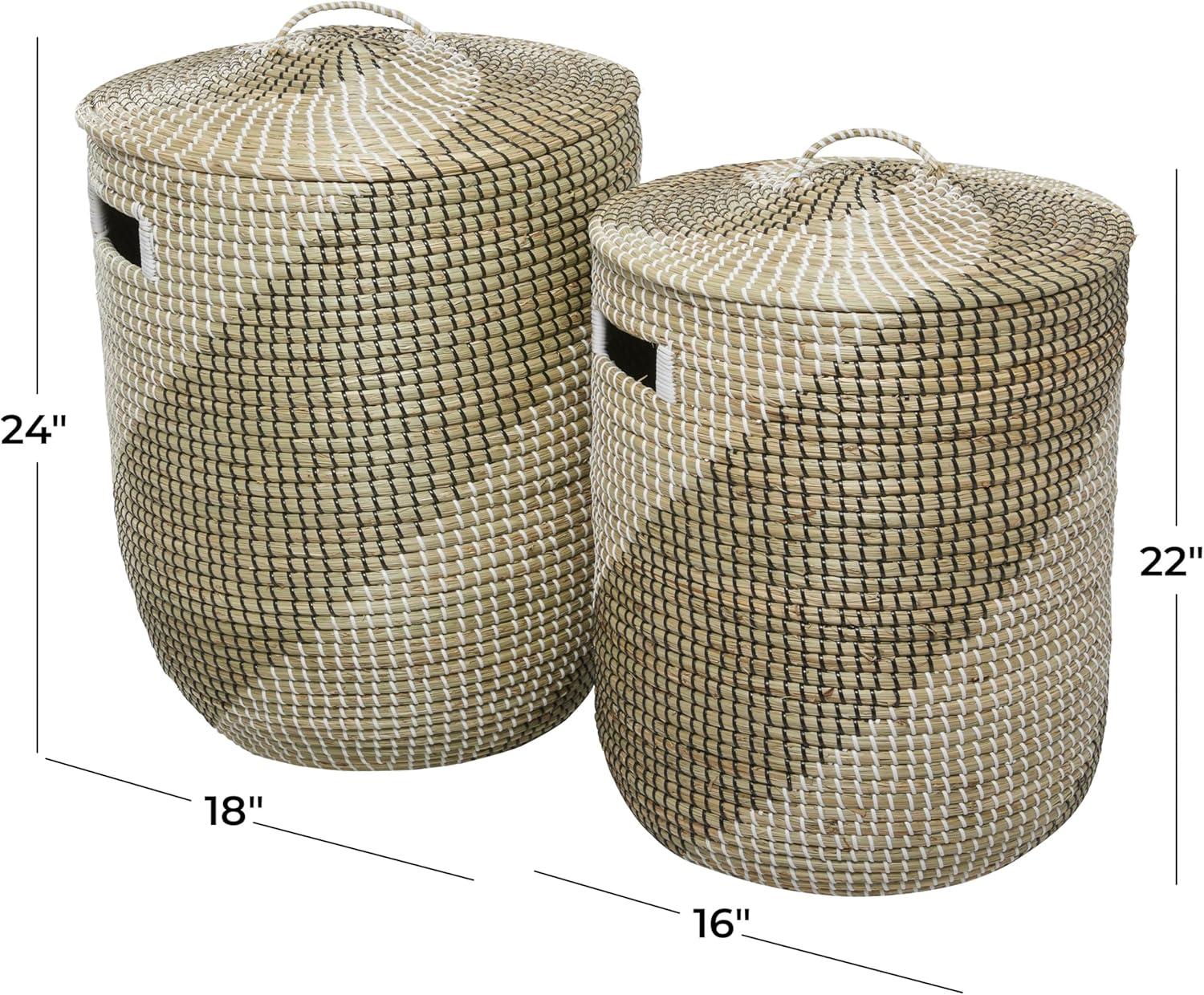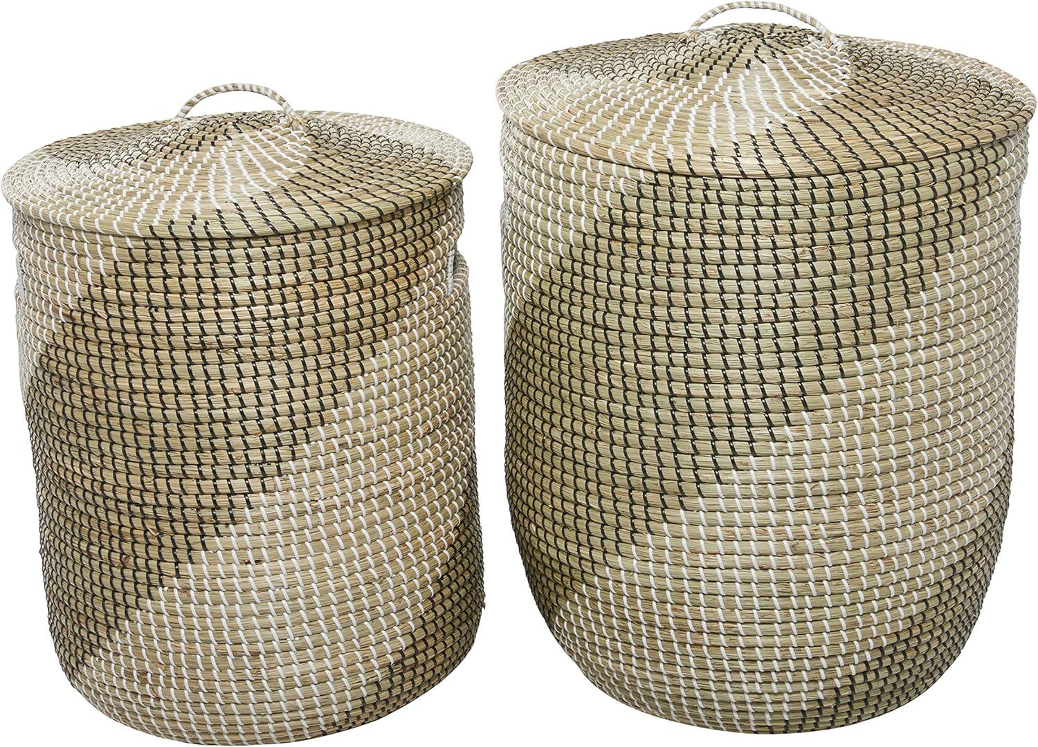 This contemporary set of 2 basket for decor is handmade with seagrass along with matching lids, while black and white strings are woven around the exterior. The textured brown basket for home decor highlights tall round bodies with intricate spiral patterns and round lids adorned with arched handles. Wipe clean with a dry cloth. Style this brown set of 2 basket organizers in your living room or bedroom to enhance your contemporary interior design. This item ships in 1 carton. Due to the handmade nature of these, there will be slight color, shape, and size variations, as well as loose fibers. Suitable for indoor use only. This item ships fully assembled in one piece. Maximum weight limit is 10 lbs. Made in Vietnam. This brown colored seagrass laundry hamper comes as a set of 2. Contemporary style.