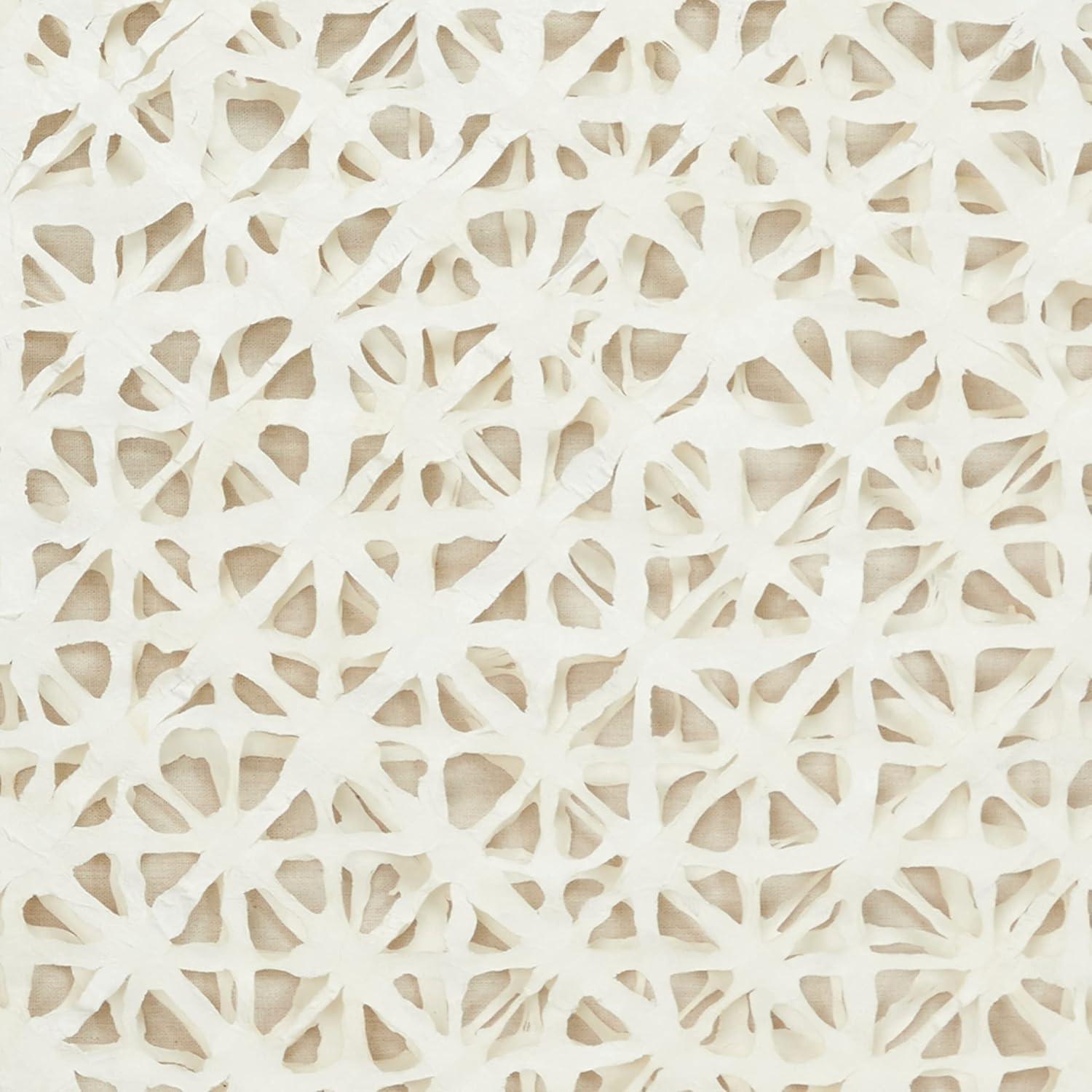 Abstract art style with layered paper cutouts in clover patterns over a solid beige background and housed in a birch-colored frame