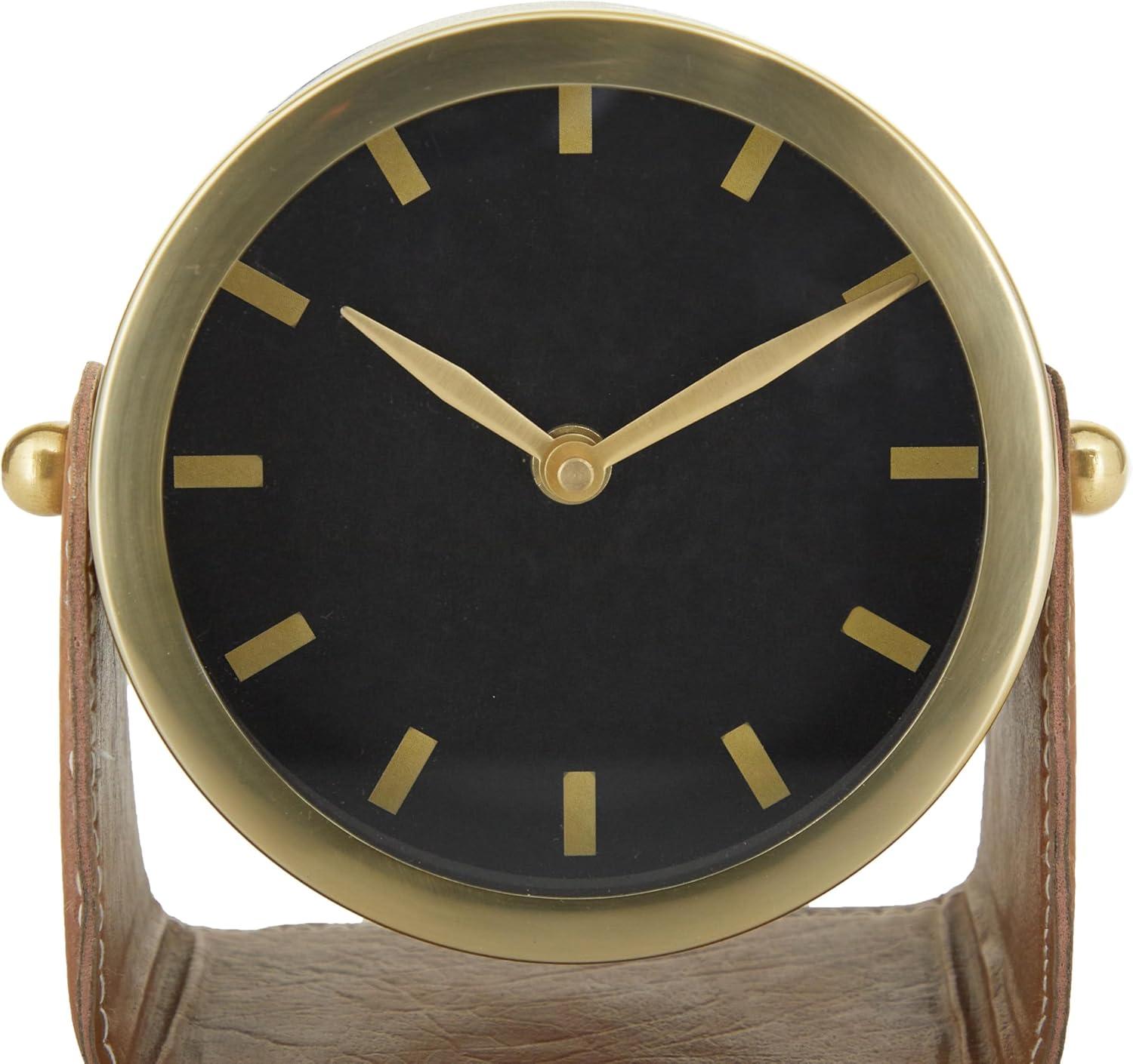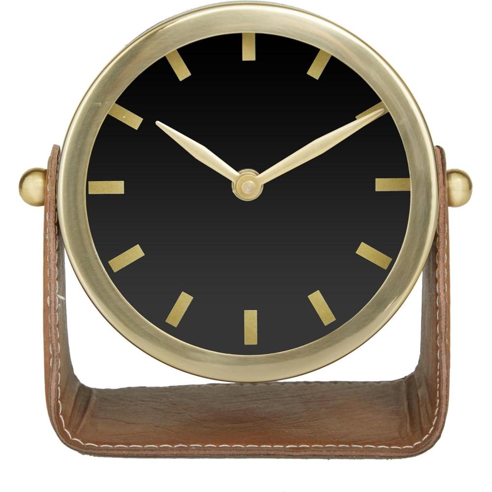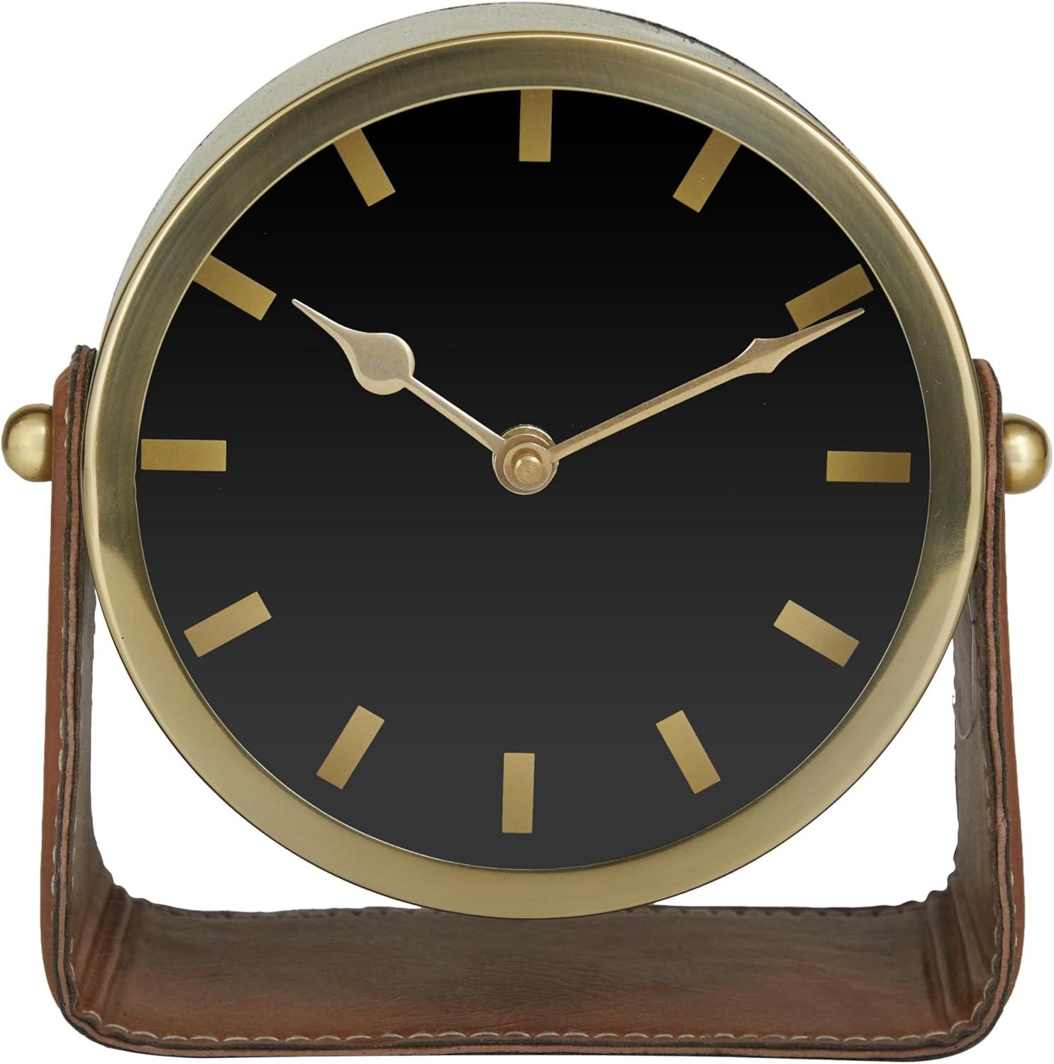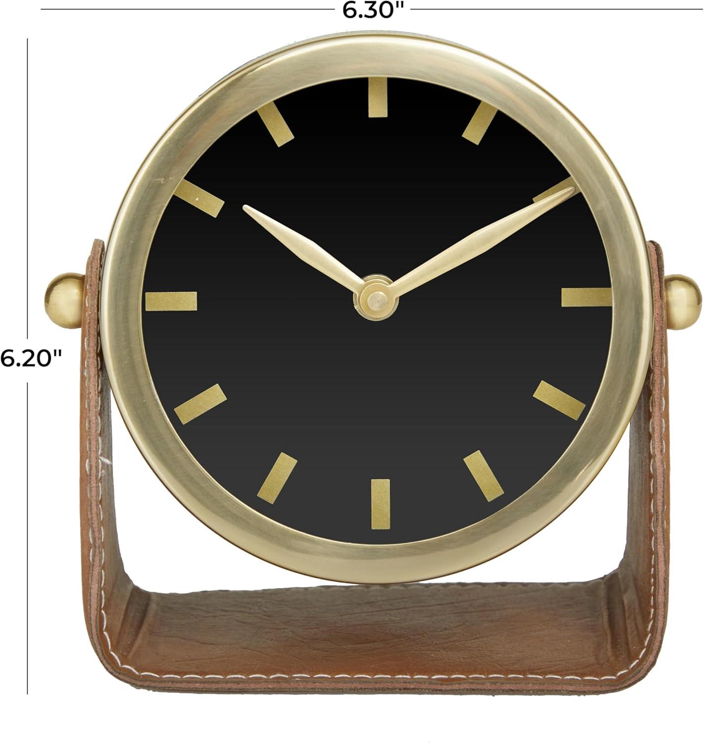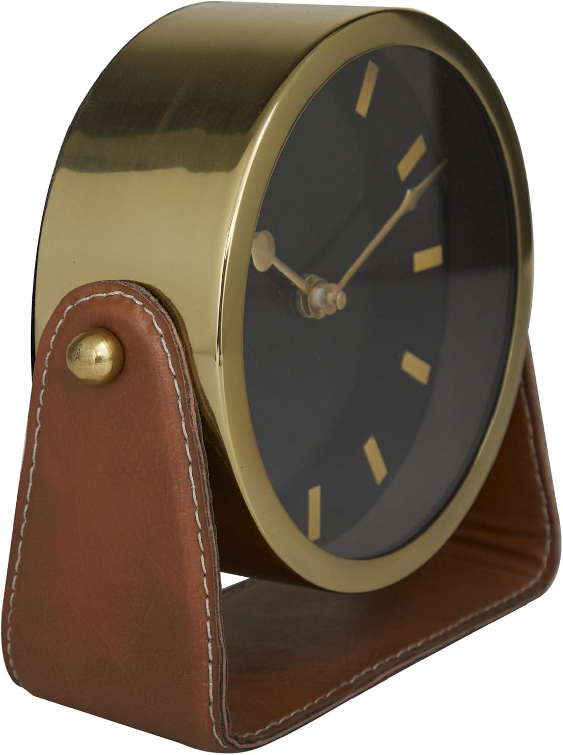 The modern clock for home features a welded stainless-steel body with a tempered glass cover and mounted on a stitched faux leather stand. This polished gold clock for decor features a round body bearing dash hour markers and spade-shaped hands on the clock face, along with a U-shaped leather stand. Wipe clean with a dry cloth. Keep track of time the old fashion way with this stylish clock. A dashing display on any surface to help you manage your time throughout the day. The gold mantel clock keeps the time in check while adding elegance to a work desk in a home office. Requires 1 AA battery, not included. This item ships in 1 carton. The clock face is hash marks for numbers. The clock mechanism runs silent. Stainless steel clock makes a great gift for any occasion. Suitable for indoor use only. This item ships fully assembled in one piece. Made in India. This is a single gold colored mantel clock. Modern style.