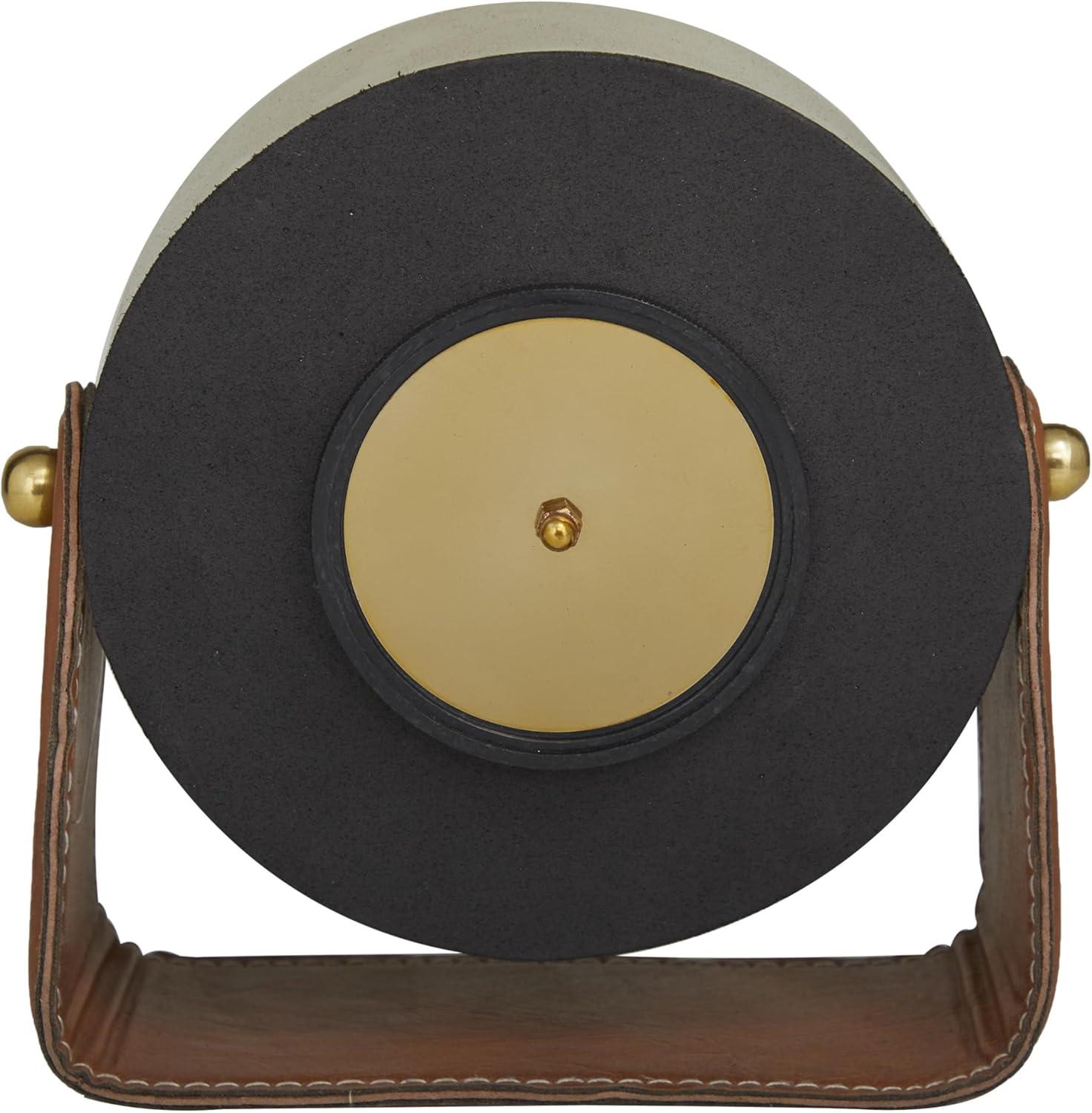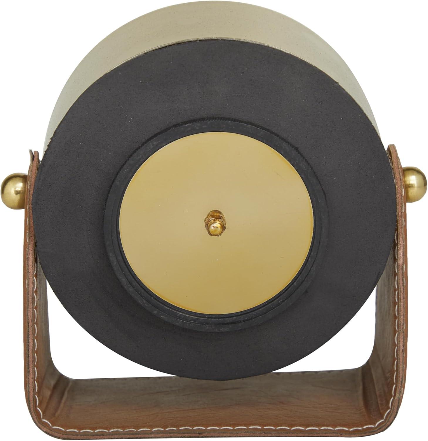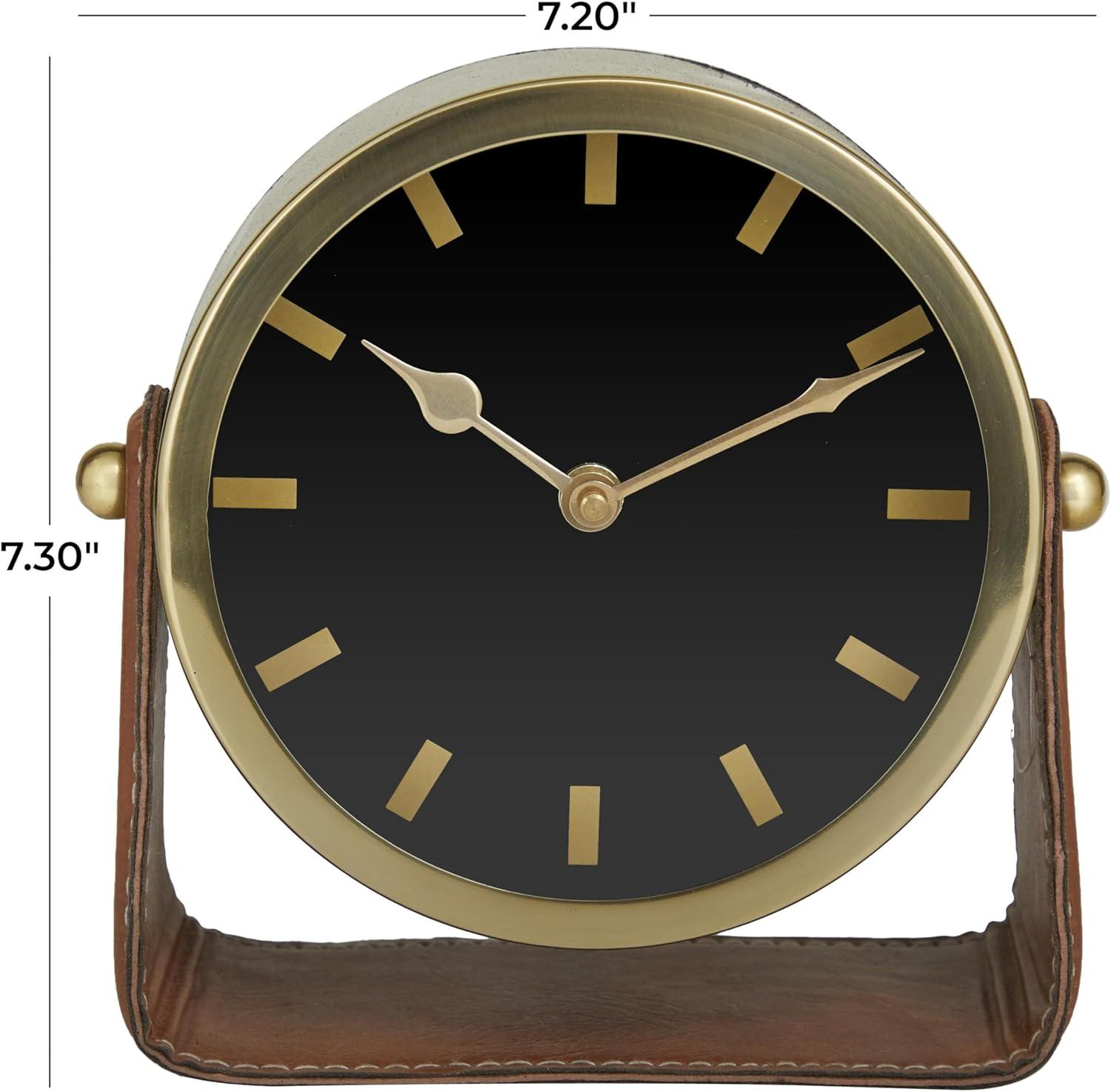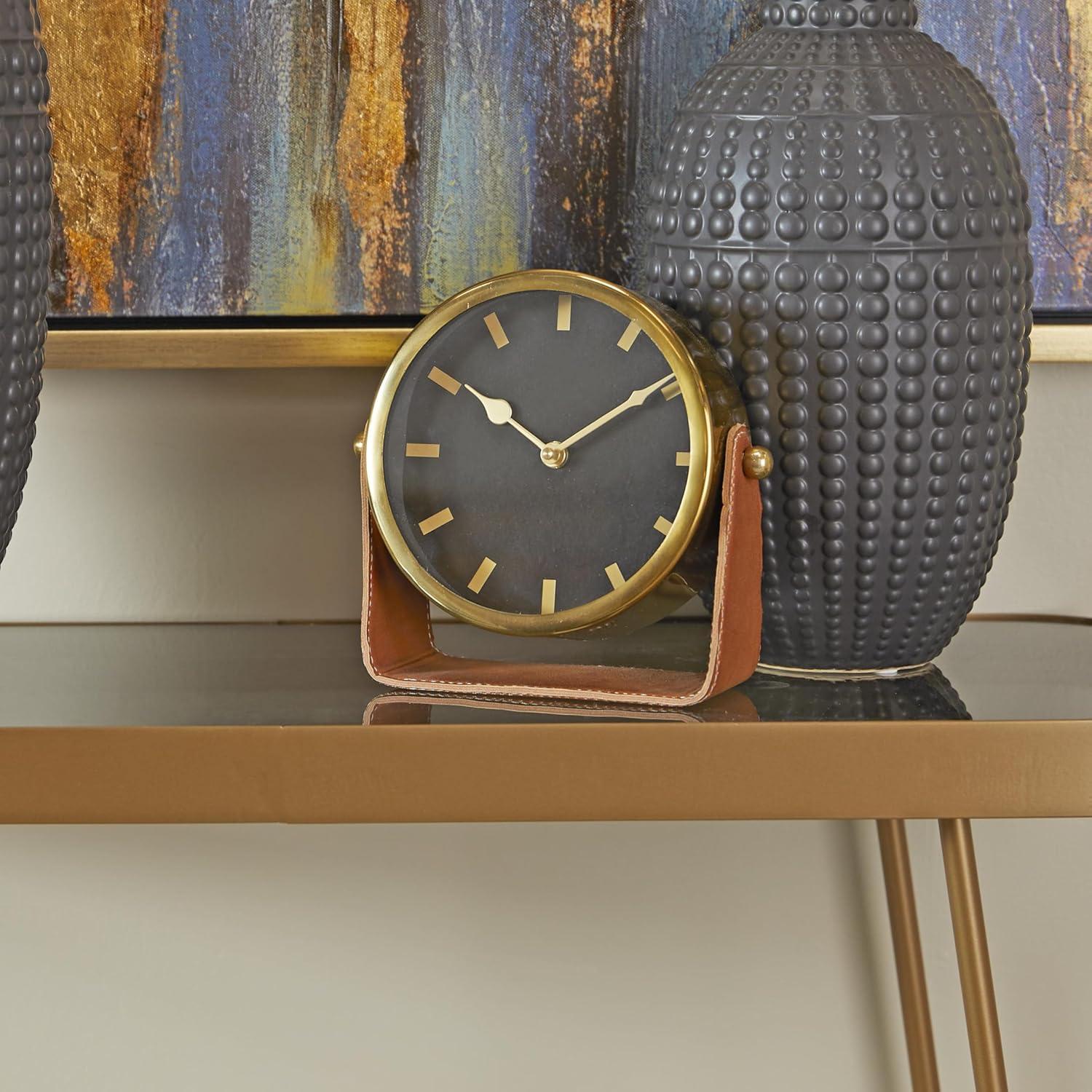 The modern clock for home features a welded stainless-steel body with a tempered glass cover and mounted on a stitched faux leather stand. This polished gold clock for decor features a round body bearing dash hour markers and spade-shaped hands on the clock face, along with a U-shaped leather stand. Wipe clean with a dry cloth. Keep track of time the old fashion way with this stylish clock. A dashing display on any surface to help you manage your time throughout the day. The gold mantel clock keeps the time in check while adding elegance to a work desk in a home office. Requires 1 AA battery, not included. This item ships in 1 carton. The clock face is hash marks for numbers. The clock mechanism runs silent. Stainless steel clock makes a great gift for any occasion. Suitable for indoor use only. This item ships fully assembled in one piece. Made in India. This is a single gold colored mantel clock. Modern style.