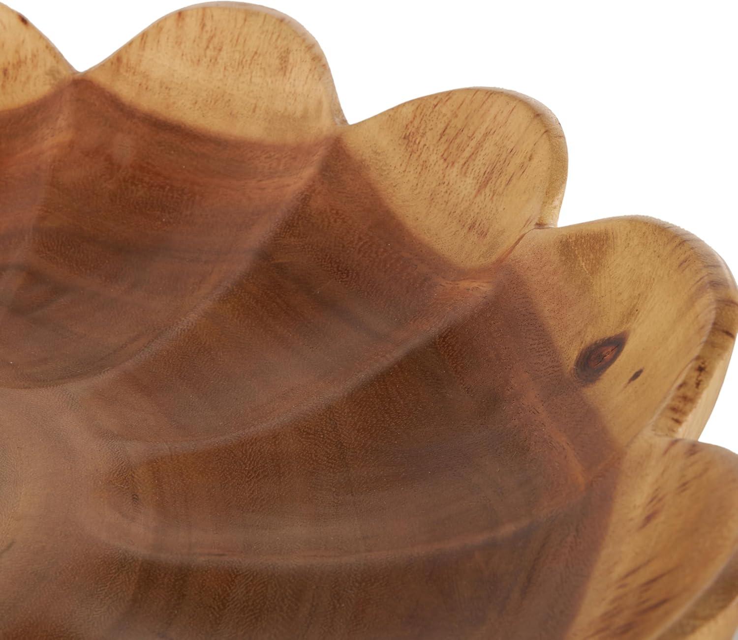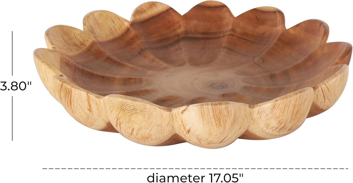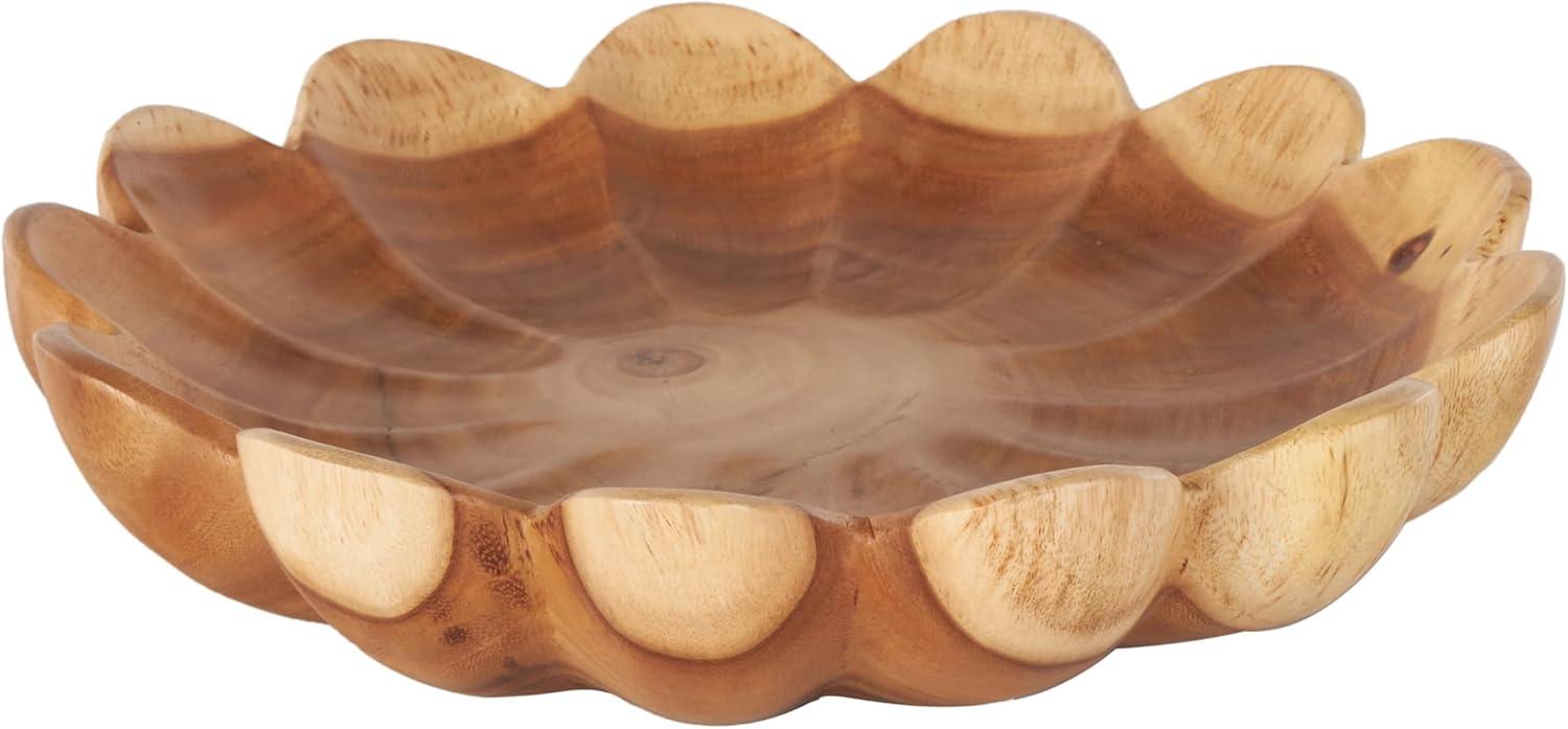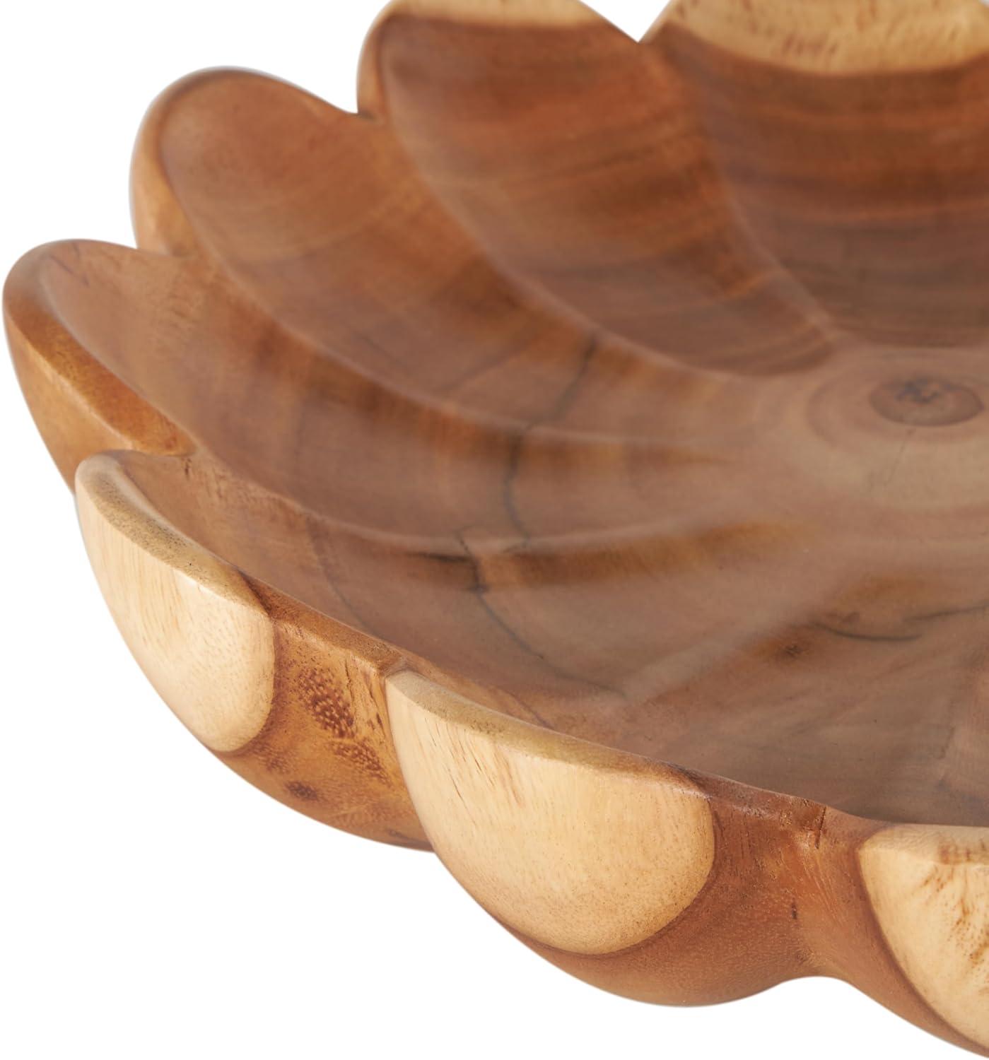 The traditional bowl is meticulously carved from wood and applied cream and brown colors, highlighting the natural grain and beauty of the wood. The oiled brown decorative bowl has a classic round shape that resembles a flower, enhancing its timeless appeal. Wipe clean with a dry cloth. The floral decorative bowl is perfect for adding elegance to living rooms, bedrooms, or kitchens. This item ships in 1 carton. Please note that this item is for decorative purposes only and is not food safe. Due to the handmade nature of this item, no two will be alike, there will be slight differences in shape, size, and color. Suitable for indoor use only. This item ships fully assembled in one piece. Due to the live edges of the piece, each is unique, so no two products will have an identical pattern, shade, or cut. Made in Indonesia. This is a single brown colored display bowl. Traditional style.