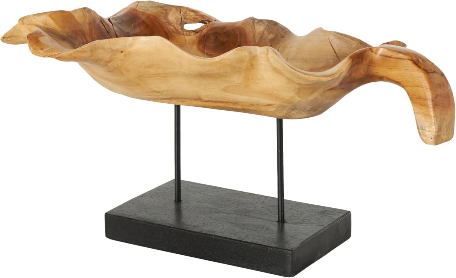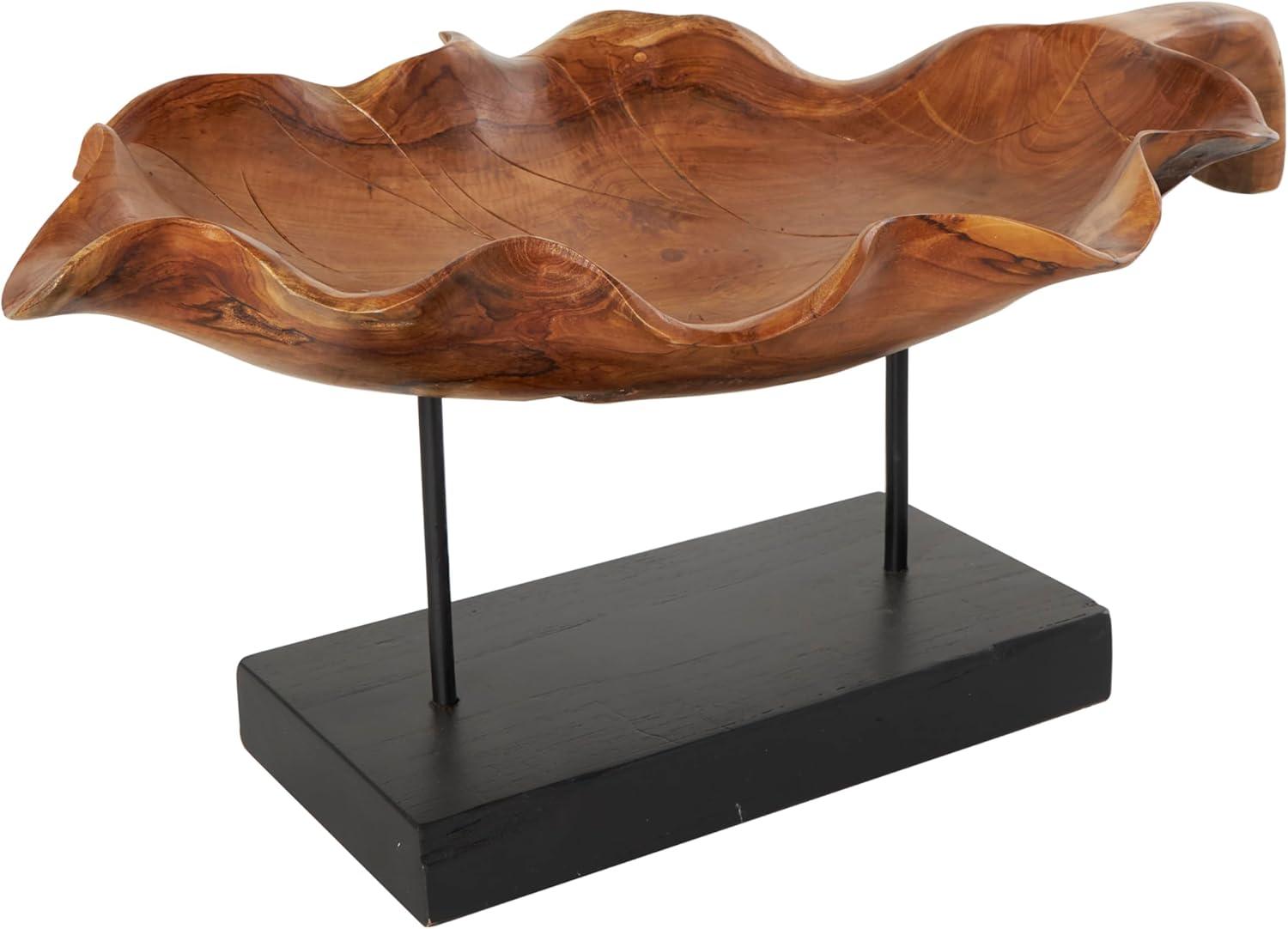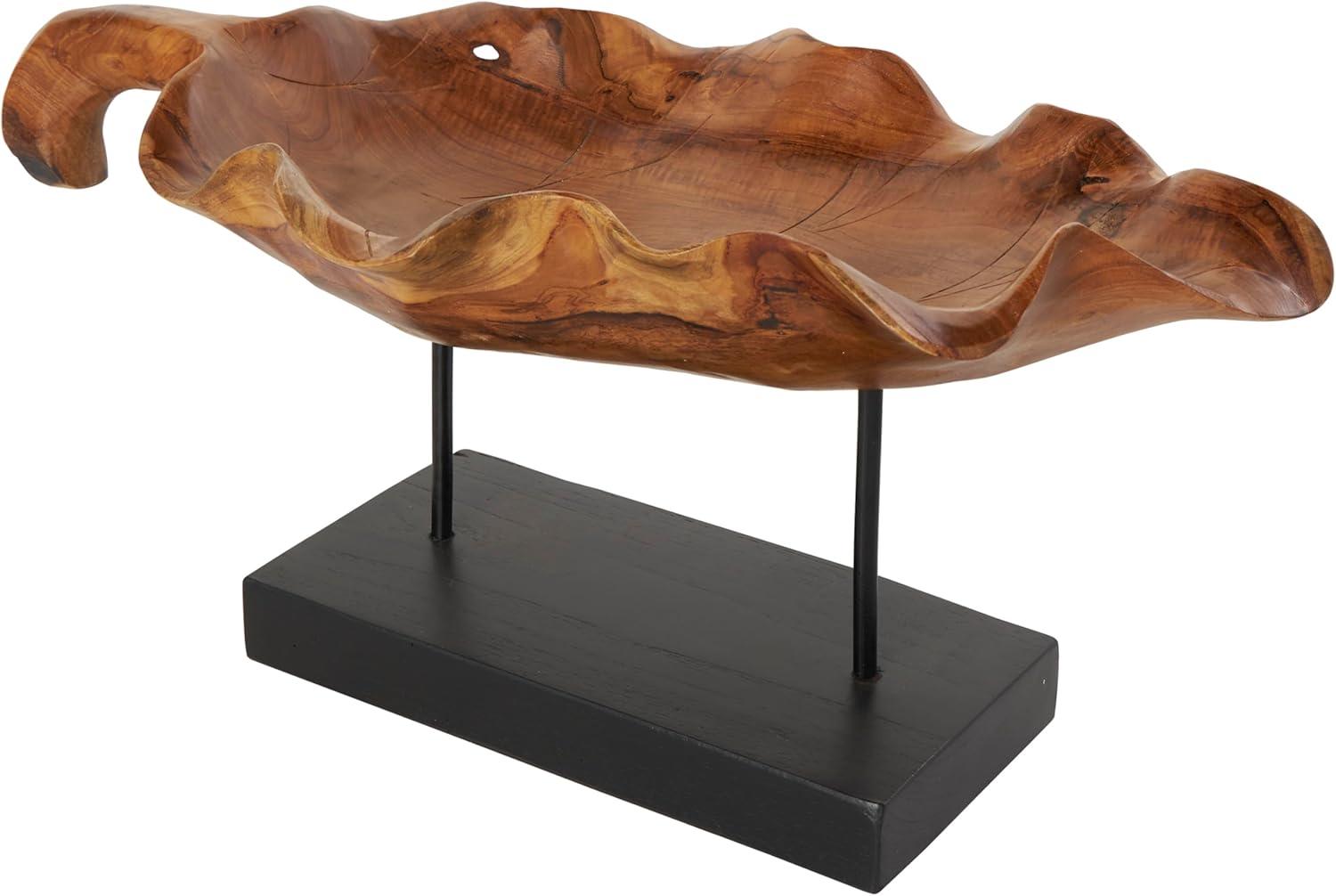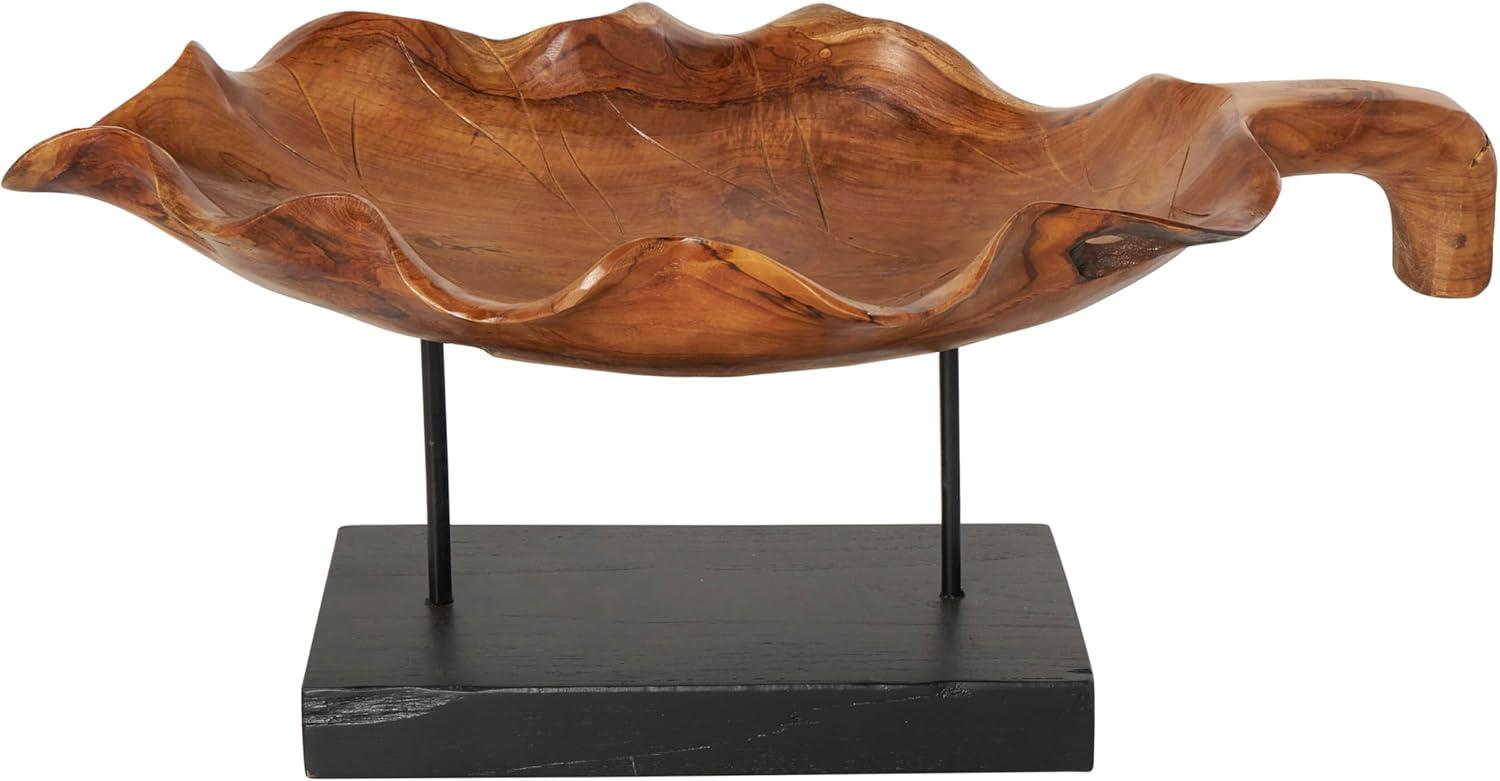 Handcrafted from natural teak wood, this natural accent statue forms an eye-catching leaf design that sits on a metal stand attached to a block base. With its leaf shape, rectangular shape, and live edge design, this stunning varnished brown home decor figurine is a great way to instantly elevate your home decor. Wipe clean with a dry cloth. This leaf home decor statue can be placed on a console table to add an artistic touch to living room or bedroom. Designed with felt or rubber stoppers at the base that prevent scratching furniture and table tops, as well as sliding around. This item ships in 1 carton. Please note that this item is for decorative use only. Teak sculpture makes a great gift for any occasion. Suitable for indoor use only. This item ships fully assembled in one piece. Due to the live edges of the piece, each is unique, so no two products will have an identical pattern, shade, or cut. Made in Indonesia. This is a single brown colored display bowl. Natural style.