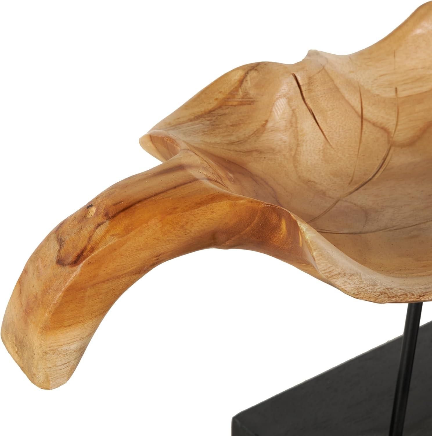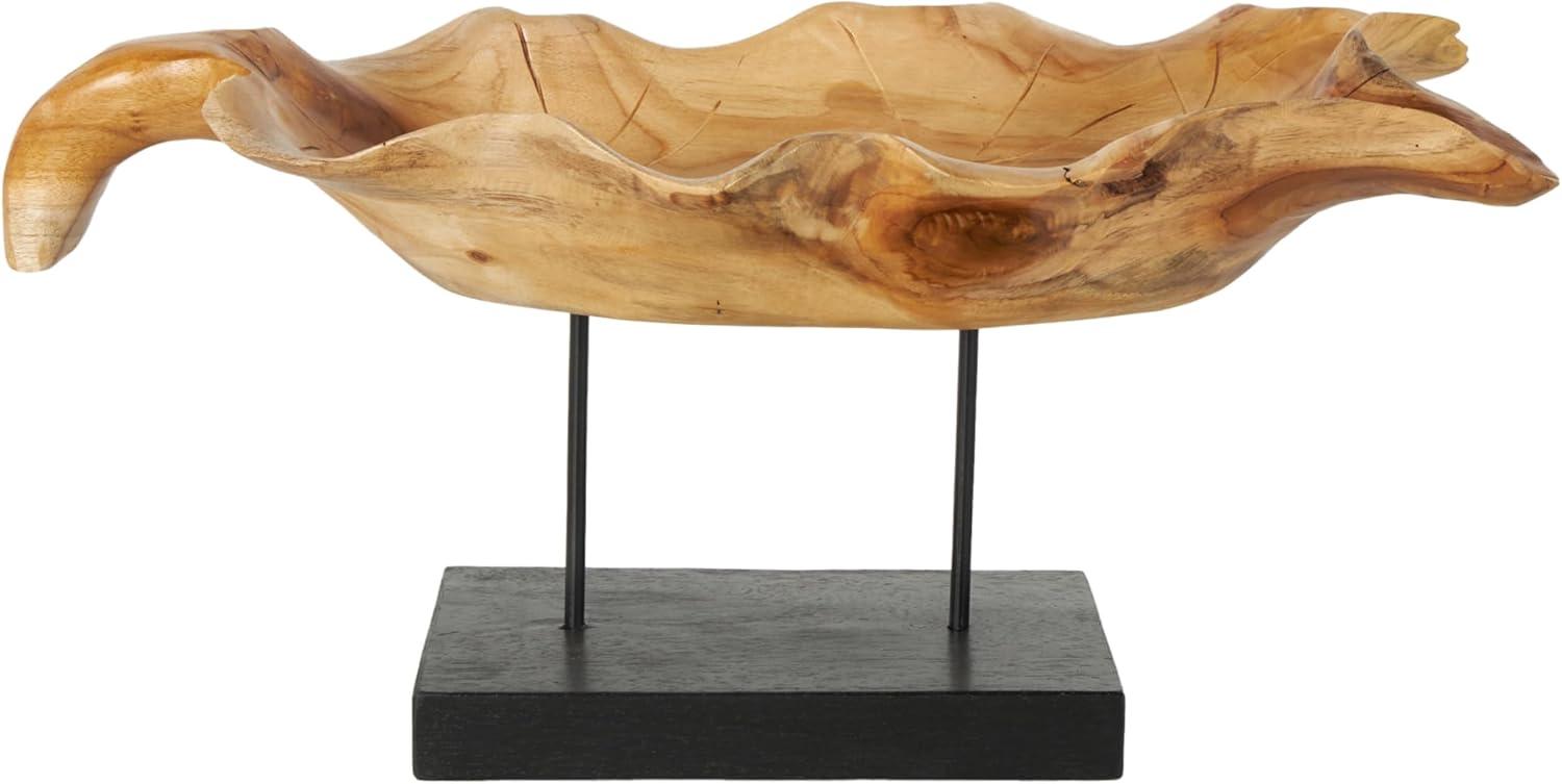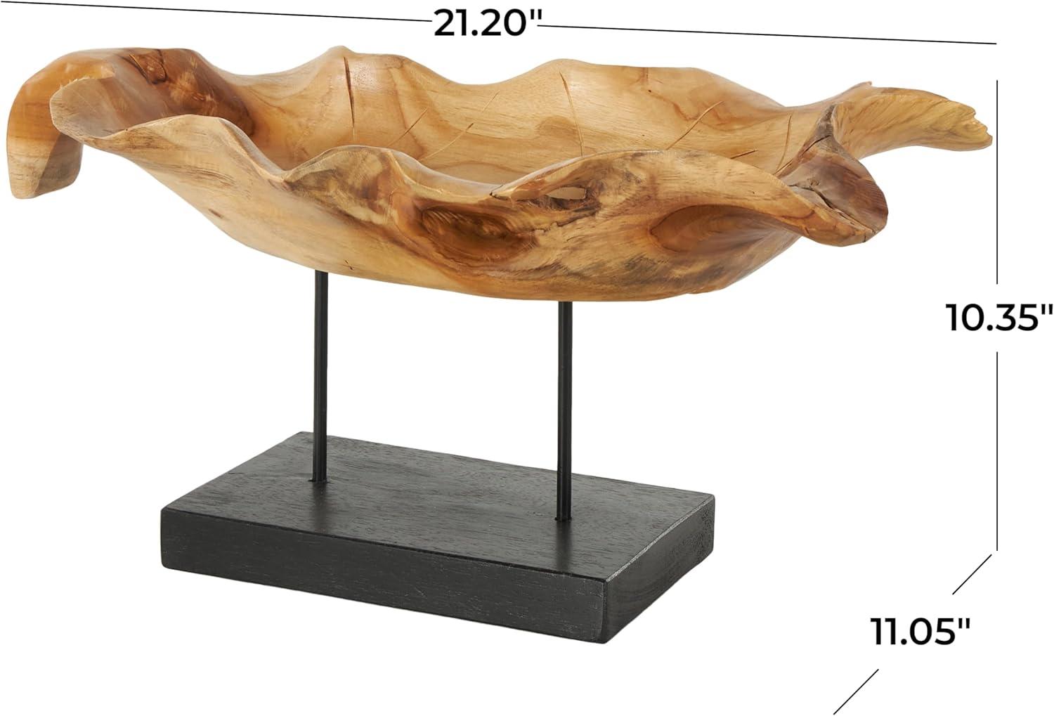 Handcrafted from natural teak wood, this natural accent statue forms an eye-catching leaf design that sits on a metal stand attached to a block base. With its leaf shape, rectangular shape, and live edge design, this stunning varnished brown home decor figurine is a great way to instantly elevate your home decor. Wipe clean with a dry cloth. This leaf home decor statue can be placed on a console table to add an artistic touch to living room or bedroom. Designed with felt or rubber stoppers at the base that prevent scratching furniture and table tops, as well as sliding around. This item ships in 1 carton. Please note that this item is for decorative use only. Teak sculpture makes a great gift for any occasion. Suitable for indoor use only. This item ships fully assembled in one piece. Due to the live edges of the piece, each is unique, so no two products will have an identical pattern, shade, or cut. Made in Indonesia. This is a single brown colored display bowl. Natural style.