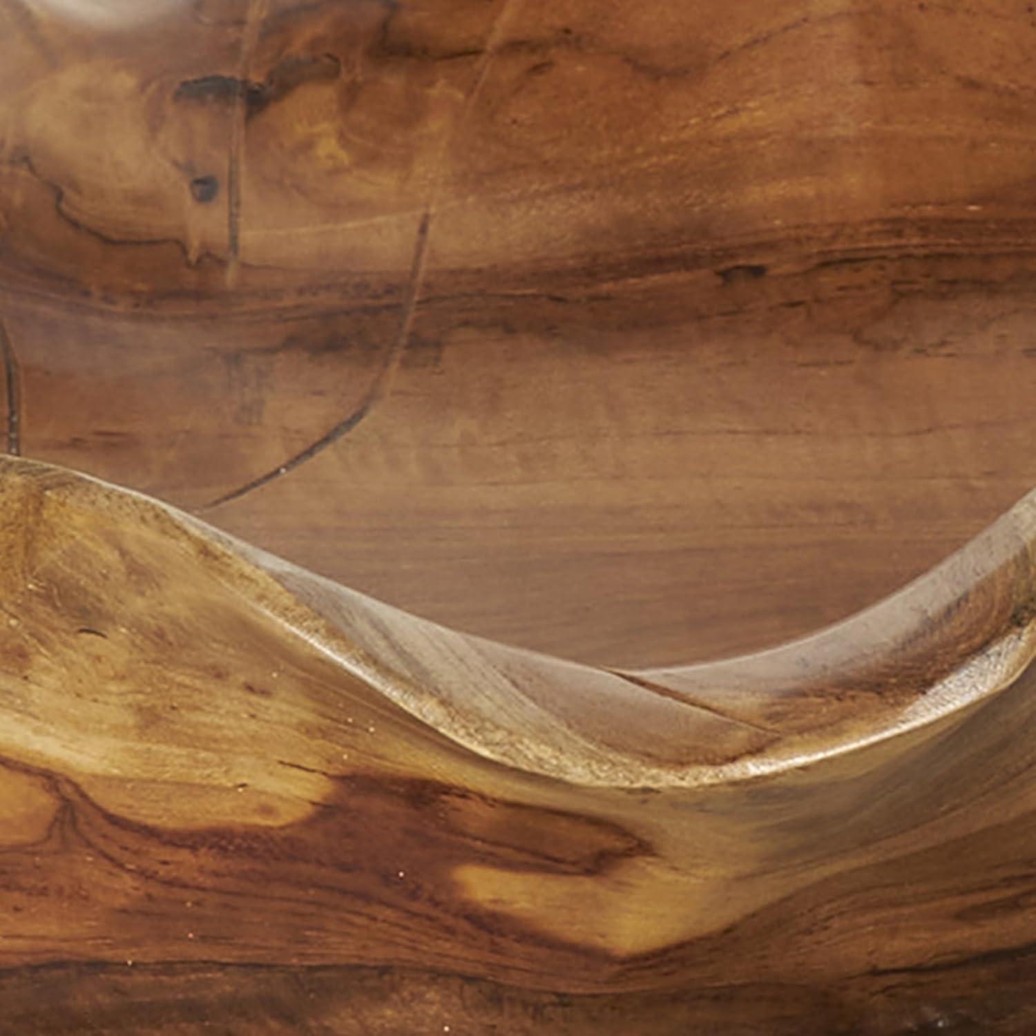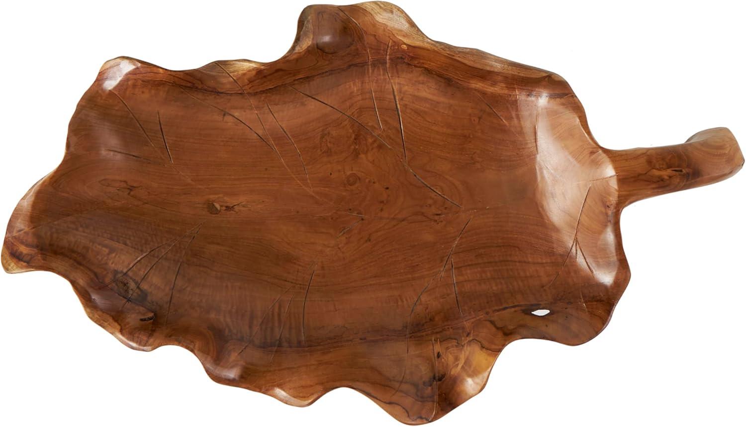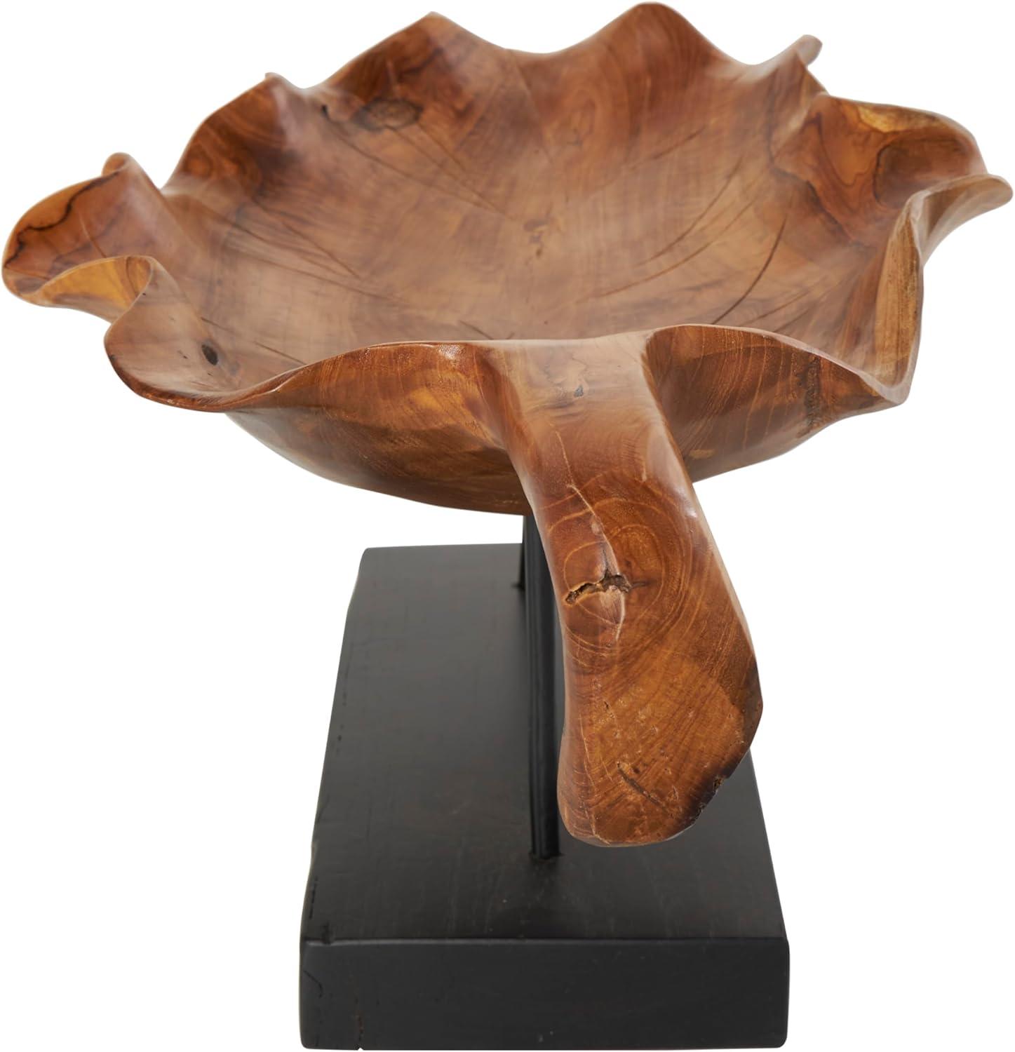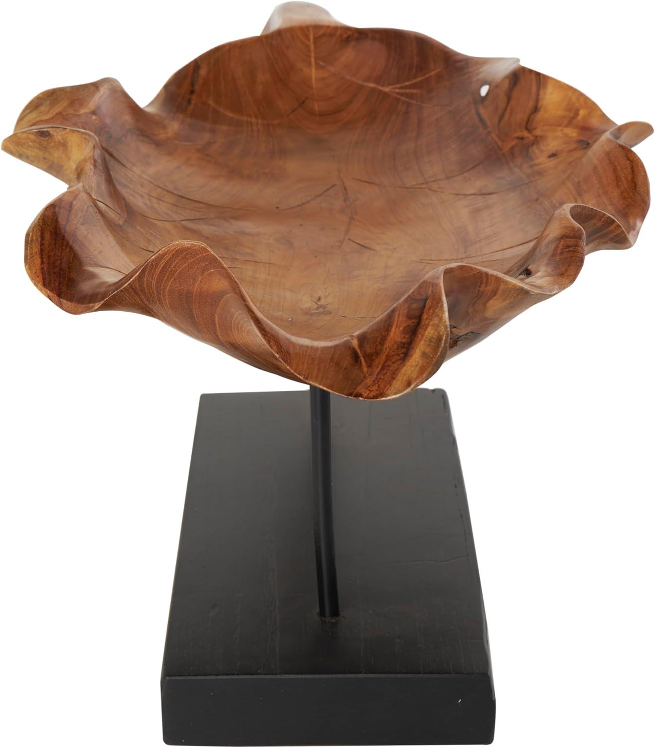 Handcrafted from natural teak wood, this natural accent statue forms an eye-catching leaf design that sits on a metal stand attached to a block base. With its leaf shape, rectangular shape, and live edge design, this stunning varnished brown home decor figurine is a great way to instantly elevate your home decor. Wipe clean with a dry cloth. This leaf home decor statue can be placed on a console table to add an artistic touch to living room or bedroom. Designed with felt or rubber stoppers at the base that prevent scratching furniture and table tops, as well as sliding around. This item ships in 1 carton. Please note that this item is for decorative use only. Teak sculpture makes a great gift for any occasion. Suitable for indoor use only. This item ships fully assembled in one piece. Due to the live edges of the piece, each is unique, so no two products will have an identical pattern, shade, or cut. Made in Indonesia. This is a single brown colored display bowl. Natural style.