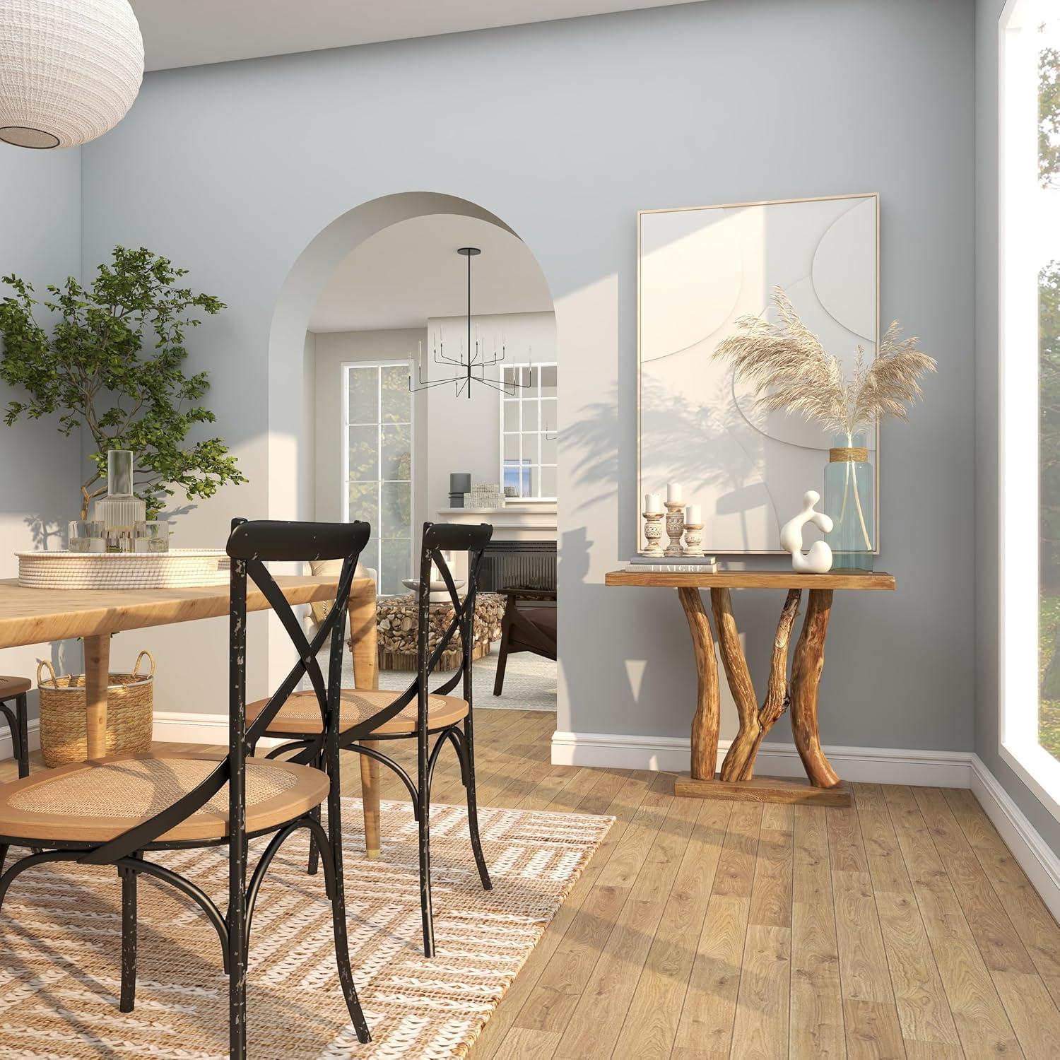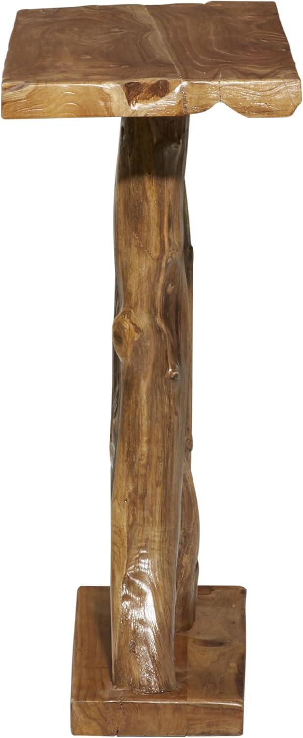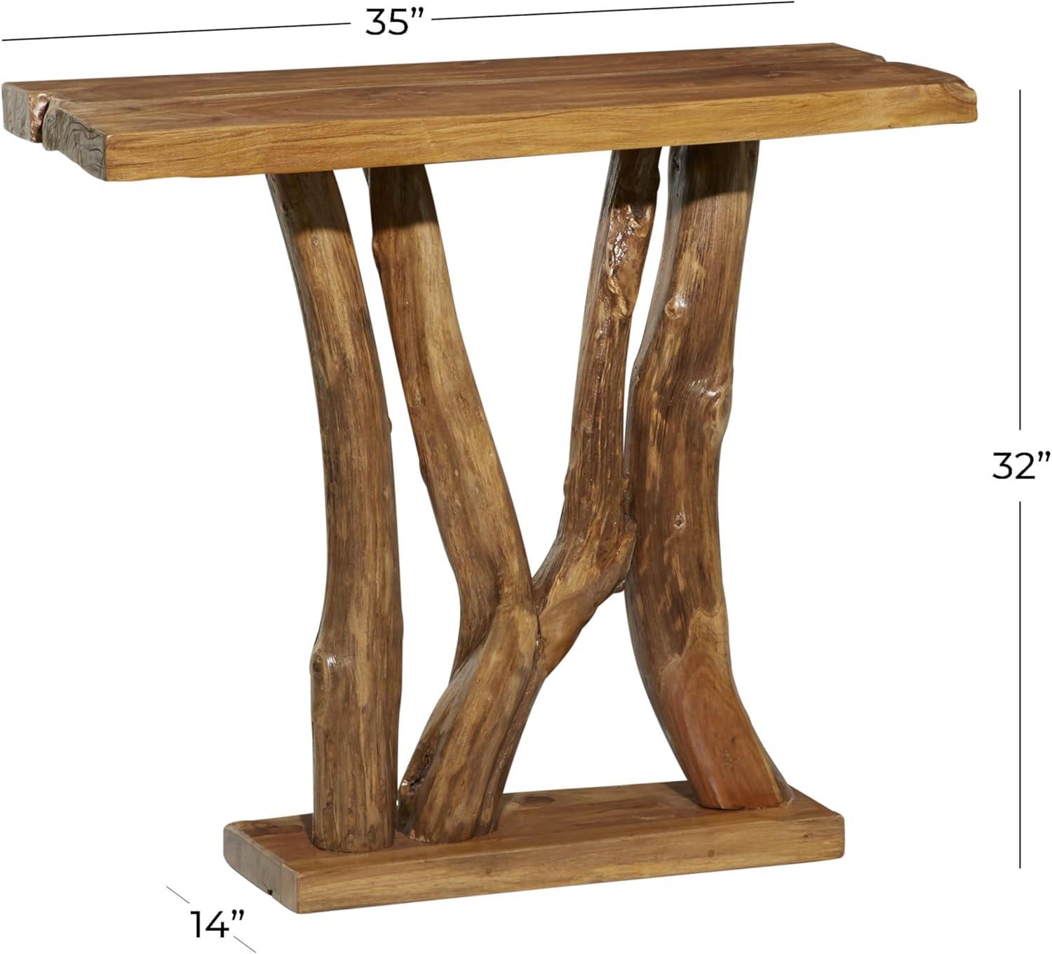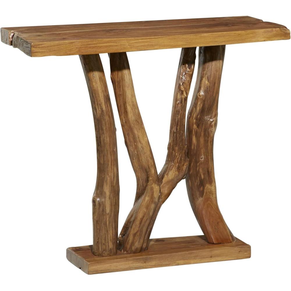 The sturdy glass panel is securely mounted on abstract-shaped teak wood base. This rectangle console table feature a glass top with a tree trunk base for naturalistic appeal. Wipe clean with a dry cloth. A black teak wood console table designed to be attractive and stylish in any contemporary-inspired space. This item ships in 2 cartons. This one-of-a-kind item is made from the stumps and unused trunks of harvested teak trees, from ecologically managed forests. Once the tree is harvested, the remaining stumps must be removed to make space to plant replacement trees. In the past, these pieces would be harvested and then burned to dispose of them. Today we use these tree stumps and trunks to create beautiful, handcrafted pieces for your home. Coloring, cracks, and shapes will vary between items. Suitable for indoor use only. This item ships fully assembled in one piece. Due to the live edges of the piece, each is unique, so no two products will have an identical pattern, shade, or cut. Maximum weight limit is 100 lbs. Made in Indonesia. This is a single black colored entryway table. Contemporary style.
