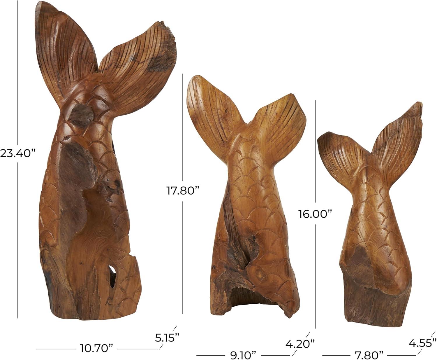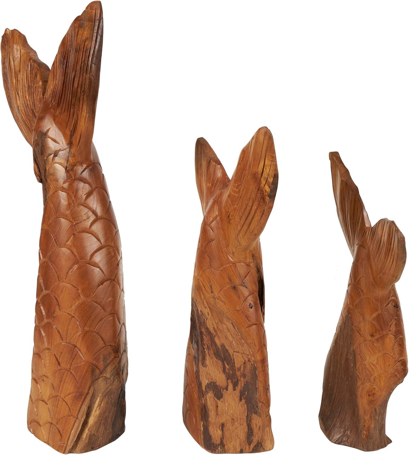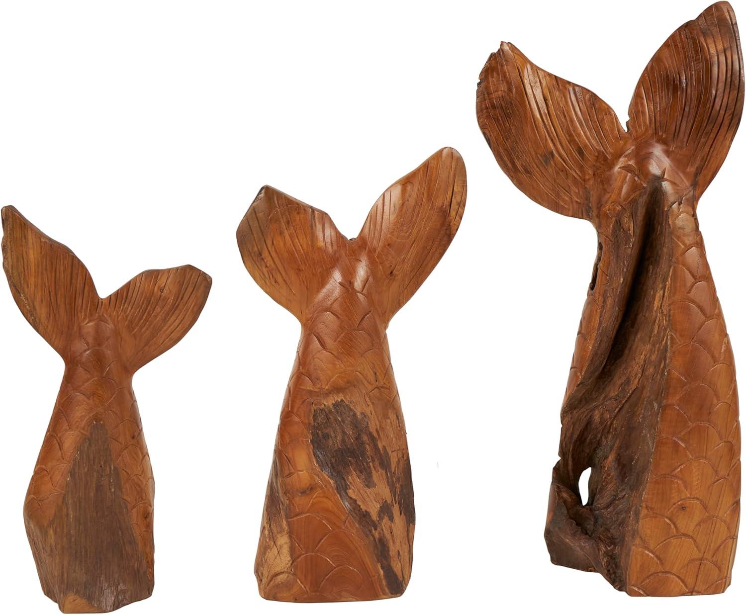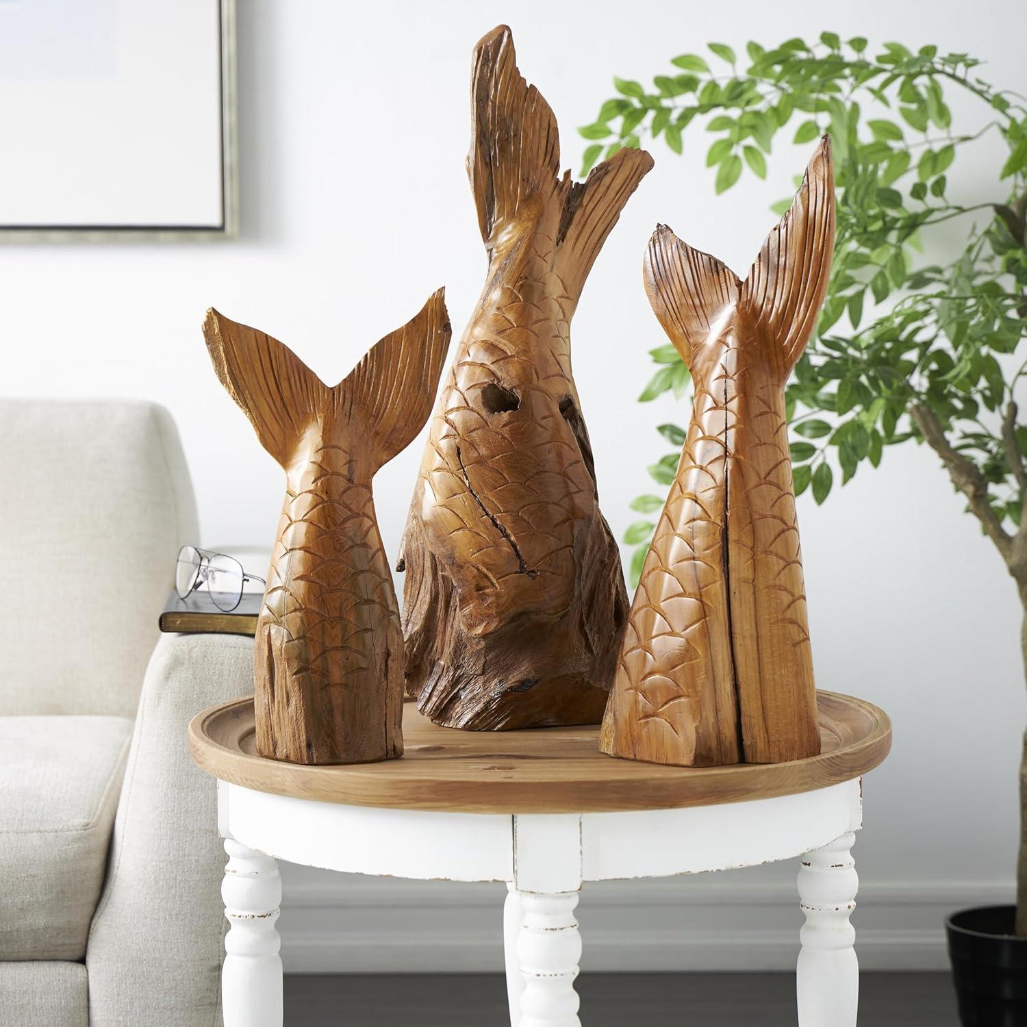 WHALE ASYMMETRICAL ACCENT STATUES: The teak set of 3 sculptures boasts intricate carvings and a live edge design, offering a unique and handcrafted tribal aesthetic