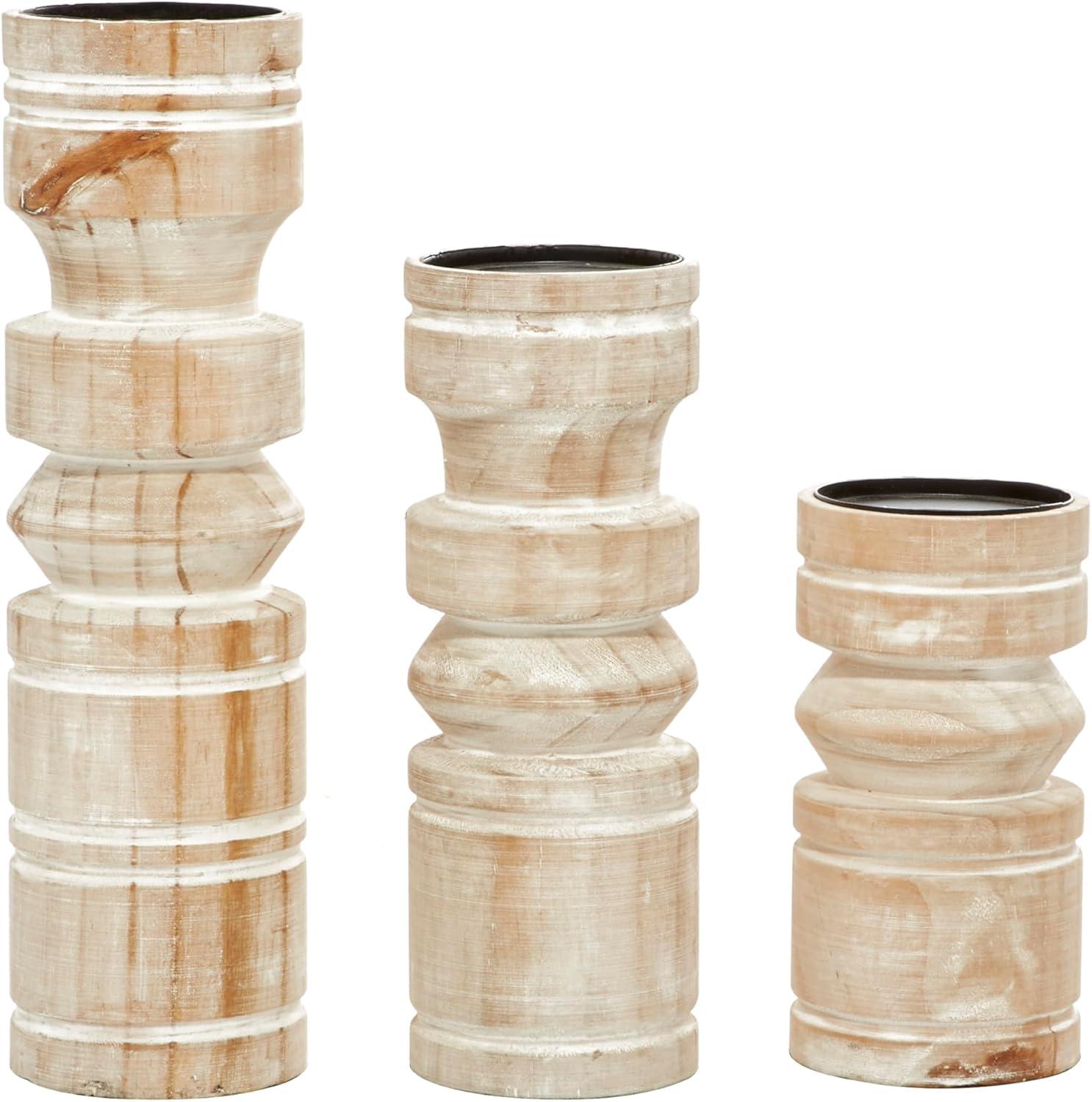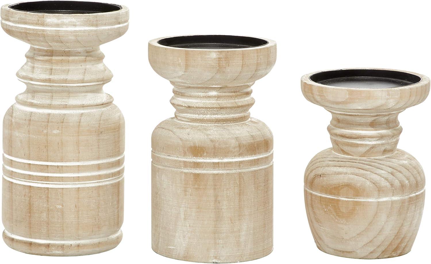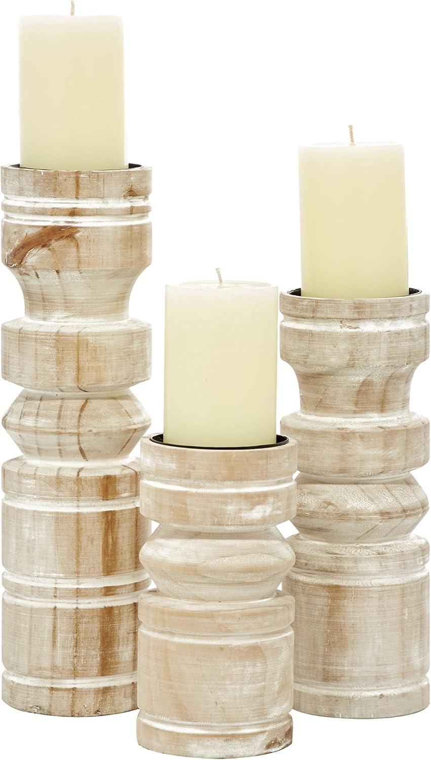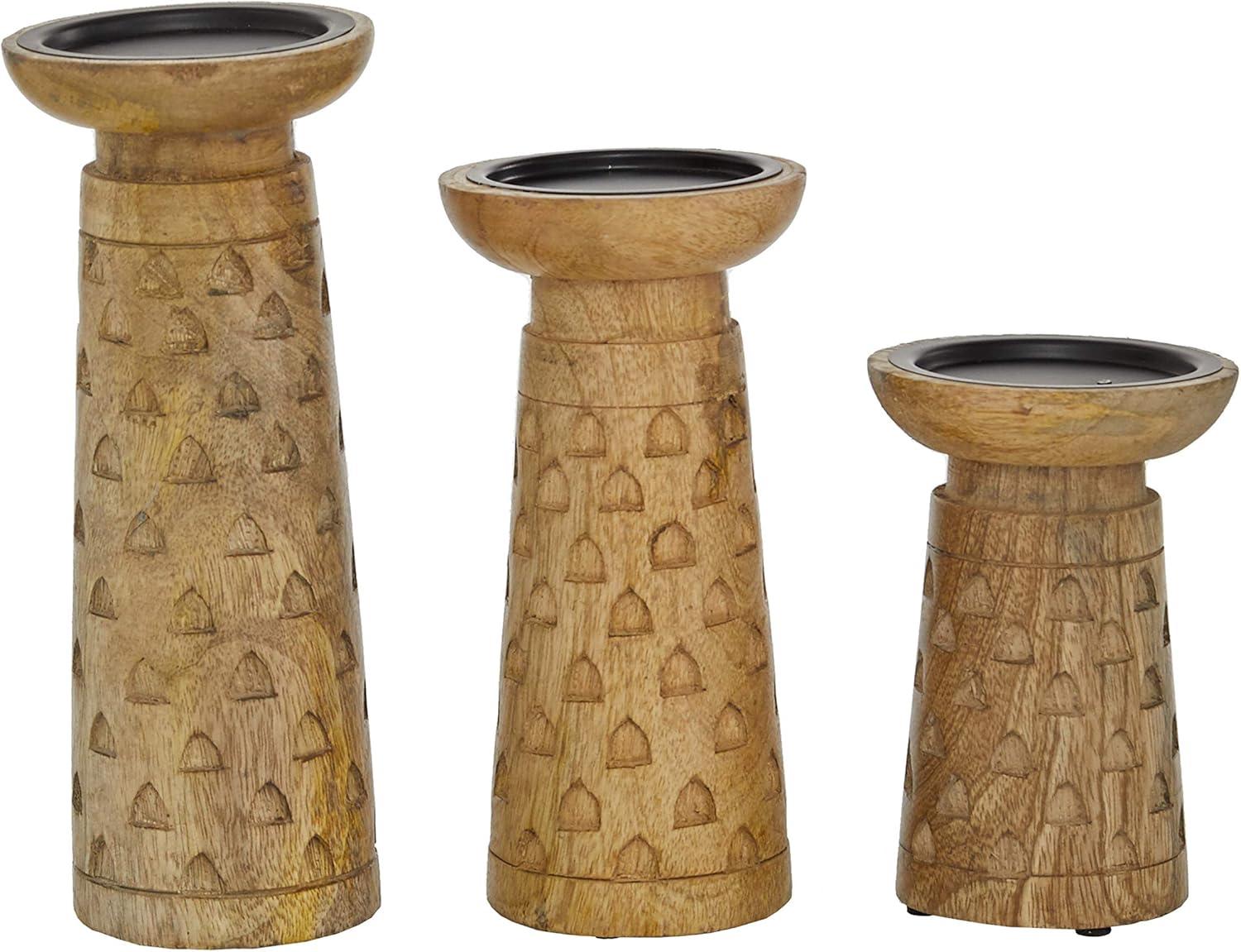 Traditional set of 3 candle holders for home decor showcases intricately carved wood with a distressed black coating on its tapered bodies and iron welded plates attached to hold candles securely. Distressed black candle holders for centerpiece displays turned wood-inspired design with horizontal ribbing. Wipe clean with a dry cloth. Give your space a radiant illumination with these beautifully crafted candle holders. Made with a sturdy base, it is perfect for creating an elegant atmosphere at your table top or mantel. Black set of 3 candle stands provides a great display in your home for a warm and comforting atmosphere in living rooms or bedrooms. Designed with felt or rubber stoppers at the base that prevent scratching furniture and table tops, as well as sliding around. Can hold 3 pillar candles, not included. This item ships in 1 carton. Wood candle holder makes a great gift for any occasion. Suitable for indoor use only. This item ships fully assembled in one piece. This black colored wood candle stand comes as a set of 3. Traditional style.