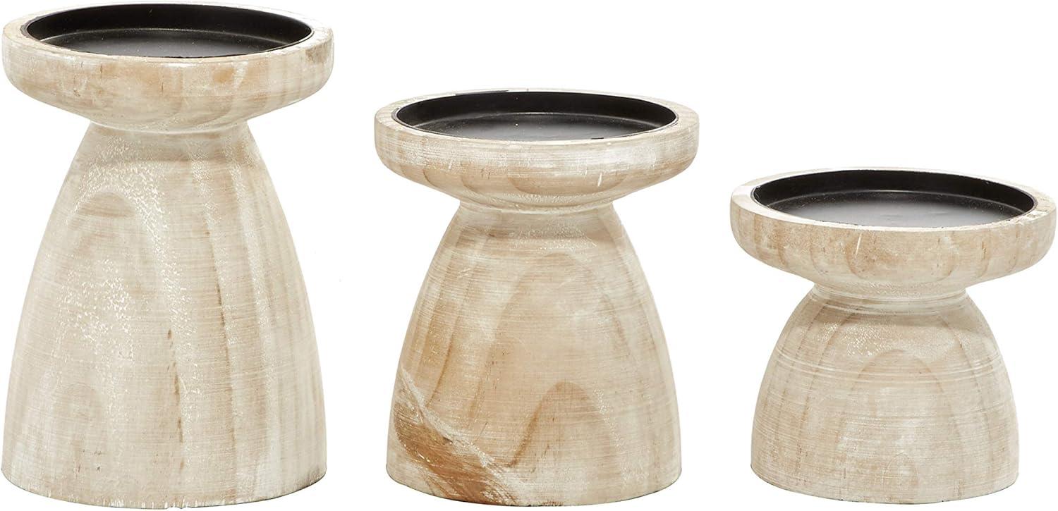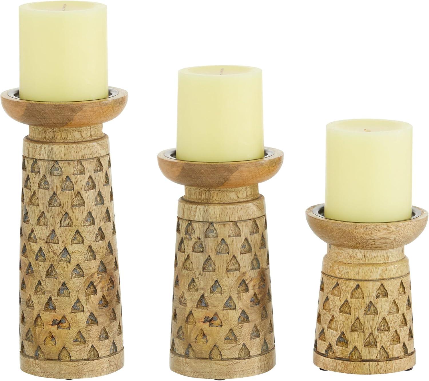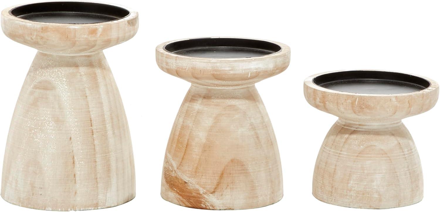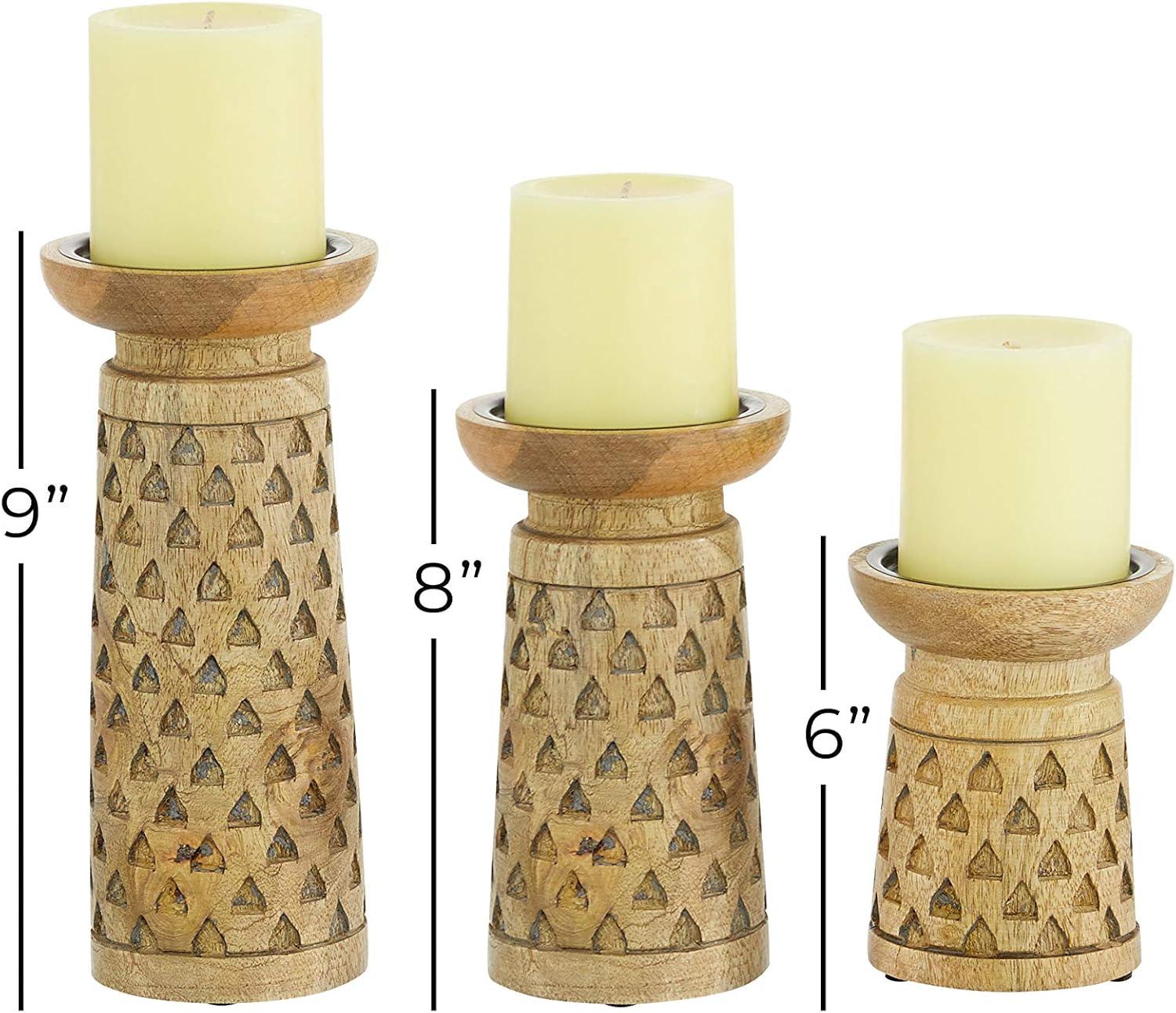 Traditional set of 3 candle holders for home decor showcases intricately carved wood with a distressed black coating on its tapered bodies and iron welded plates attached to hold candles securely. Distressed black candle holders for centerpiece displays turned wood-inspired design with horizontal ribbing. Wipe clean with a dry cloth. Give your space a radiant illumination with these beautifully crafted candle holders. Made with a sturdy base, it is perfect for creating an elegant atmosphere at your table top or mantel. Black set of 3 candle stands provides a great display in your home for a warm and comforting atmosphere in living rooms or bedrooms. Designed with felt or rubber stoppers at the base that prevent scratching furniture and table tops, as well as sliding around. Can hold 3 pillar candles, not included. This item ships in 1 carton. Wood candle holder makes a great gift for any occasion. Suitable for indoor use only. This item ships fully assembled in one piece. This black colored wood candle stand comes as a set of 3. Traditional style.
