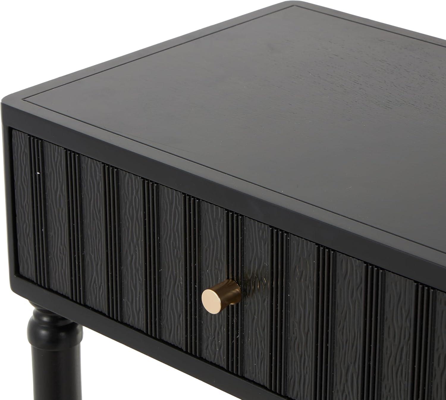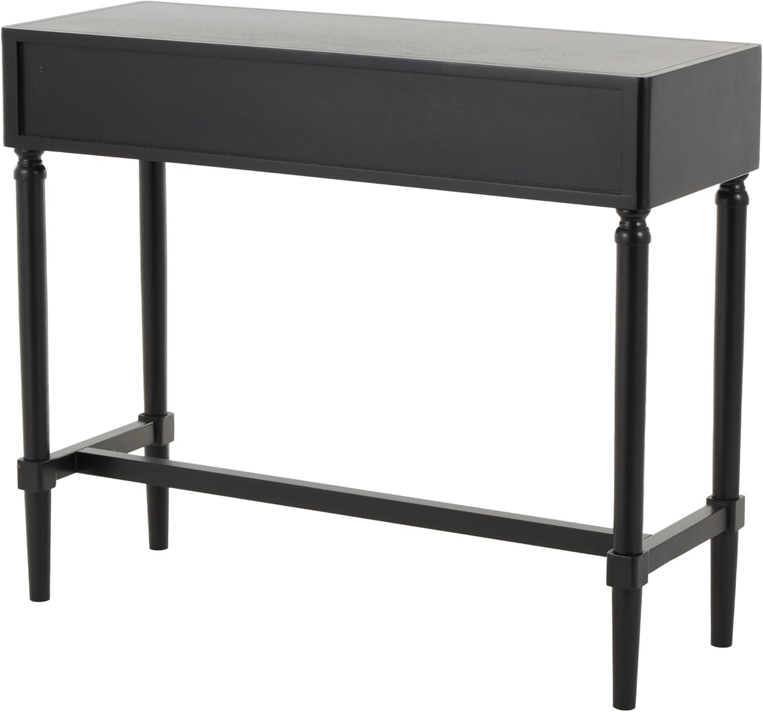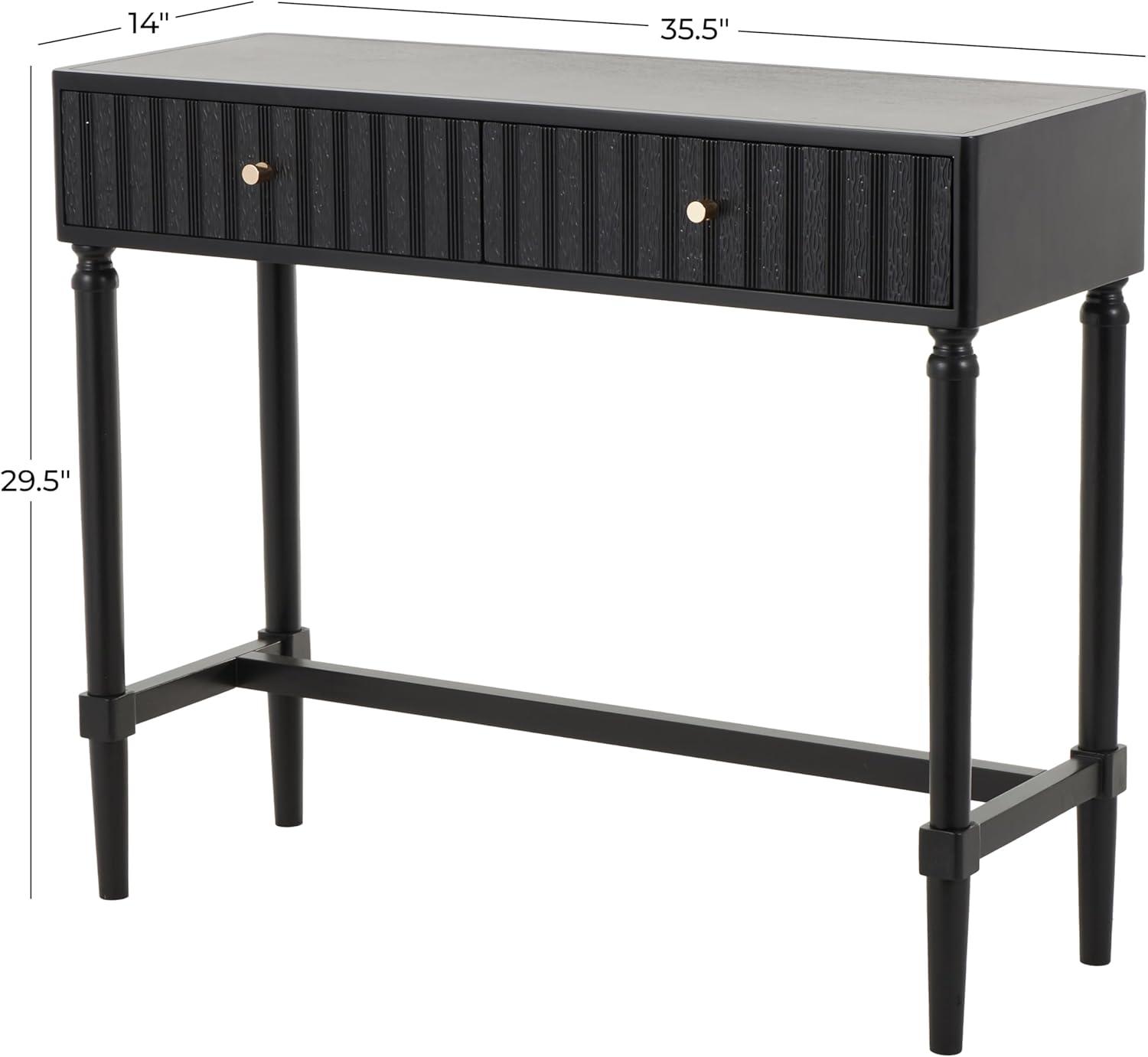 This contemporary home console table is carved from pine wood to create an elegant structure with two drawers, which is painted in black and furnished with sophisticated gold handles. The brushed black home table features a rectangular shape, round handles, and linear patterns on the drawers that enhance its sleek design. Wipe clean with a dry cloth. This black table adds a modern touch to the living room or entryway while providing functional storage solutions. This item ships in 1 carton. Black console table features 2 drawers with a 15 lbs weight limit, and side wood glides. Due to the handmade nature of this item, no two will be alike, there will be slight differences in shape, size, and color. Suitable for indoor use only. This item ships fully assembled in one piece. Maximum weight limit is 100 lbs. This is a single black colored kitchen table. Contemporary style.