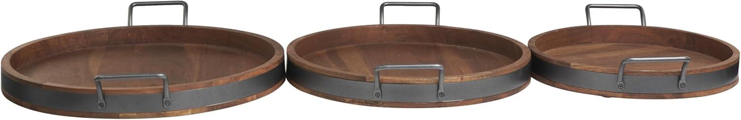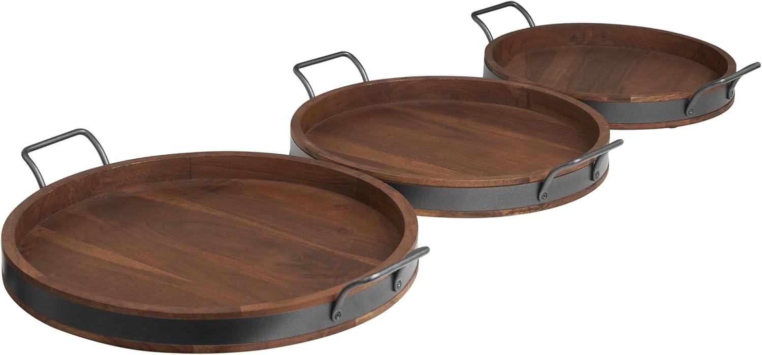 The tray is constructed with a solid mango wood frame and black metal handles for added stability. The sleek round design of these trays will add a modern touch to any room. Wipe clean with a dry cloth. These trays can be used to organize and store items in the kitchen, living room, or bedroom. Designed with felt or rubber stoppers at the base that prevent scratching furniture and table tops, as well as sliding around. This item ships in 1 carton. Please note that this item is for decorative purposes only and is not food safe. Acacia tray makes a great gift for any occasion. Suitable for indoor use only. This item ships fully assembled in one piece. Made in India. This brown colored acacia ottoman tray comes as a set of 3. Modern style.