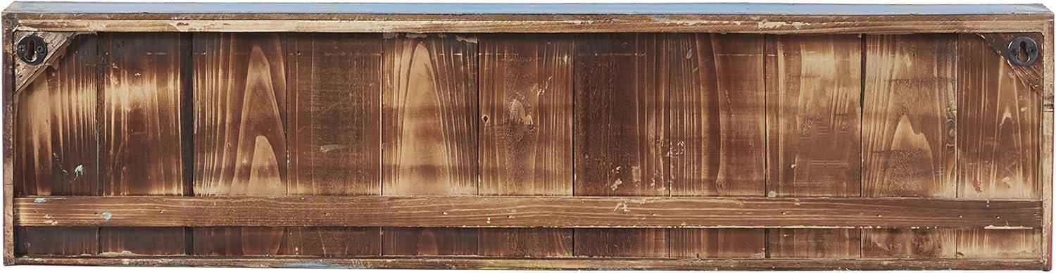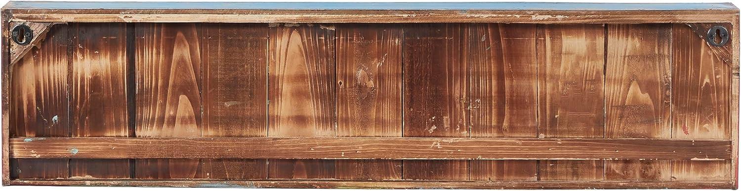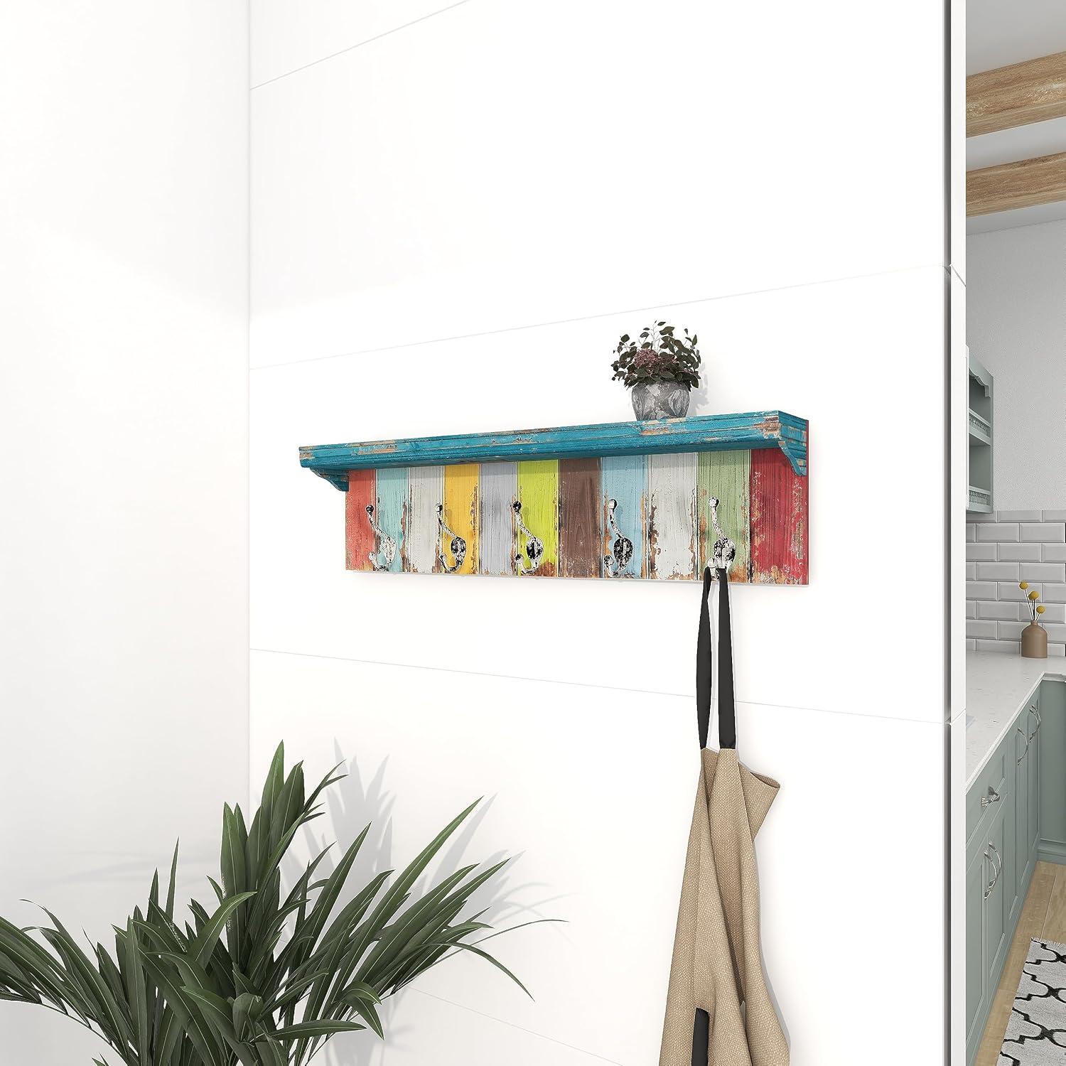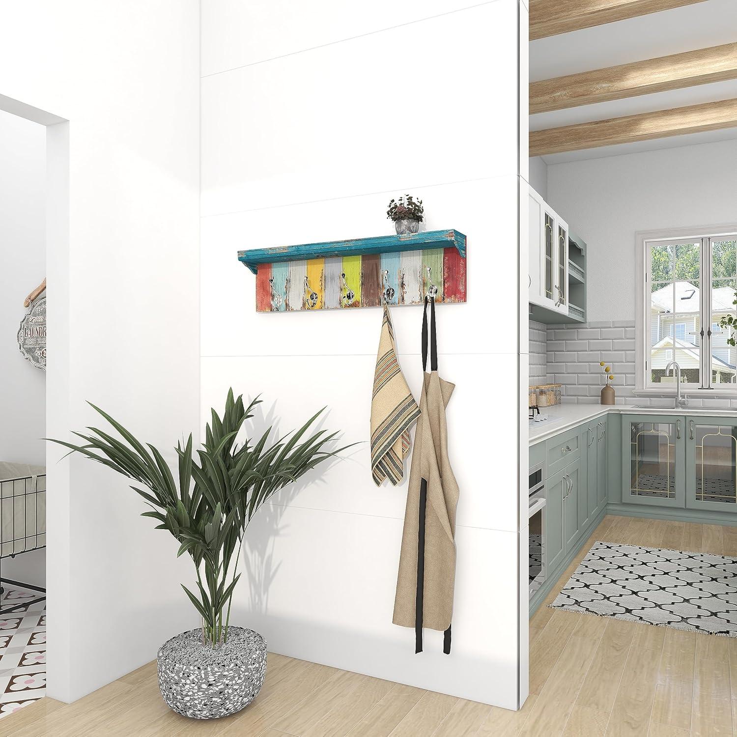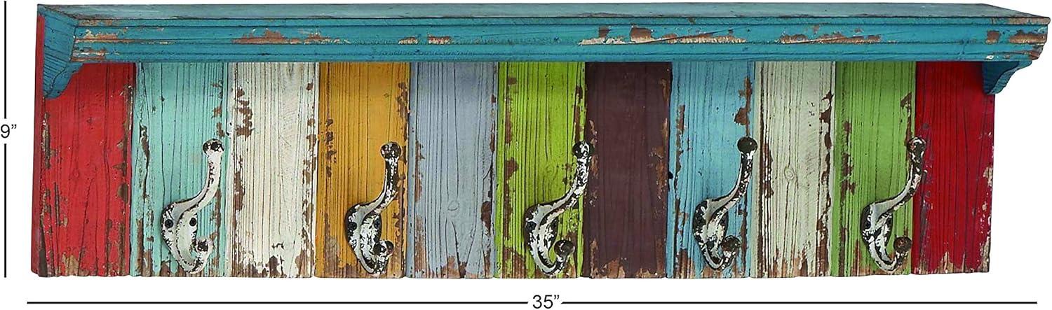 35 inch farmhouse rustic distressed finish wood, wood-style MDF and iron multi-color shelf and hook rack, distressed paint-finish over natural wood and MDF, turquoise beveled shelf with alternating vertical plank underhung of Barn red, sage green, rustic white, Pumpkin, faded Violet, moss green, cornflower Blue, Forest green and fire engine red, 5 distressed white paint-finish black iron double hooks.