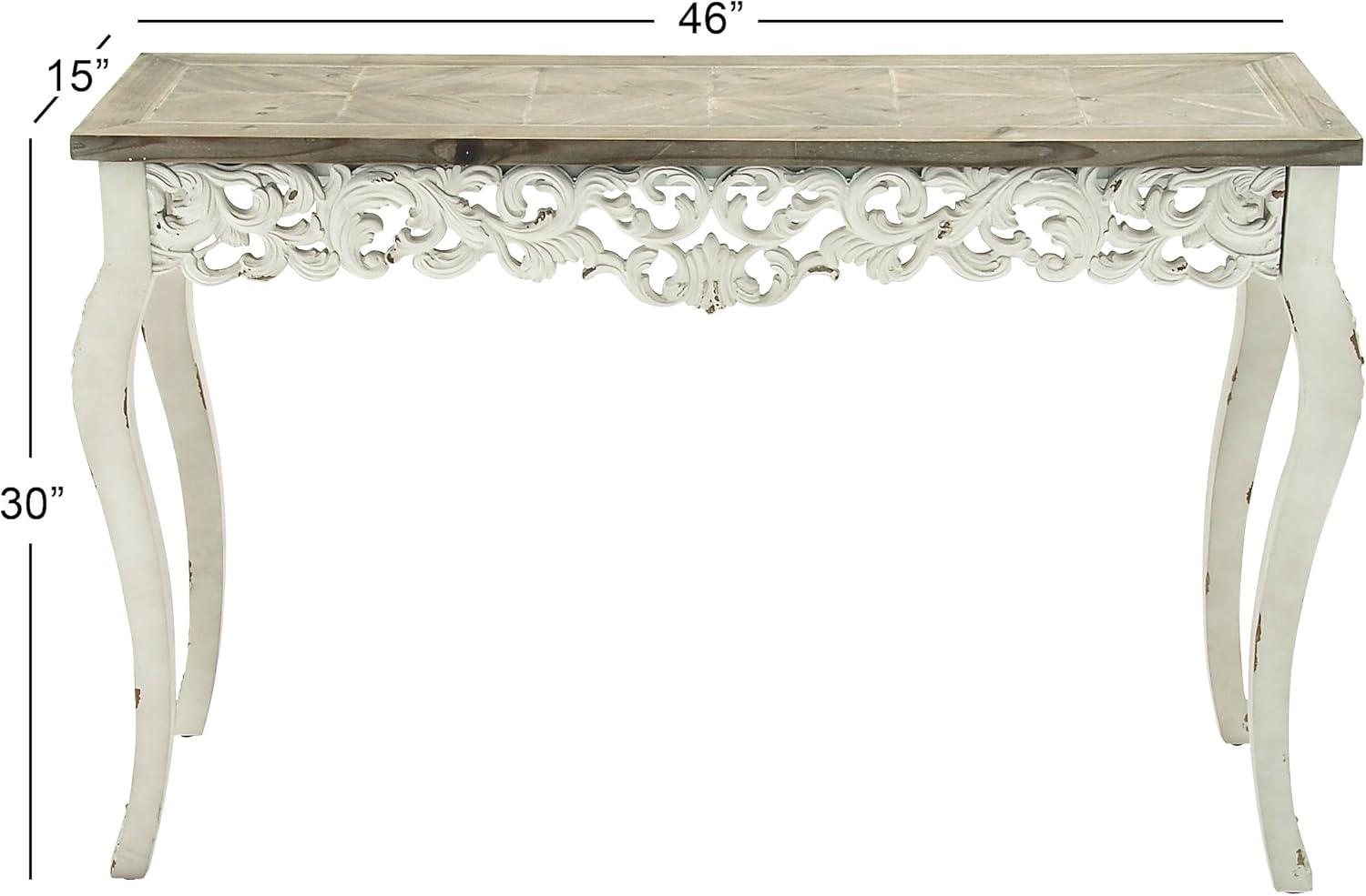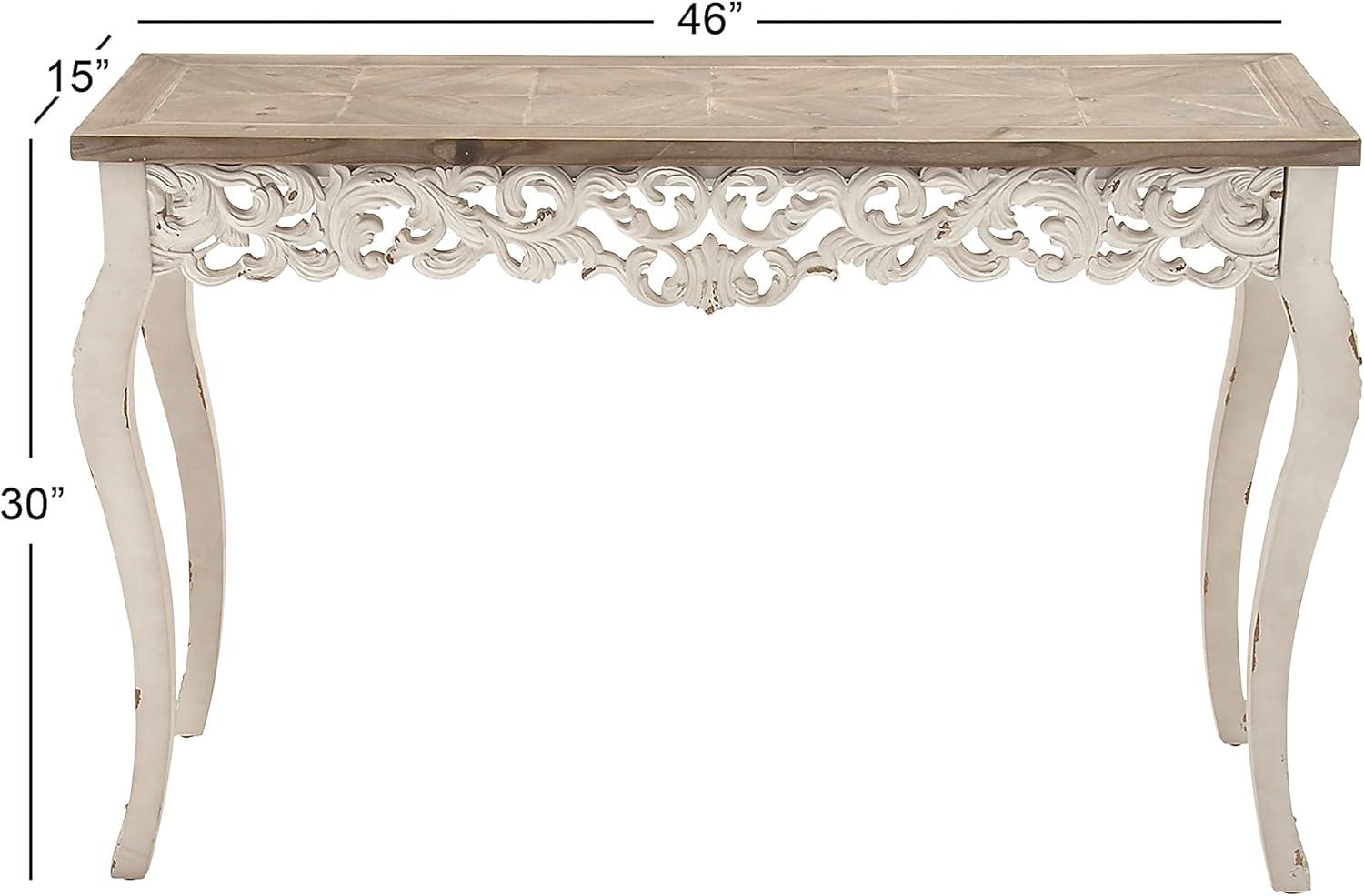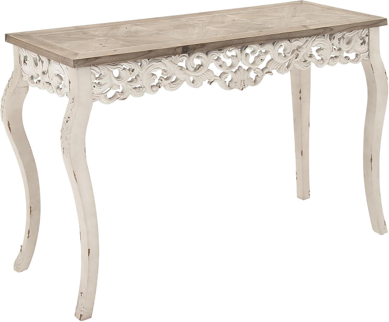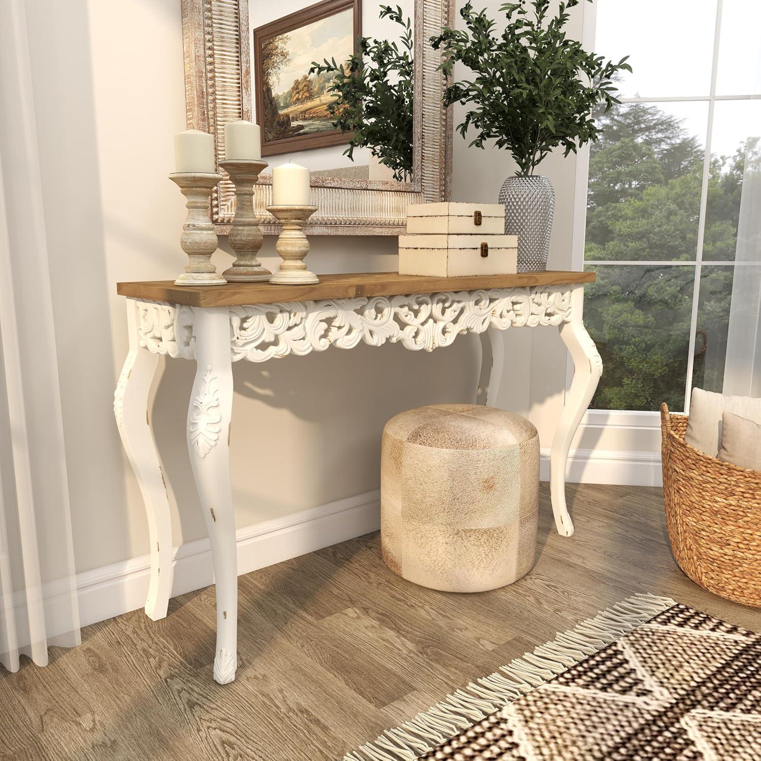 This console table is carved and attached birch wood materials. This console table features a rectangular surface with an elaborate scrolling design carved on the sides fixed to 4 curved legs. Wipe clean with a dry cloth. Bring a finishing touch to your home with an inviting appeal with this console table. A sturdy and long lasting construction for a years of enjoyment. Farmhouse wood carved console table will set a great first impression when displayed in entryways under a round wooden mirror. This item ships in 1 carton. Decorative wood carvings. Suitable for indoor use only. Some assembly required. Maximum weight limit is 75 lbs. This is a single white colored entryway table. Farmhouse style.