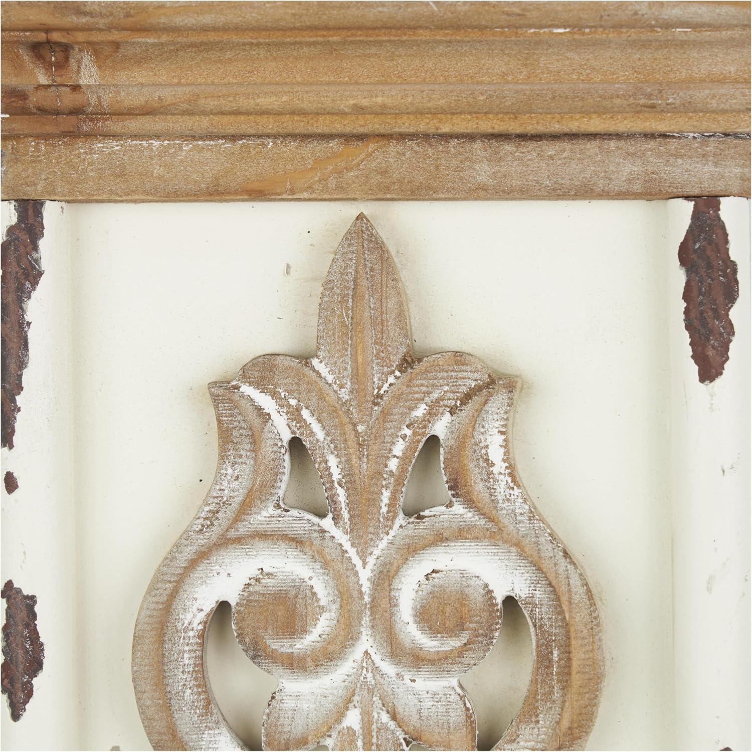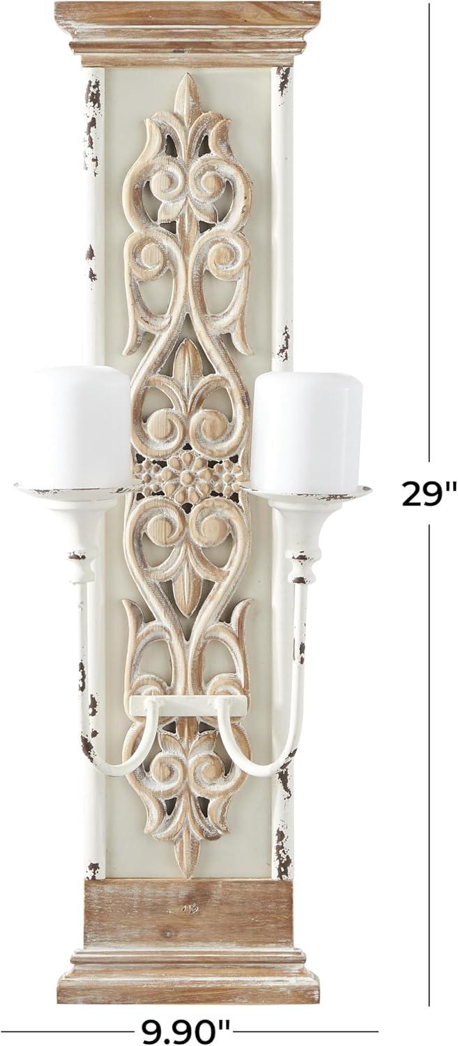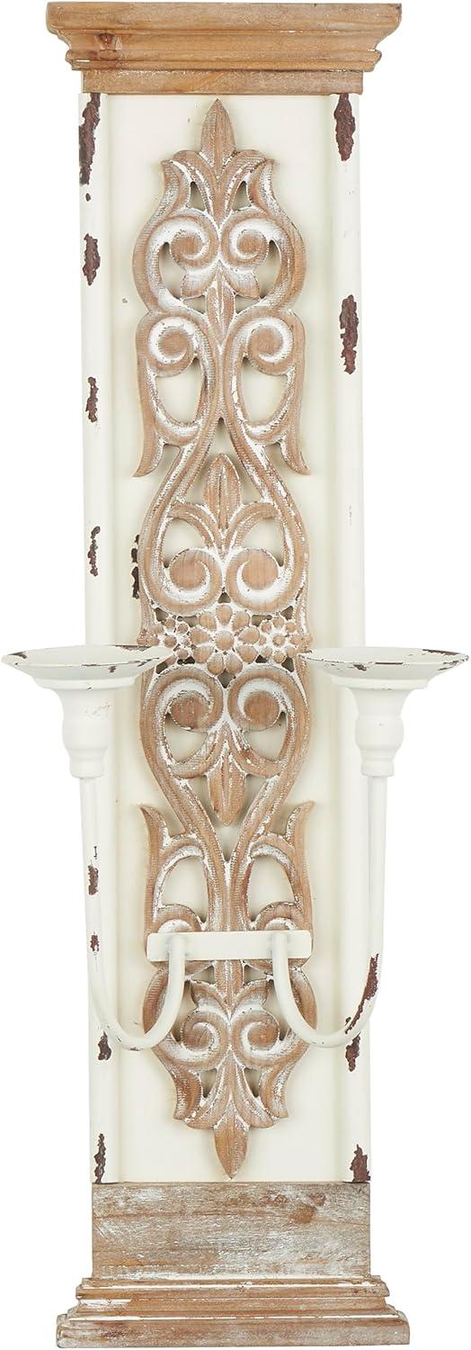SCROLL RECTANGLE WALL SCONCE: Decorative white wall sconce features beautiful carved flourishes on the wooden panel and 2 metal candle plates to hold pillar candles or tea light candles for the perfect ambience glow