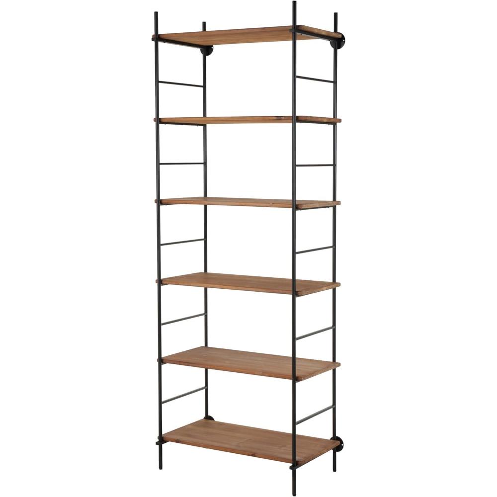 Traditional shelving unit is made with carved fir wood enclosed by metal welded ladder frames, showcasing expert craftsmanship. Oiled brown shelving unit's rectangular shape and ladder frame provides a classic yet functional design. Wipe clean with a dry cloth. This brown shelving unit is perfect for displaying decor pieces in living rooms, offices, or libraries. This item ships in 1 carton. Suitable for indoor use only. This item ships fully assembled in one piece. Maximum weight limit is 100 lbs. This is a single brown colored display shelf. Fir shelving unit features 6 shelves. Traditional style.