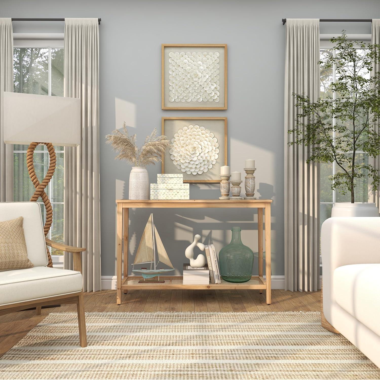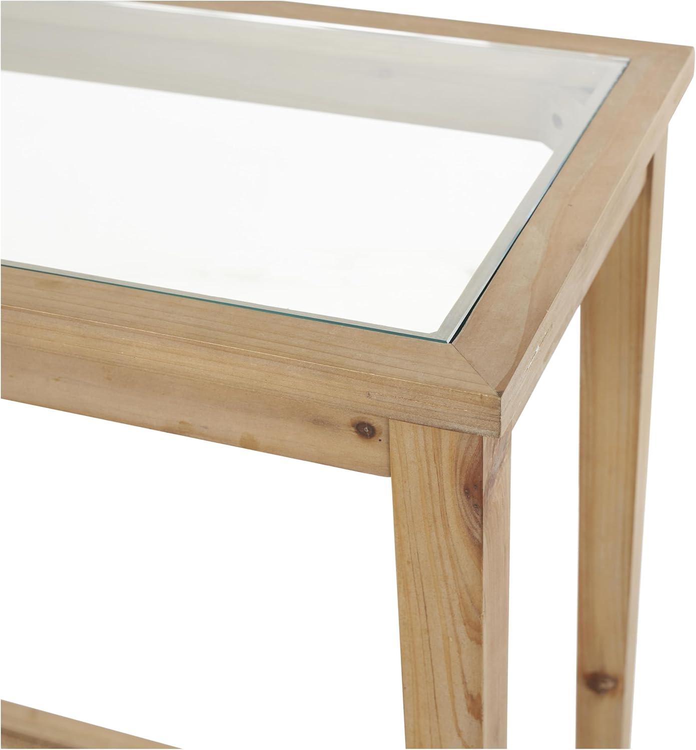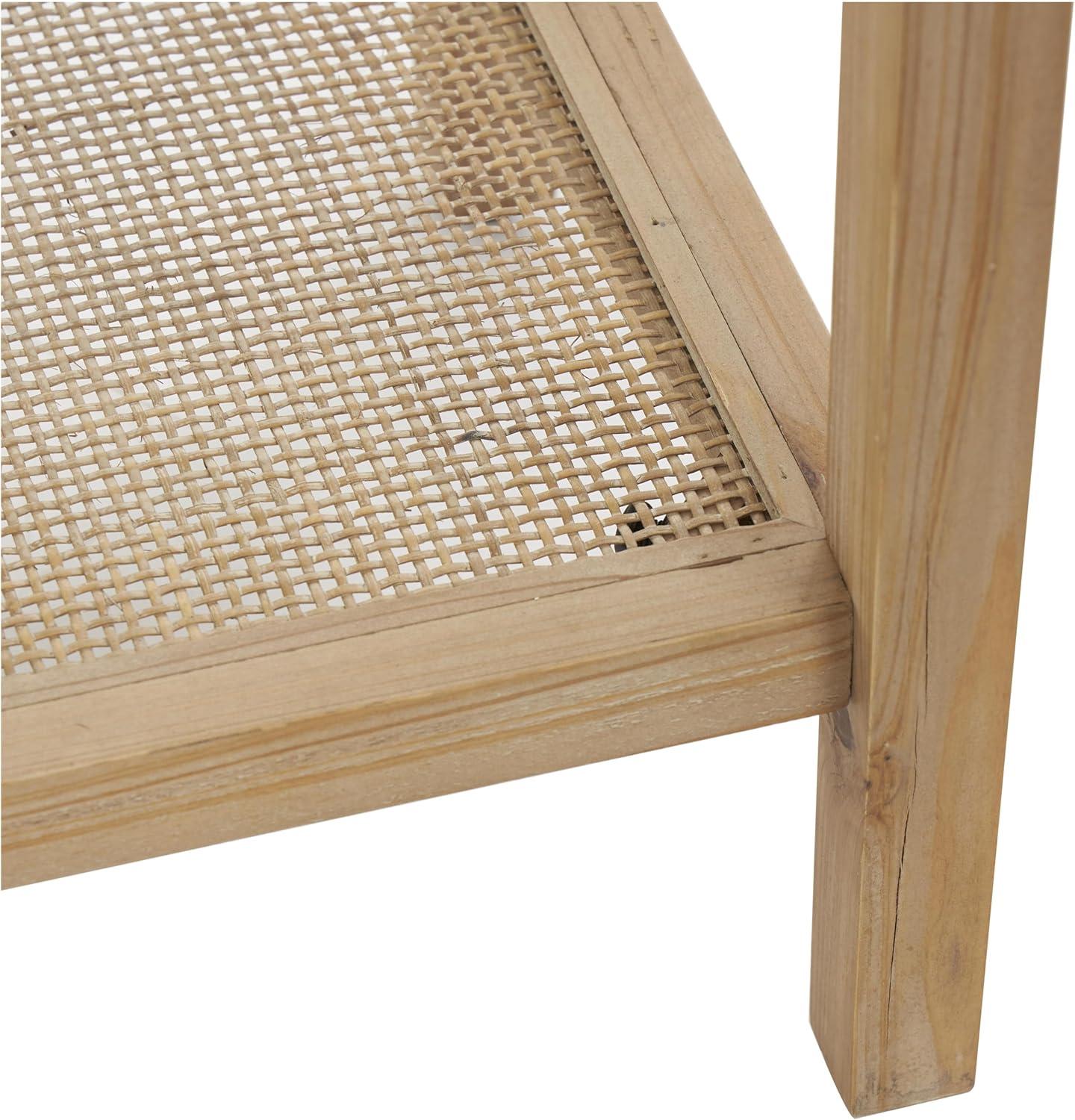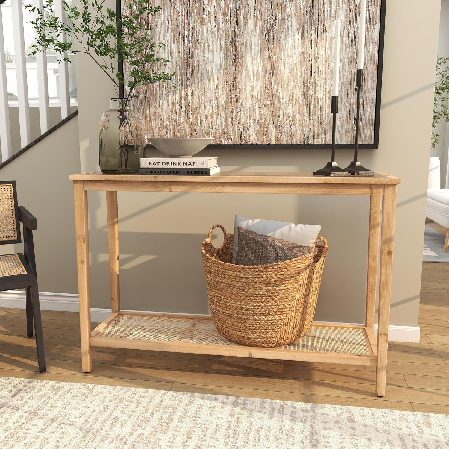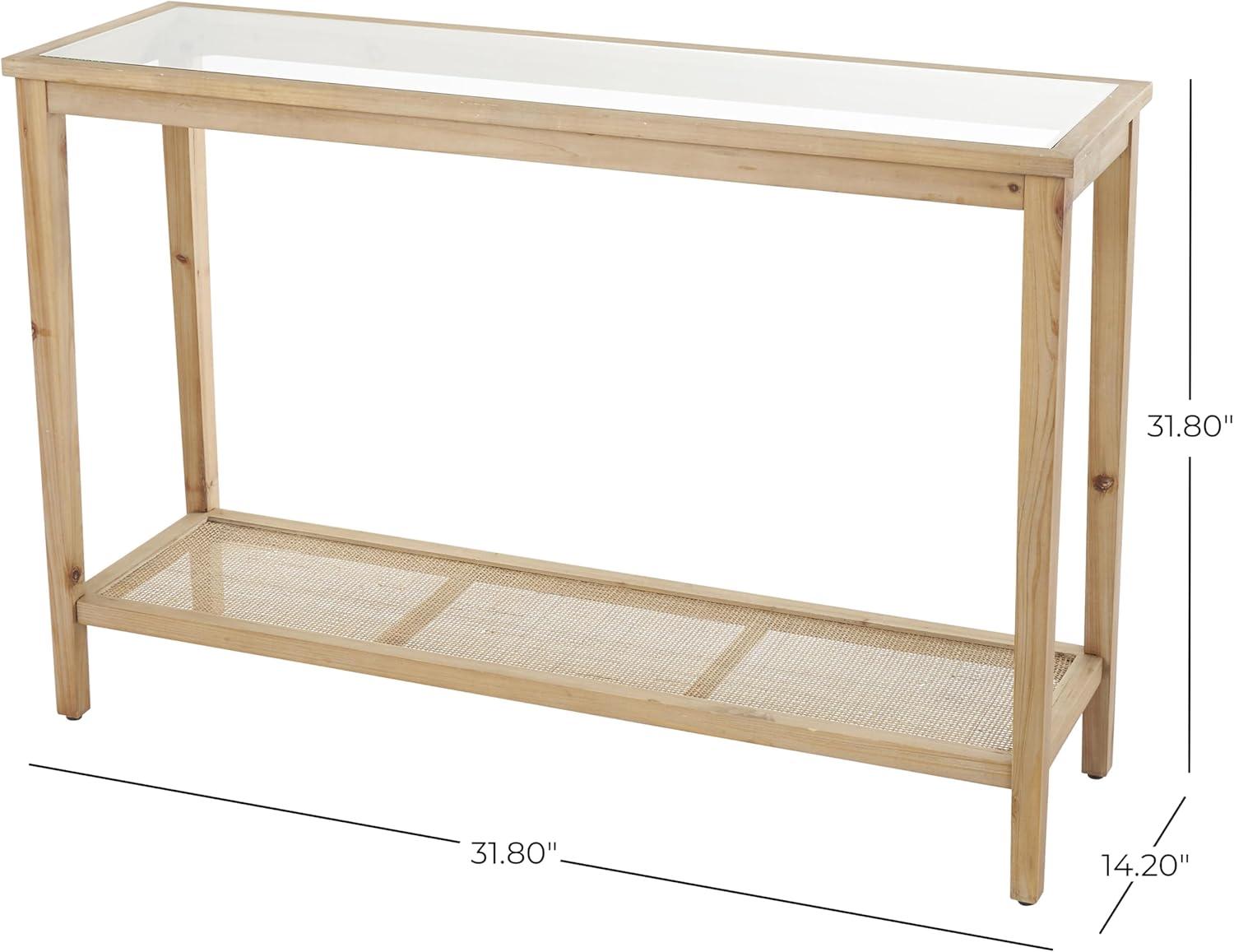 Expertly crafted from cut and carved wood pieces and screwed into place, with a glass panel that rests on the frame. A stylish entryway console that showcases a rectangular silhouette with a rattan shelf in a grid mesh-inspired design. Wipe clean with a dry cloth. Bring a finishing touch to your home for an inviting appeal with this console table. A stylish way to keep your belongings organized in the home. The narrow width of this wood console table makes it a great entryway table or sofa table to display plants, framed pictures, books, and small table decor. This item ships in 1 carton. Suitable for indoor use only. This item ships fully assembled in one piece. Maximum weight limit is 50 lbs. This is a single brown colored entryway table. Wood console table features a single shelf. Modern style.
