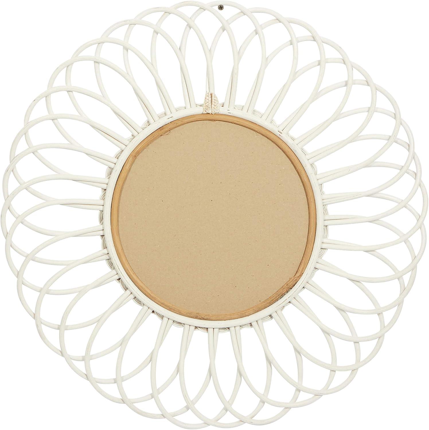 FEATURES ROUND WALL MIRROR Floral wall mirrors showcasing a finely crafted ring of petals made from dried fibers and a braided mirror frame design