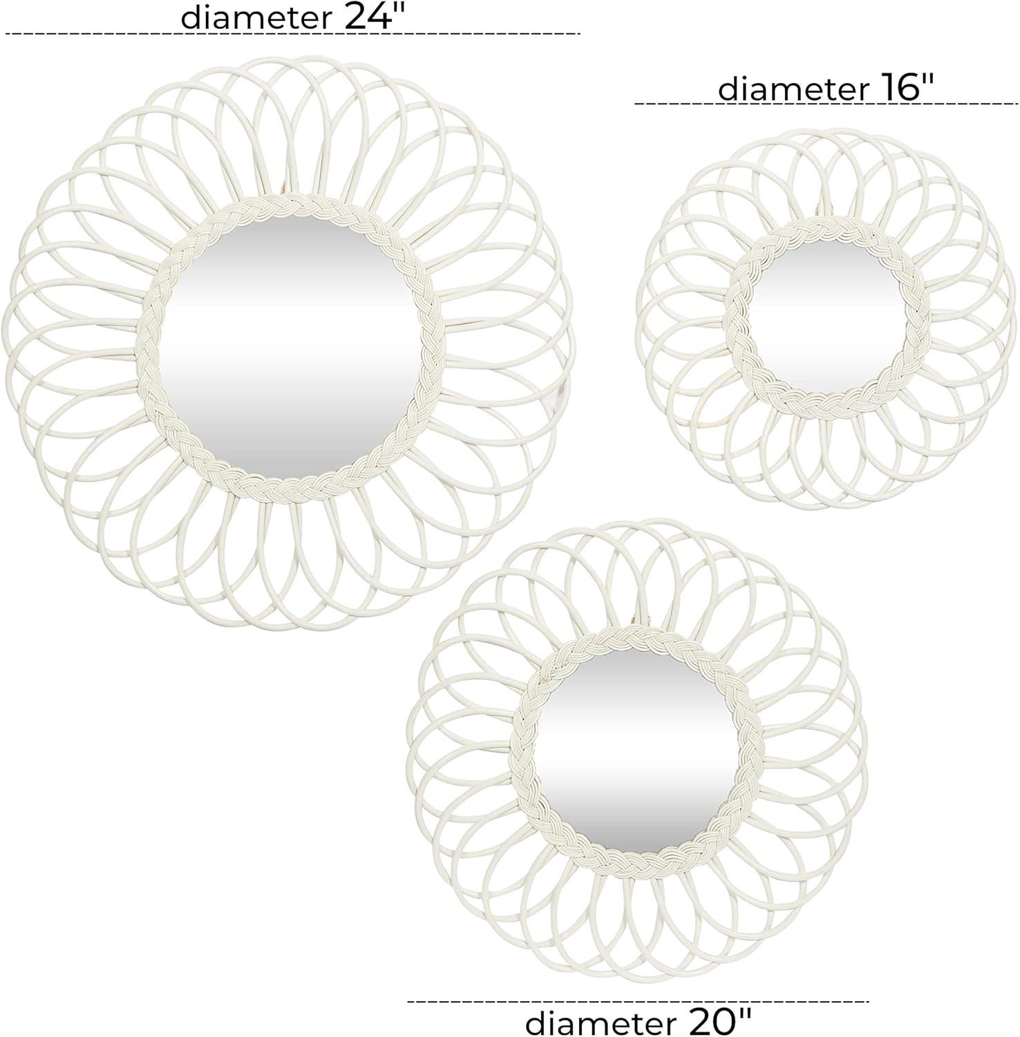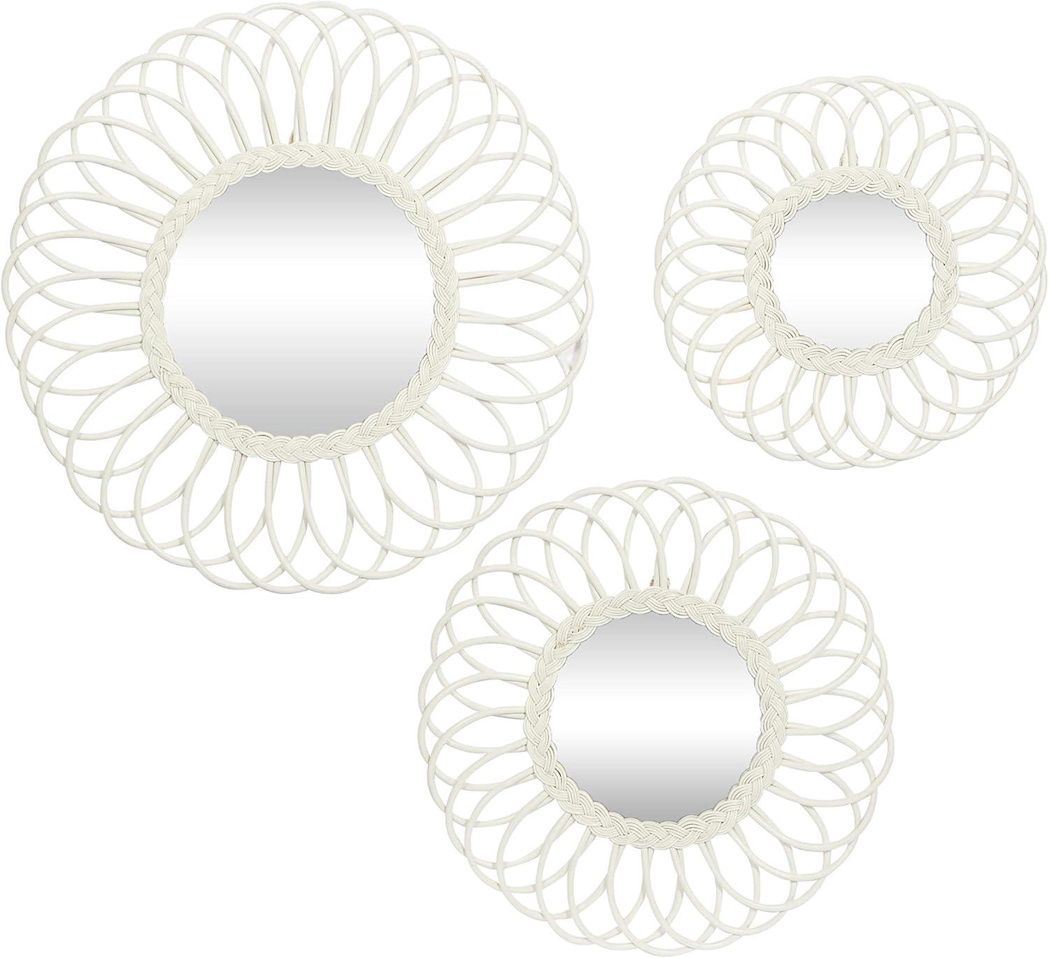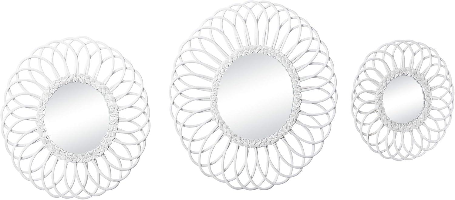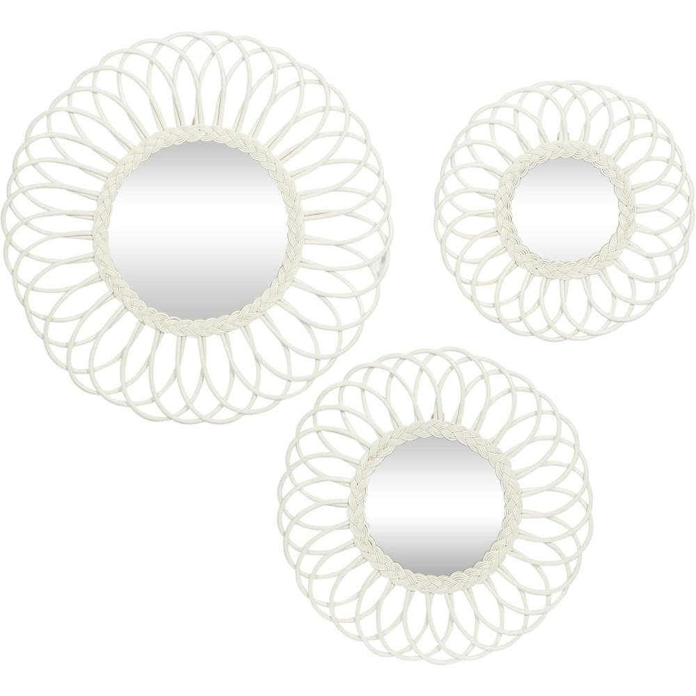 These decorative wall mirrors are great accent pieces for light-toned backgrounds with natural decorations and wooden-themed furniture. This item ships in 1 carton. Can be hung vertically using the jute rope; nails and screws not included. Suitable for indoor use only. This item ships fully assembled in one piece. Made in Vietnam. This white colored entryway mirror comes as a set of 3. Traditional style.