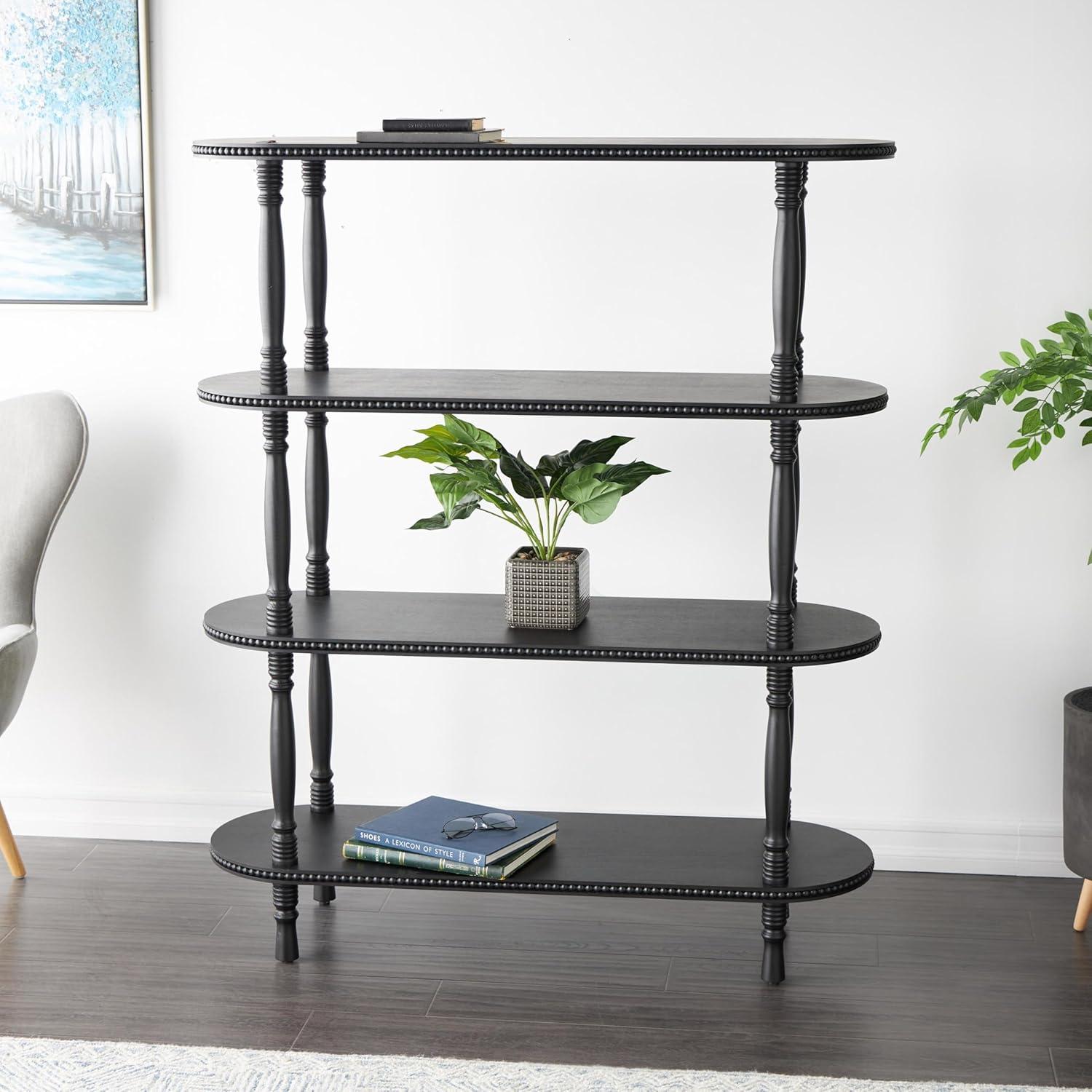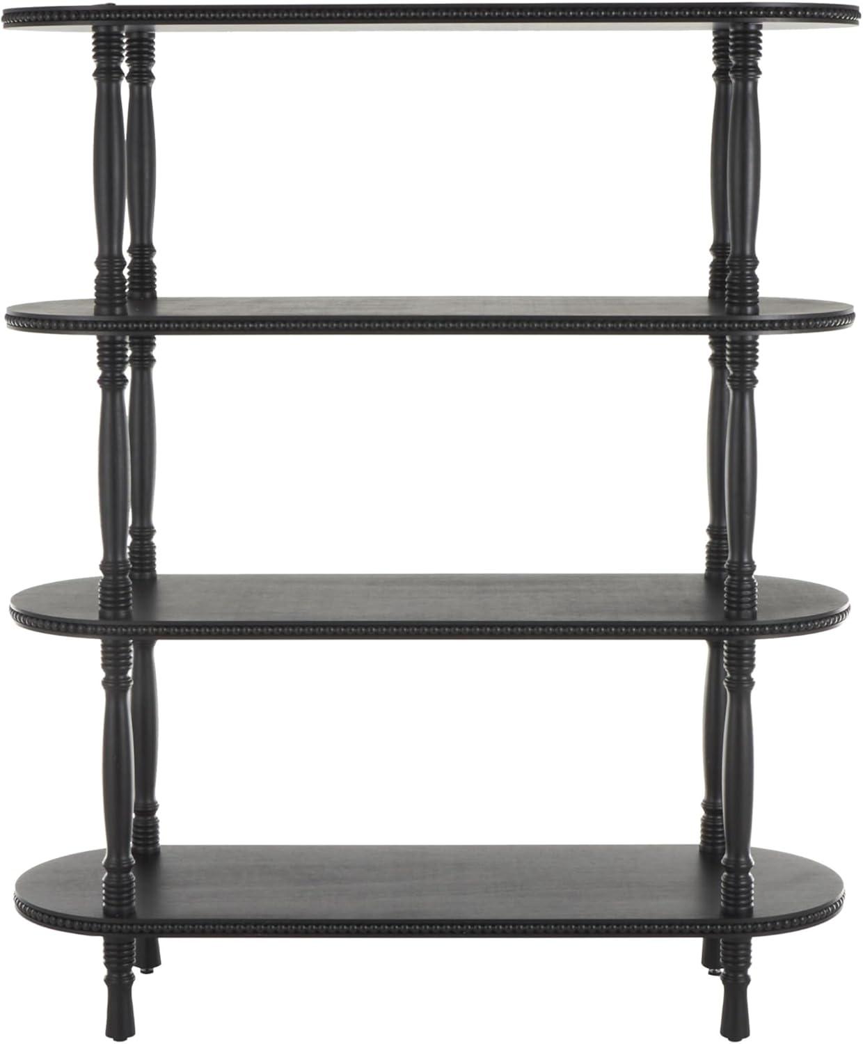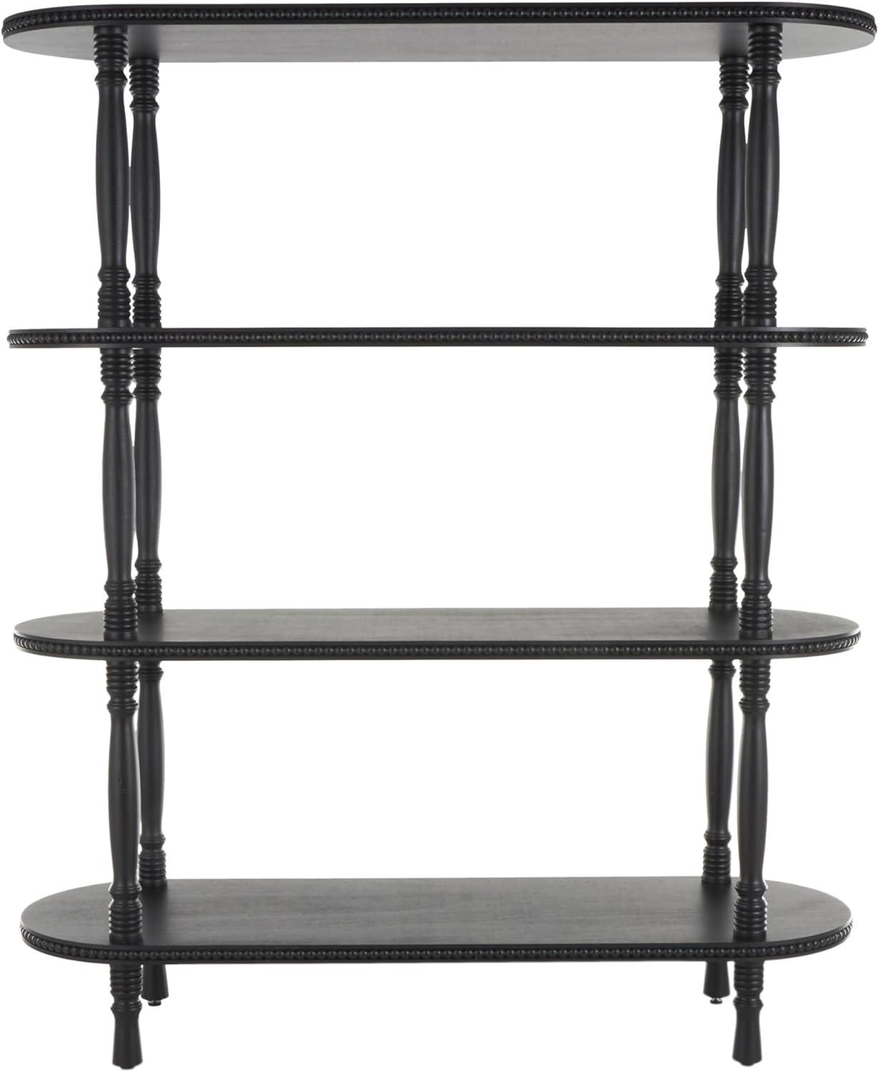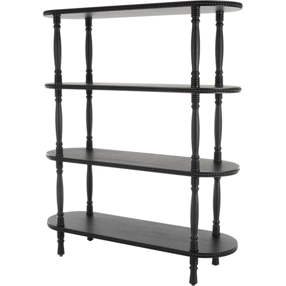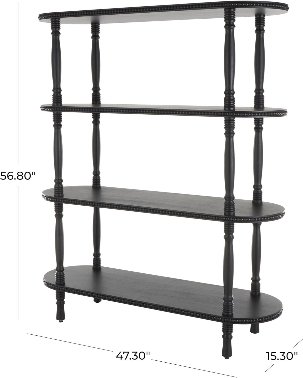 Fir wood and engineered wood is cut and carved for the entire structure of this sturdy shelving unit. Accentuates a vertical rectangular form with turned wood leg stands. Wipe clean with a dry cloth. Keep a clutter free home with this durable and expertly crafted shelving unit. Display your favorite books, photos, and memorabilia with style with this shelving unit. Display your books, home decorative or organize your belongings with this farmhouse wooden shelf for a chic and convenient addition to your home space. Designed with felt or rubber stoppers at the base that prevent scratching furniture and table tops, as well as sliding around. This item ships in 1 carton. Suitable for indoor use only. This item ships fully assembled in one piece. Maximum weight limit is 30 lbs. This is a single white colored display shelf. Wood shelving unit features 5 shelves. Farmhouse style.