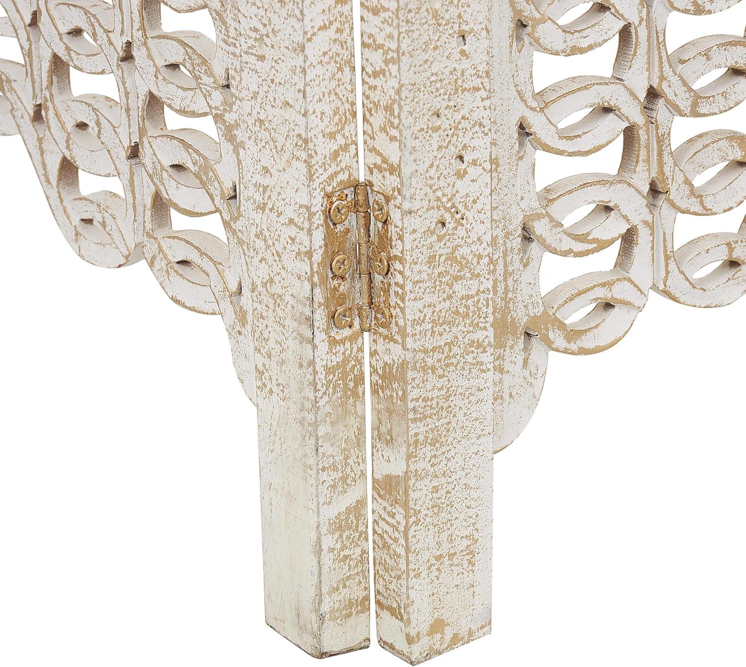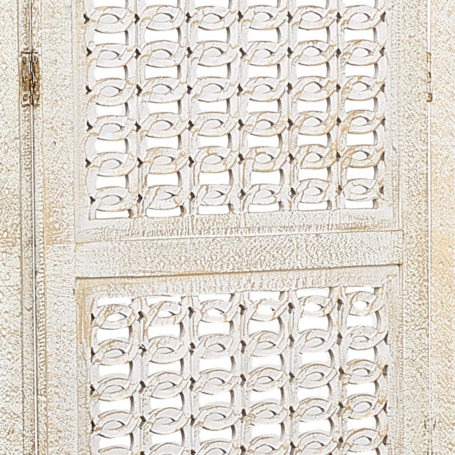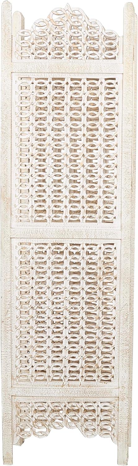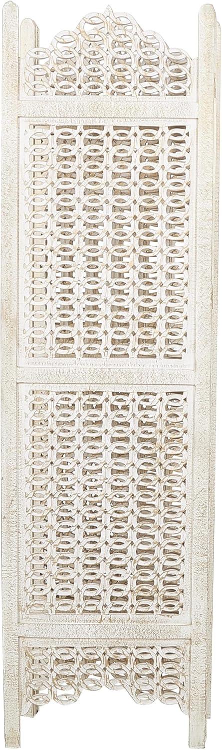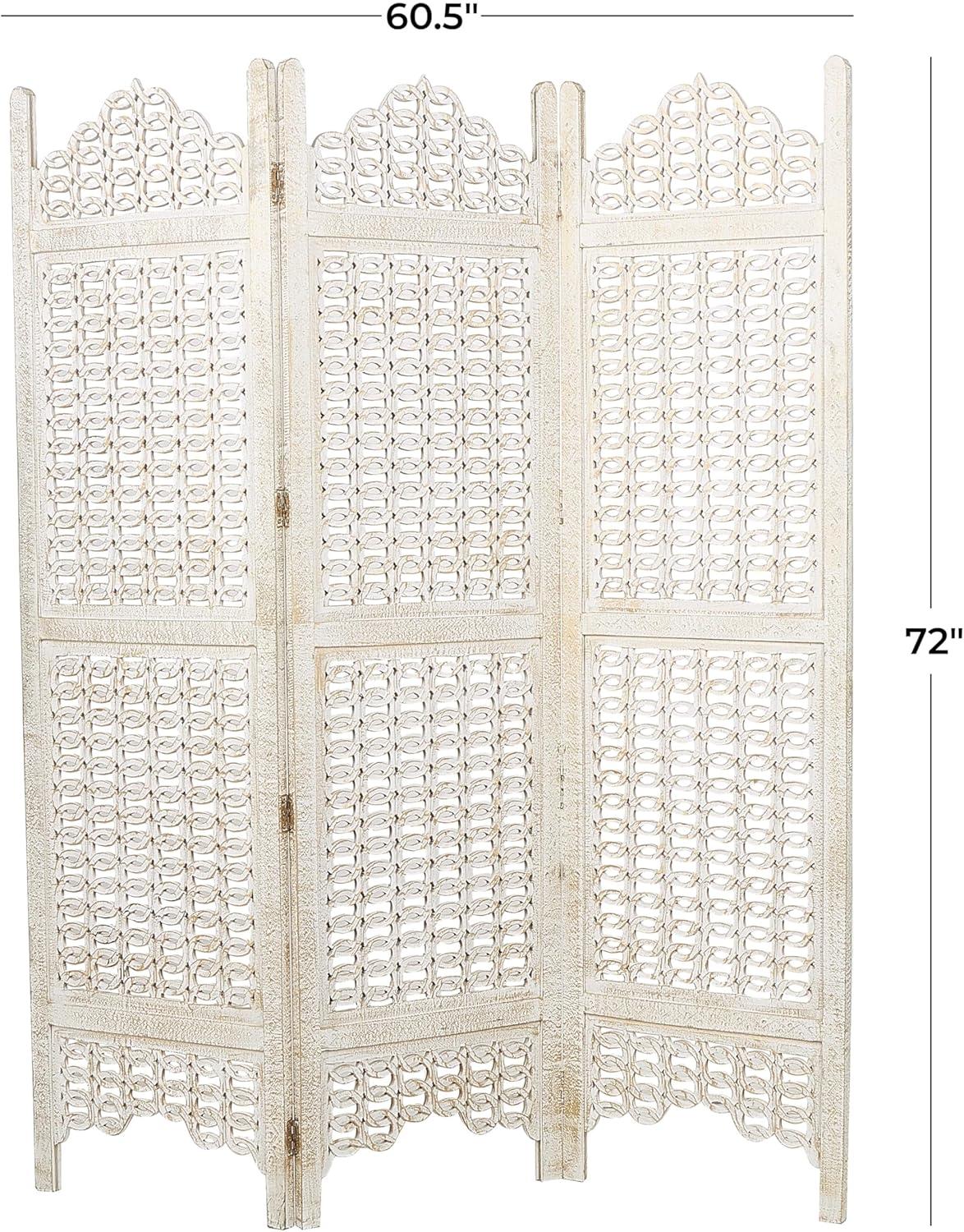 This farmhouse partition room divider is constructed from expertly cut and painted mango wood and MDF panels, with metal hinges attached at the sides for adjustability. Distressed cream room divider panel offers three rectangular sections with arches at the top and a geometric chain link pattern throughout, creating an aesthetically pleasing shape. Wipe clean with a dry cloth. This geometric privacy screen can be used in the living room or bedroom for privacy, as well as a decorative backdrop or unique way to section off areas within larger spaces. This item ships in 1 carton. Due to the handmade nature of this item, no two will be alike, there will be slight differences in shape, size, and color. Suitable for indoor use only. This item ships fully assembled in one piece. Made in India. Item features 3 panel screens. This is a single cream colored folding panel partition. Farmhouse style.
