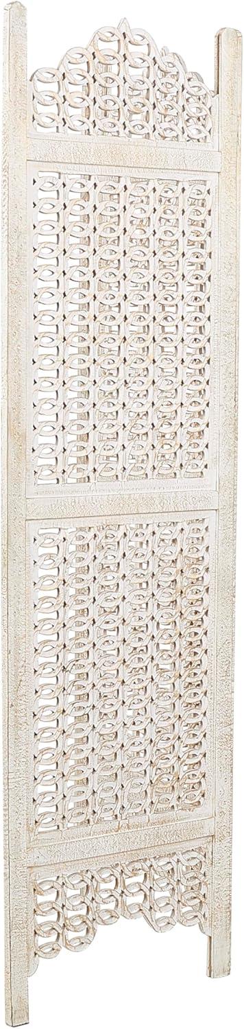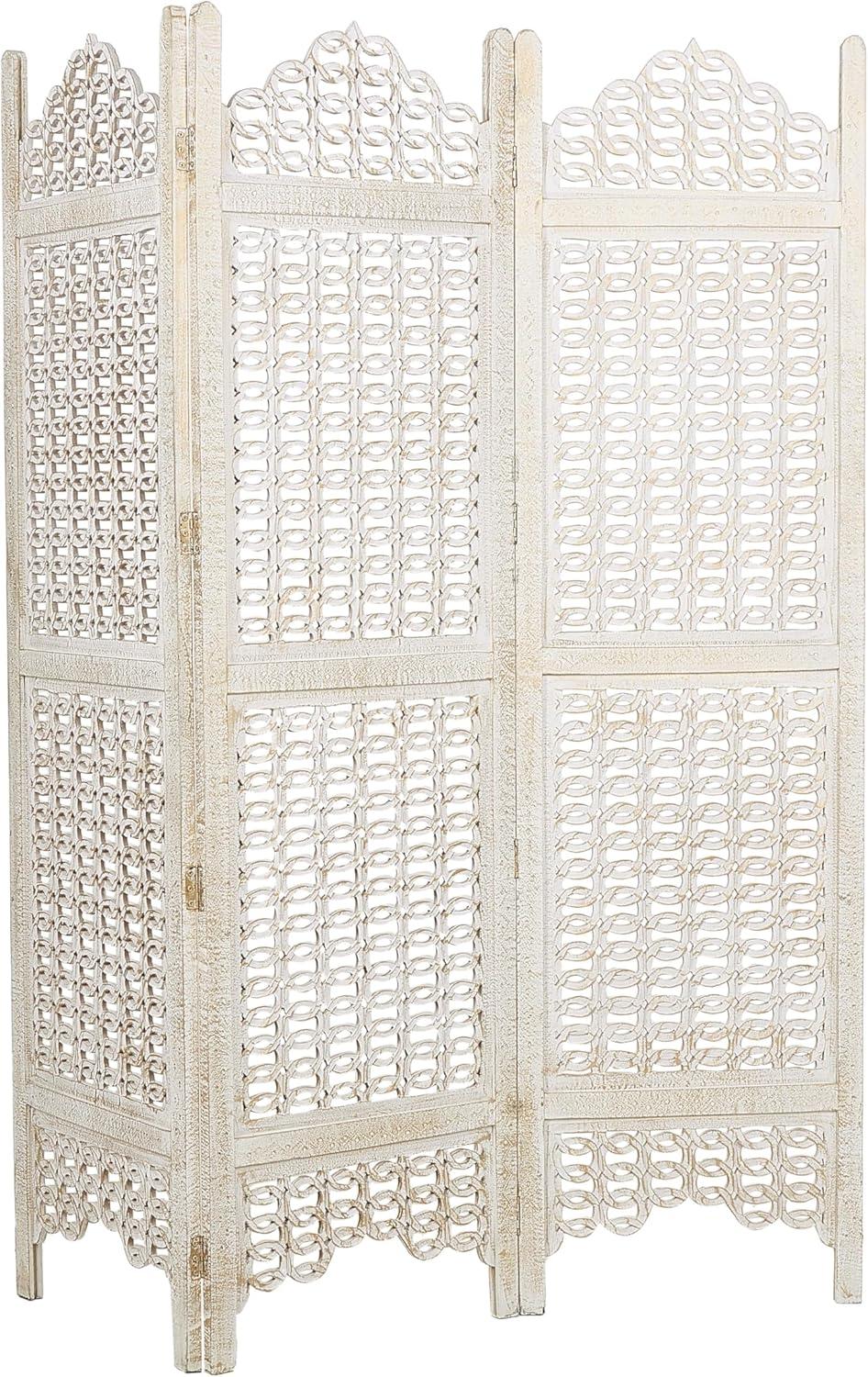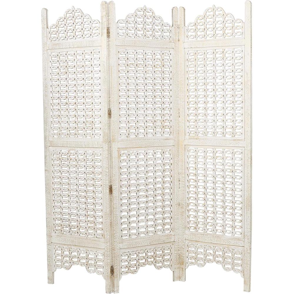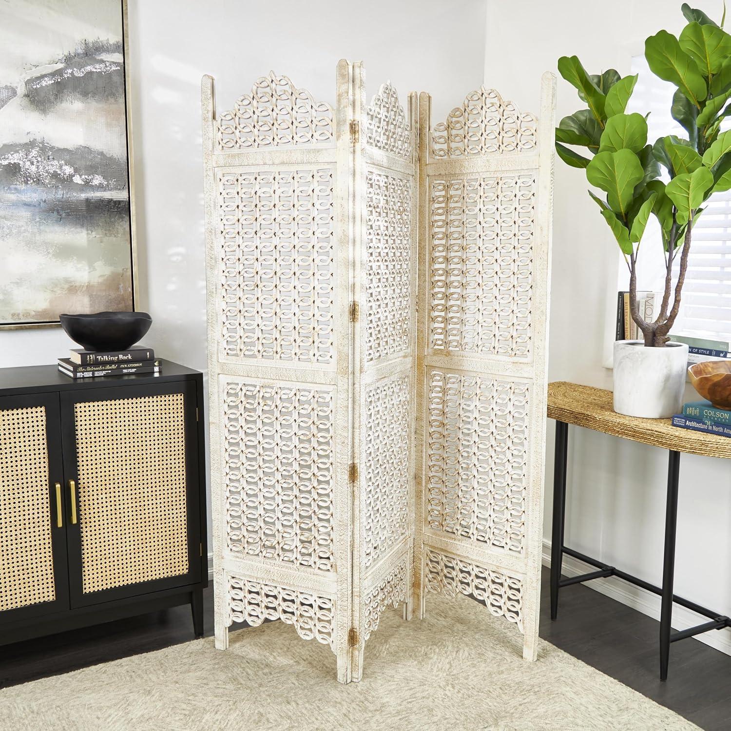 This farmhouse partition room divider is constructed from expertly cut and painted mango wood and MDF panels, with metal hinges attached at the sides for adjustability. Distressed cream room divider panel offers three rectangular sections with arches at the top and a geometric chain link pattern throughout, creating an aesthetically pleasing shape. Wipe clean with a dry cloth. This geometric privacy screen can be used in the living room or bedroom for privacy, as well as a decorative backdrop or unique way to section off areas within larger spaces. This item ships in 1 carton. Due to the handmade nature of this item, no two will be alike, there will be slight differences in shape, size, and color. Suitable for indoor use only. This item ships fully assembled in one piece. Made in India. Item features 3 panel screens. This is a single cream colored folding panel partition. Farmhouse style.