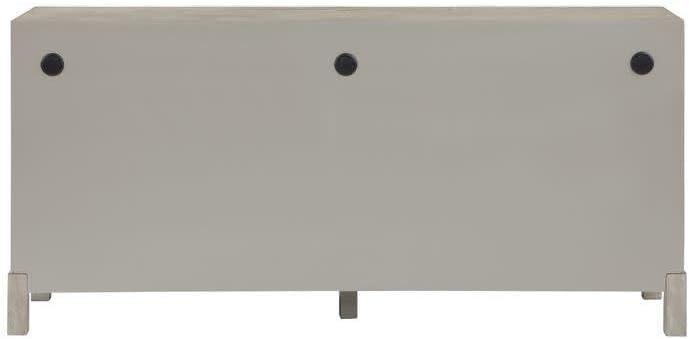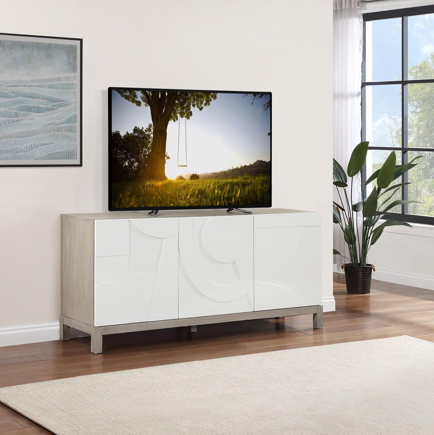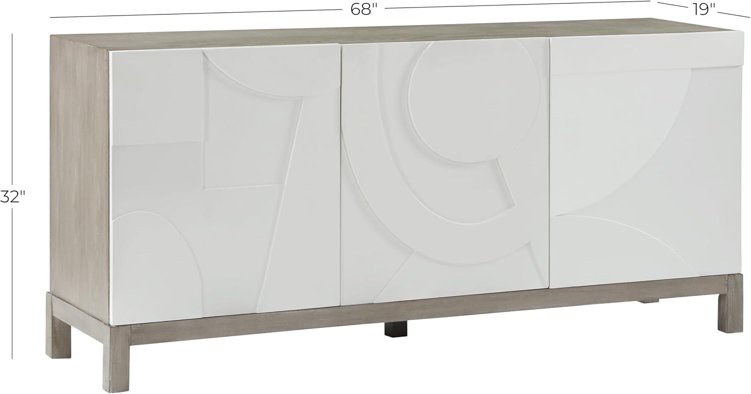 This modern sideboard is carved from rubber wood with a washed finish applied, oak veneer encasing it, and a matte white geometric front attached, highlighting the natural beauty of its materials. Matte white storage sideboard for room has a sleek rectangular shape with square doors that have a geometric pattern. Wipe clean with a dry cloth. The white storage sideboard is perfect for enhancing your living room, entryway, or dining room, offering ample space for organizing essentials and displaying decor pieces. Adjustable levelers provide stability on uneven surfaces. Includes anti-tipping hardware to prevent tipping. A brown rectangular sideboard featuring 3 doors with European hinges, 1 drawer, and 2 shelves. This item ships in 1 carton. Cord management ports ensure all cables stay organized. White sideboard features a single drawer with full extension drawer glide. Suitable for indoor use only. Some assembly required. Maximum weight limit is 150 lbs. Made in Vietnam. This is a single white colored credenza. Mdf sideboard features 3 fixed shelves. Modern style.
