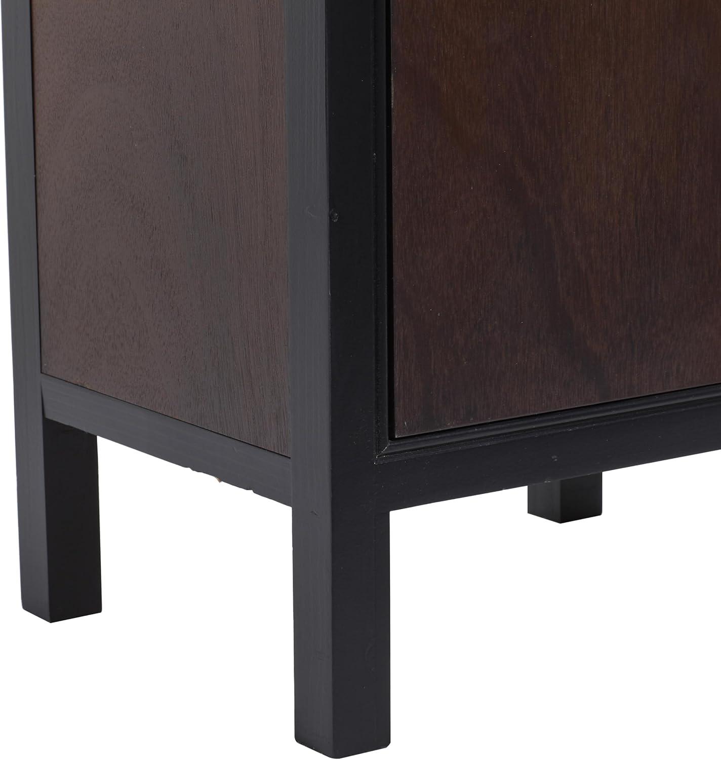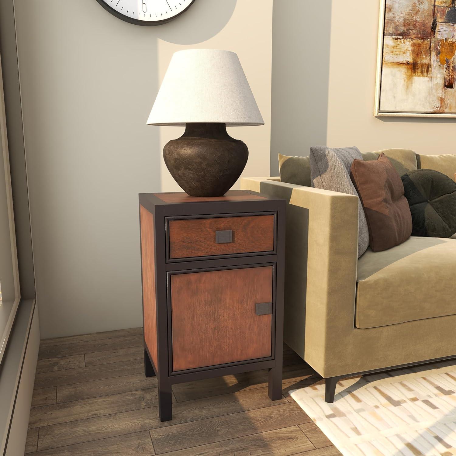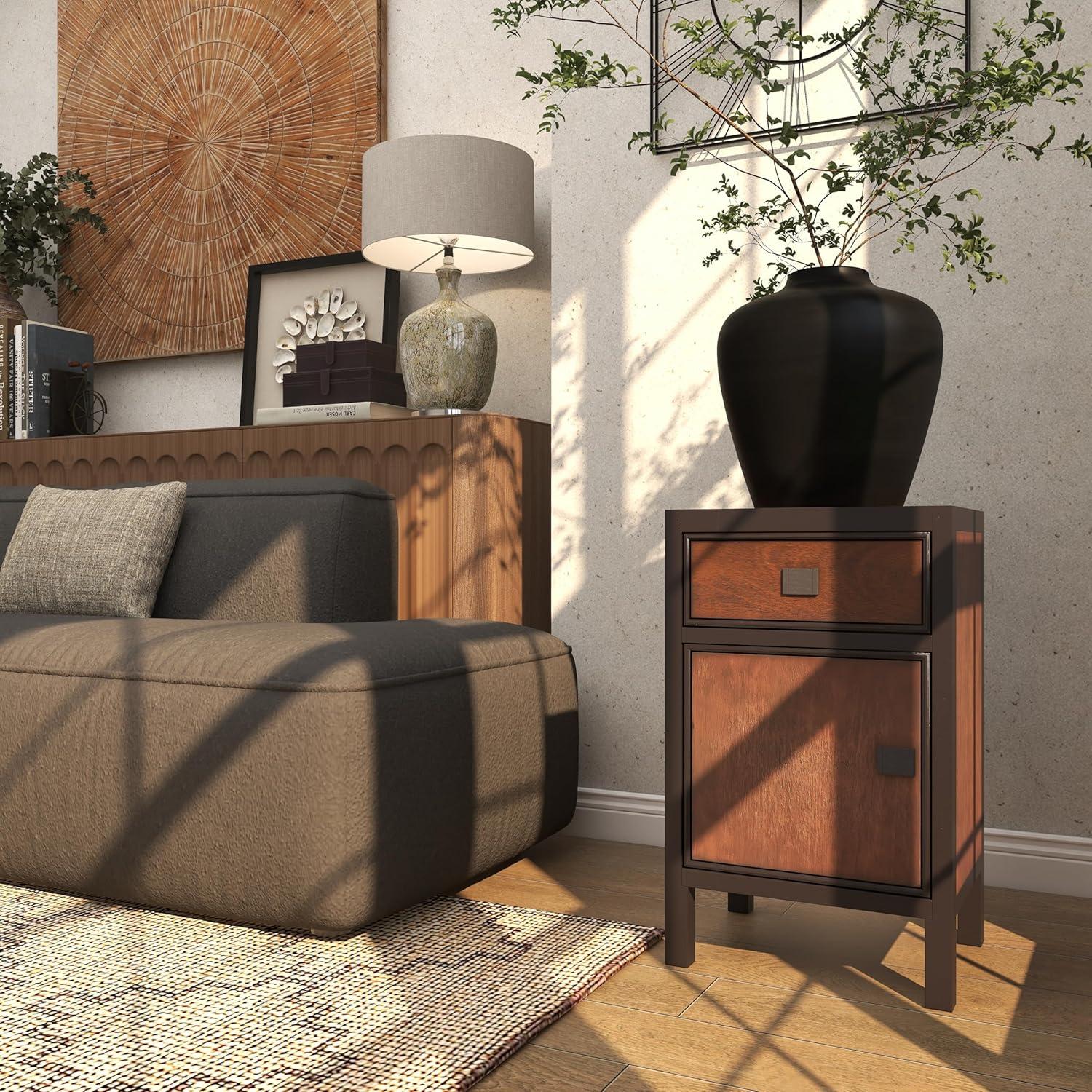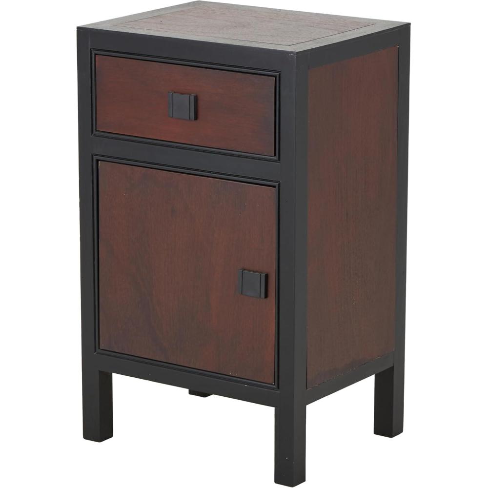 A practical yet stylish upgrade that instantly elevate the look of your room. Maintain a clutter free zone and stay organize with this chic cabinet. Small end table carries a modern design that will work best with other dark wooden furniture and upholstered seating. This cabinet has an interior that measures 15″L x 11.25″W x 11.75″H. This item ships in 1 carton. Dark brown cabinet features a single drawer. Features one slide-out drawer and one cabinet door. Suitable for indoor use only. This item ships fully assembled in one piece. Maximum weight limit is 30 lbs. This is a single dark brown colored storage cabinet. Mdf cabinet features a single shelf. Contemporary style.