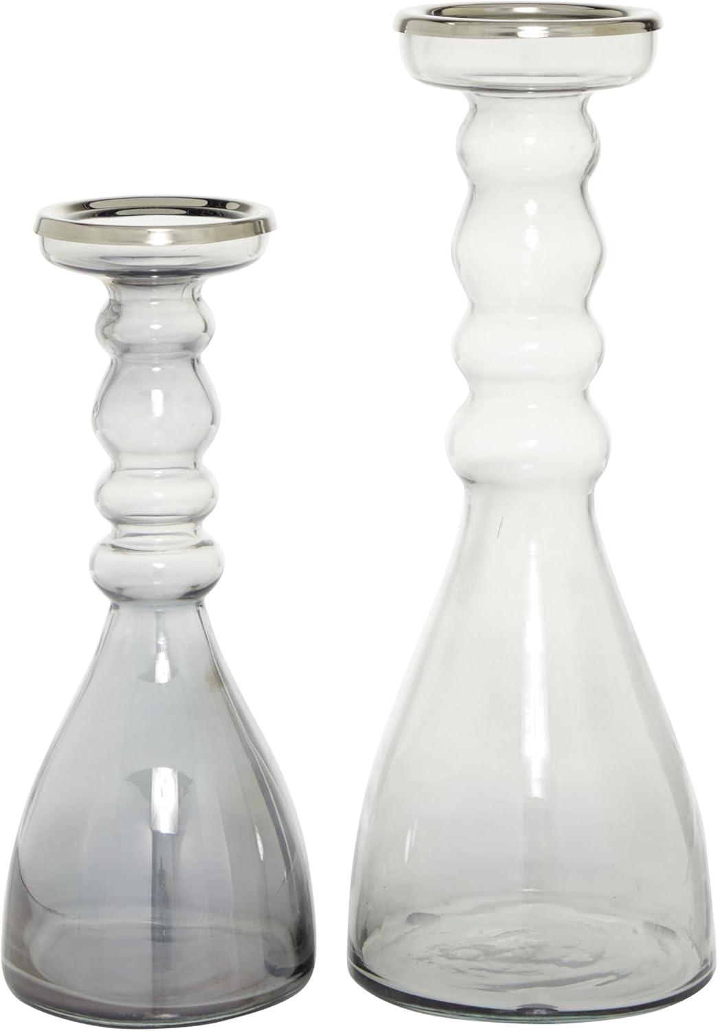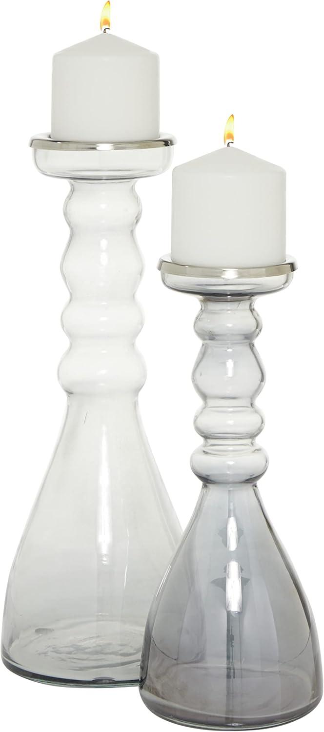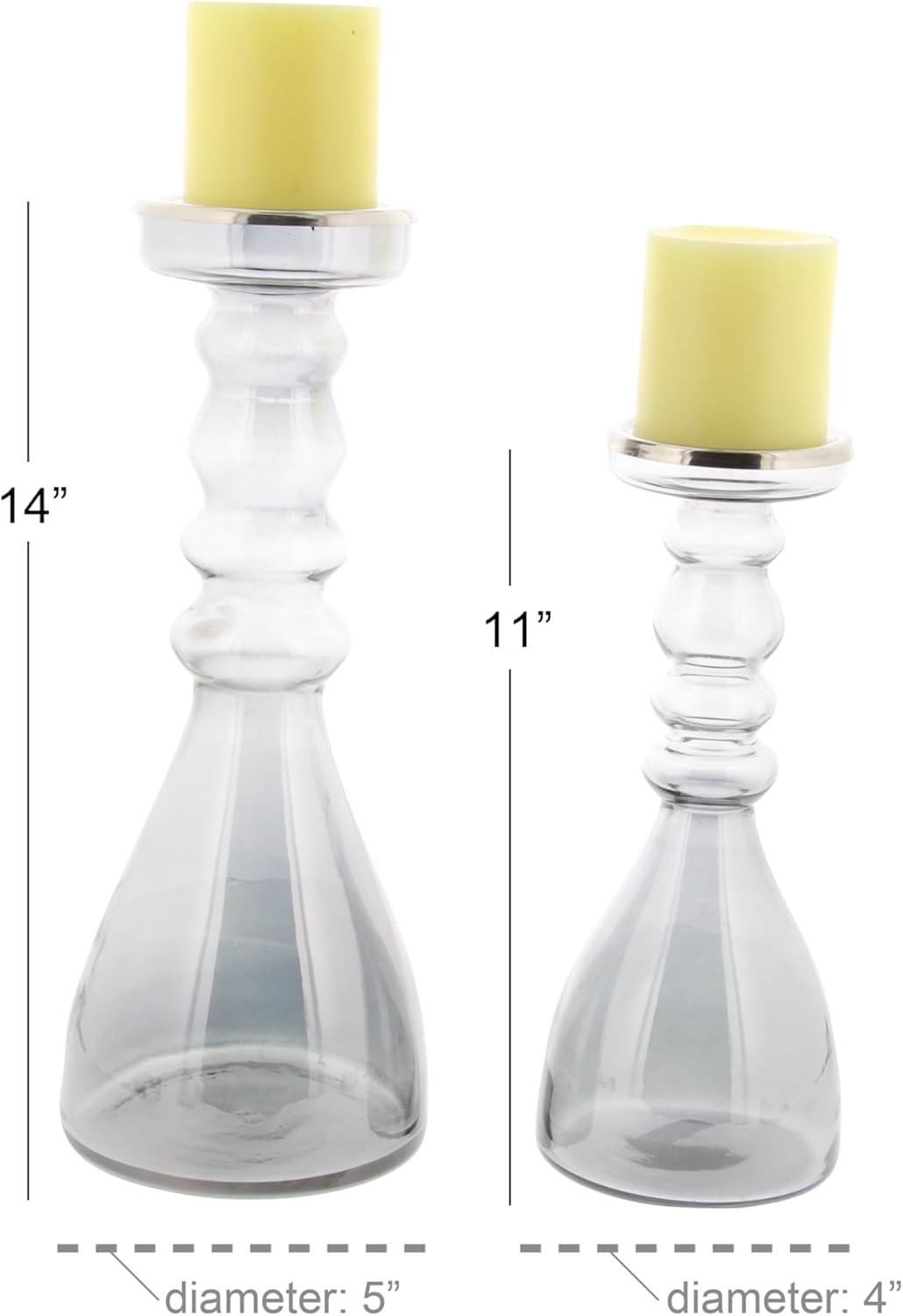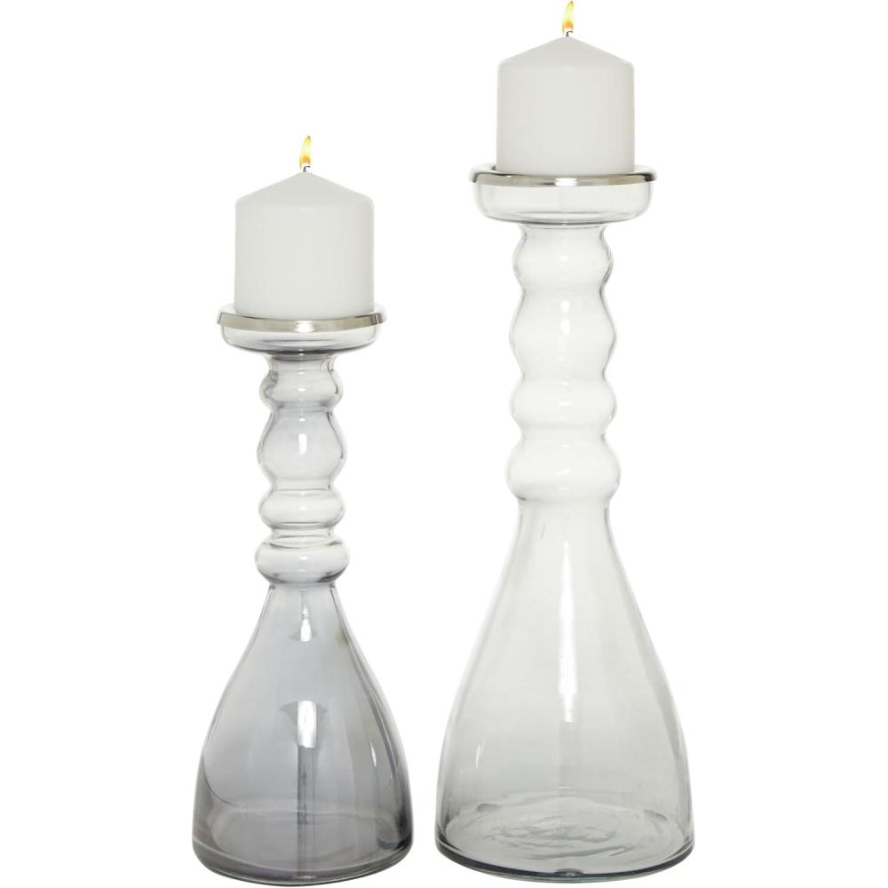 Delight your guests and make any occasion extra special by adding a lighted or flameless candle to this lantern. Give your space a radiant illumination with these beautifully crafted candle holders. Place these ornate candlesticks in the fireplace for decoration, on a kitchen table, or anywhere around the home for that warm feeling. Designed with felt or rubber stoppers at the base that prevent scratching furniture and table tops, as well as sliding around. Can hold 2 pillar candles, not included. This item ships in 1 carton. Glass candle holder makes a great gift for any occasion. Due to the handmade nature of this item, no two will be alike, there will be slight differences in shape, size, and color. Suitable for indoor use only. This item ships fully assembled in one piece. Made in India. This gray colored candle stand comes as a set of 2. Contemporary style.